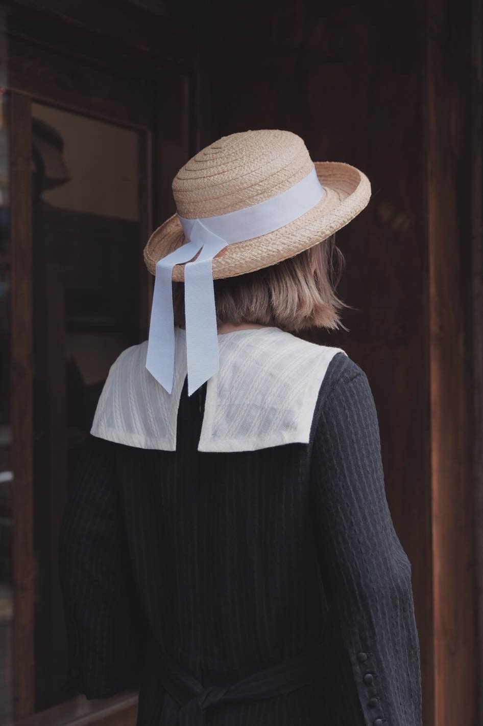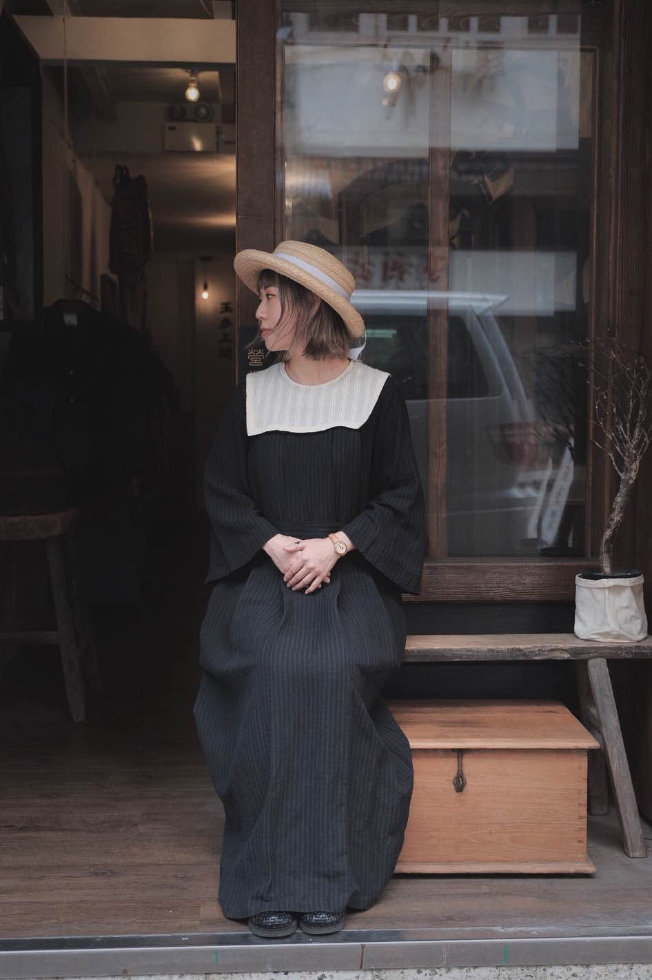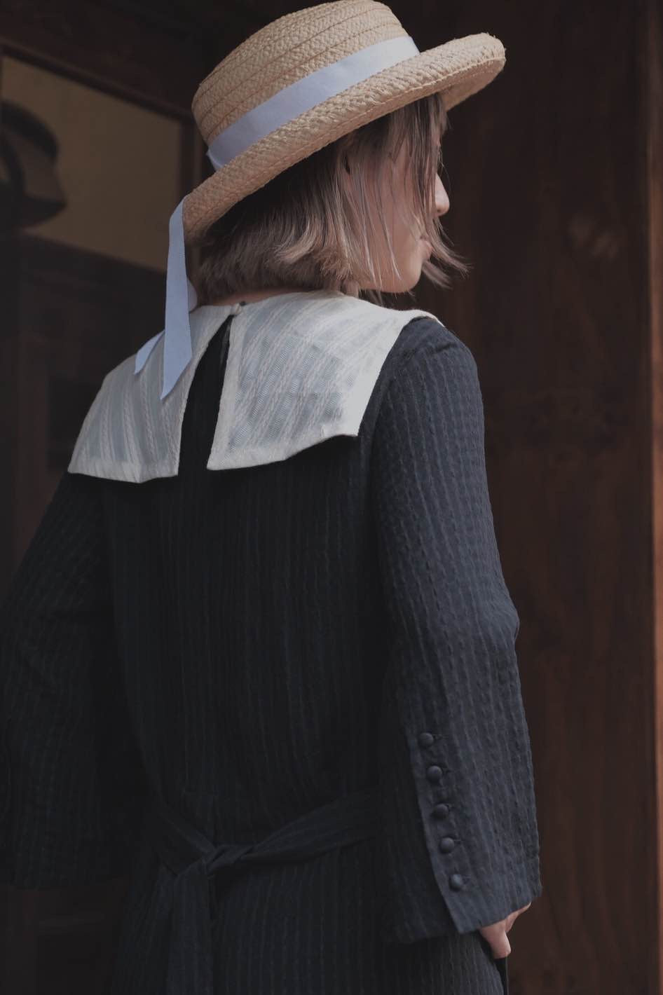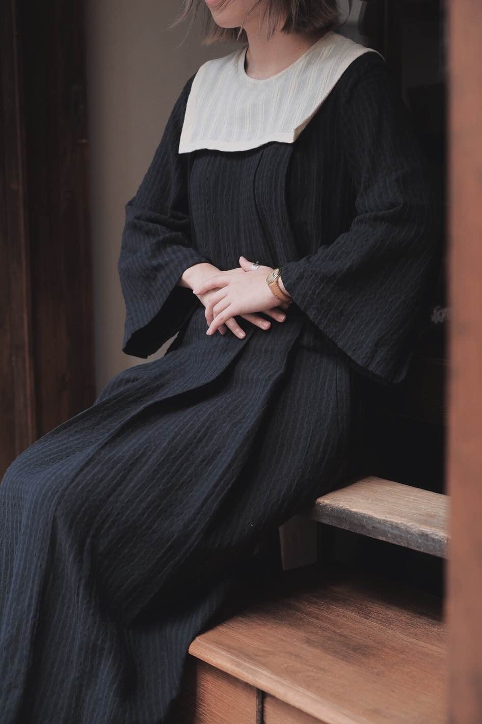 前後色織麻領片,增加立體感,肩破袖包扣袖口,前片左右硬摺仿馬面裙效果。