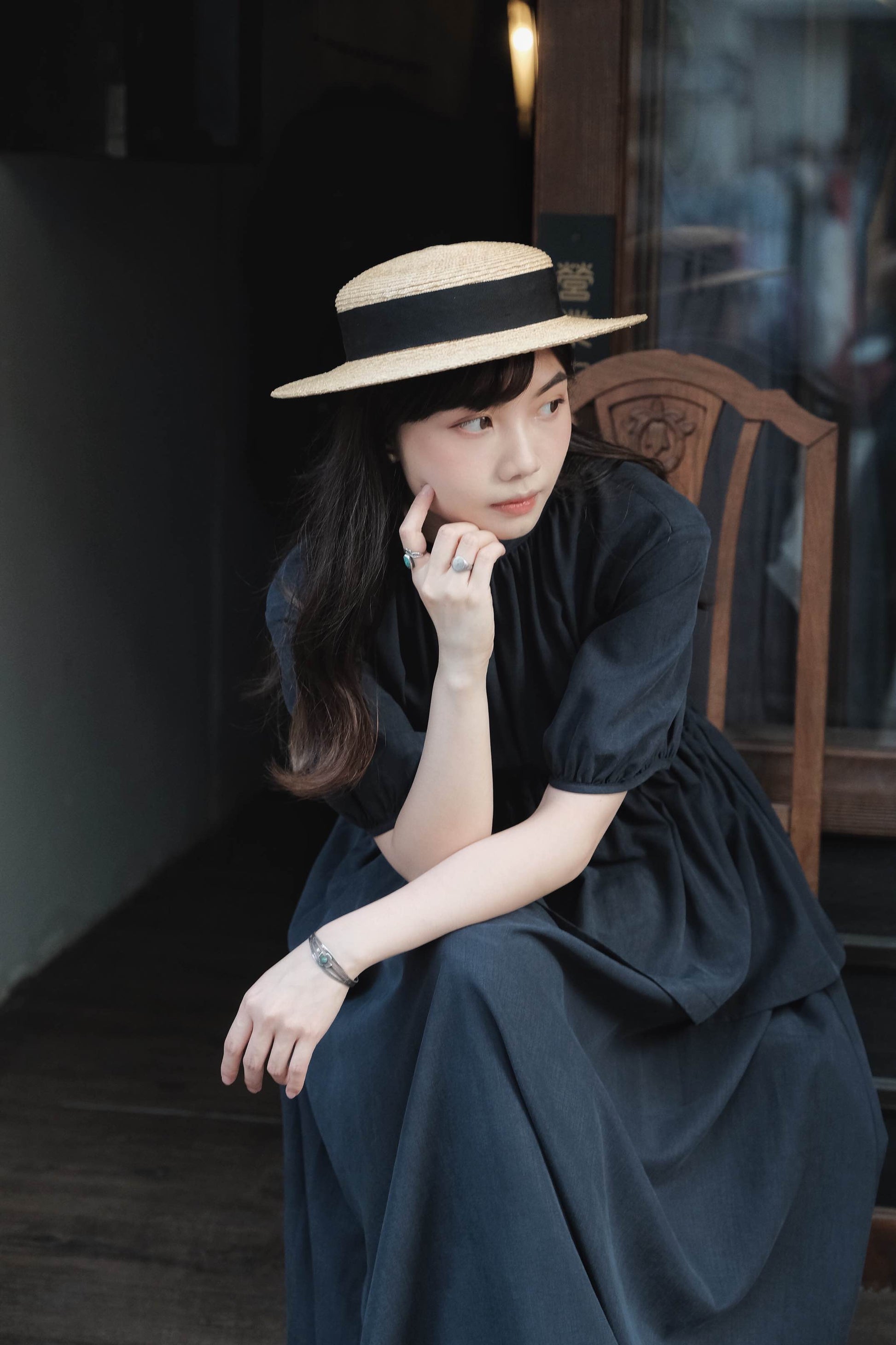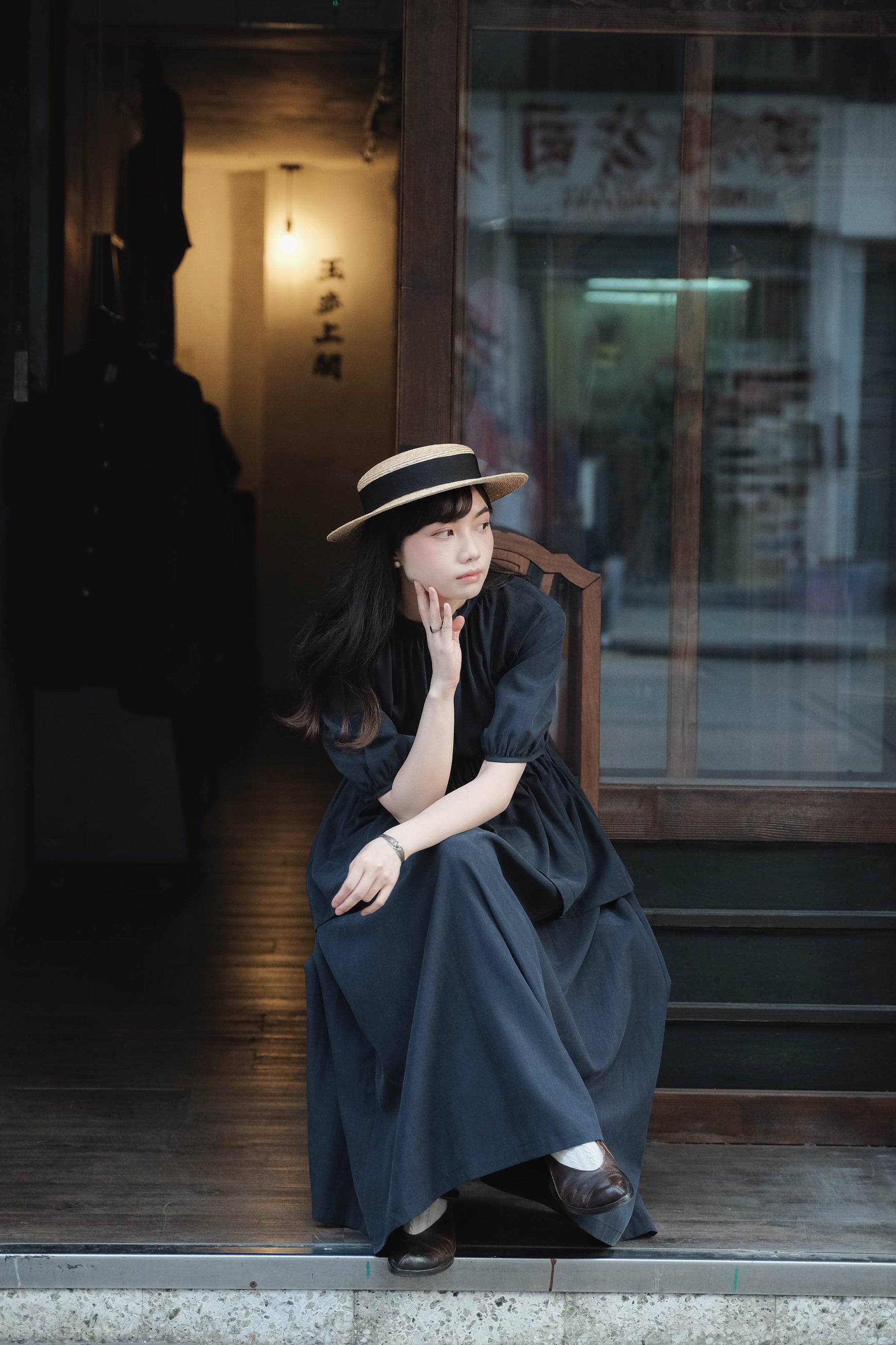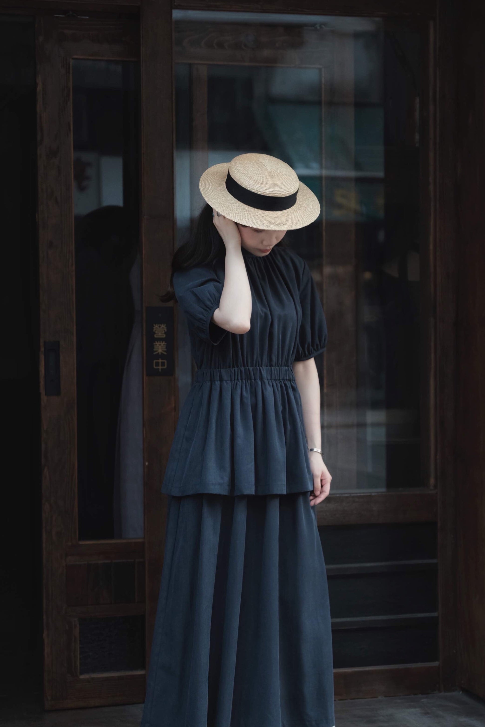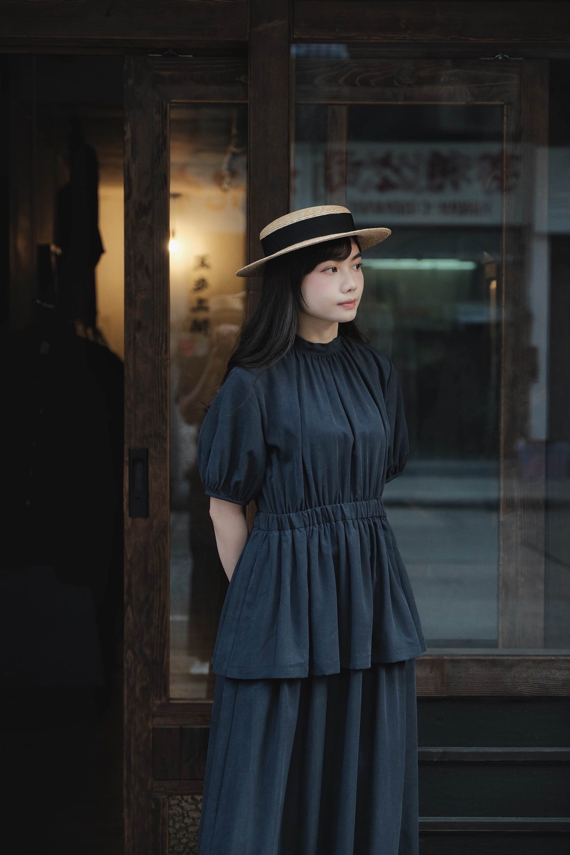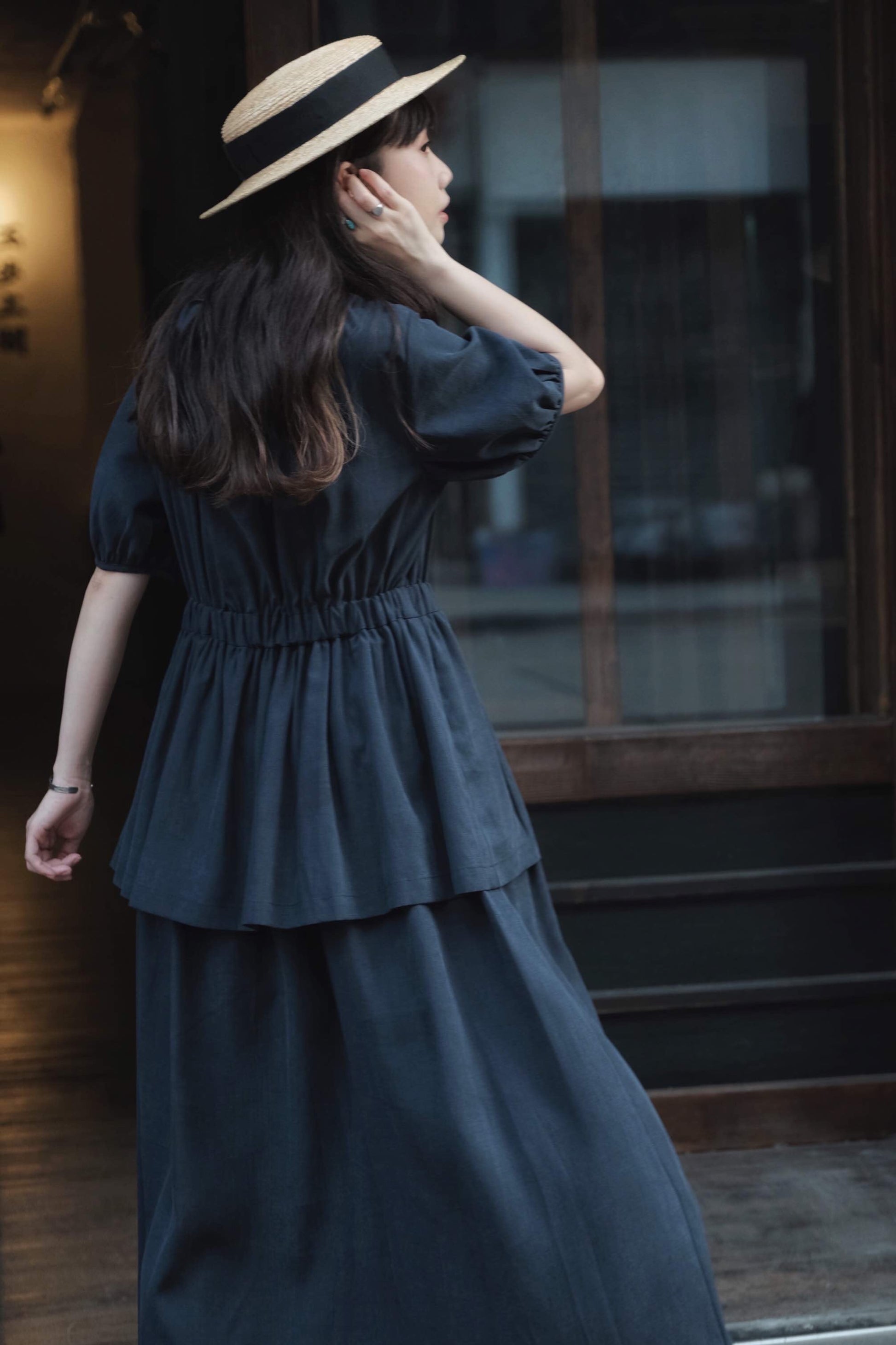 天絲麻深藍短泡袖洋服