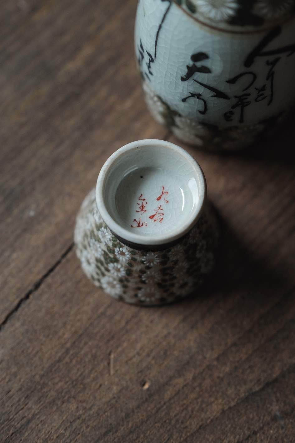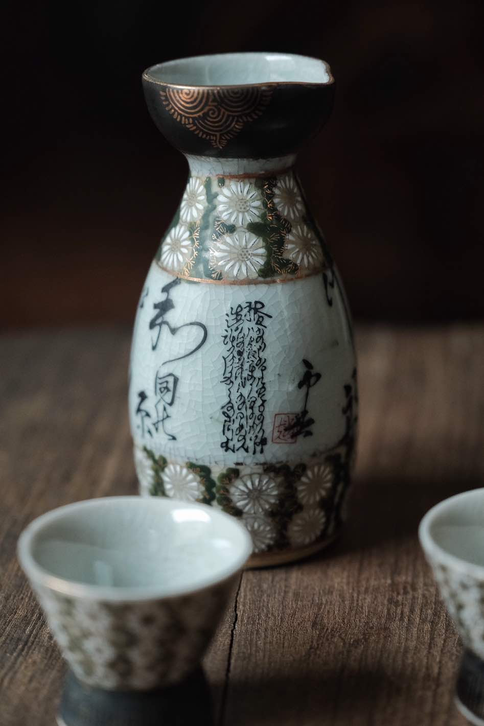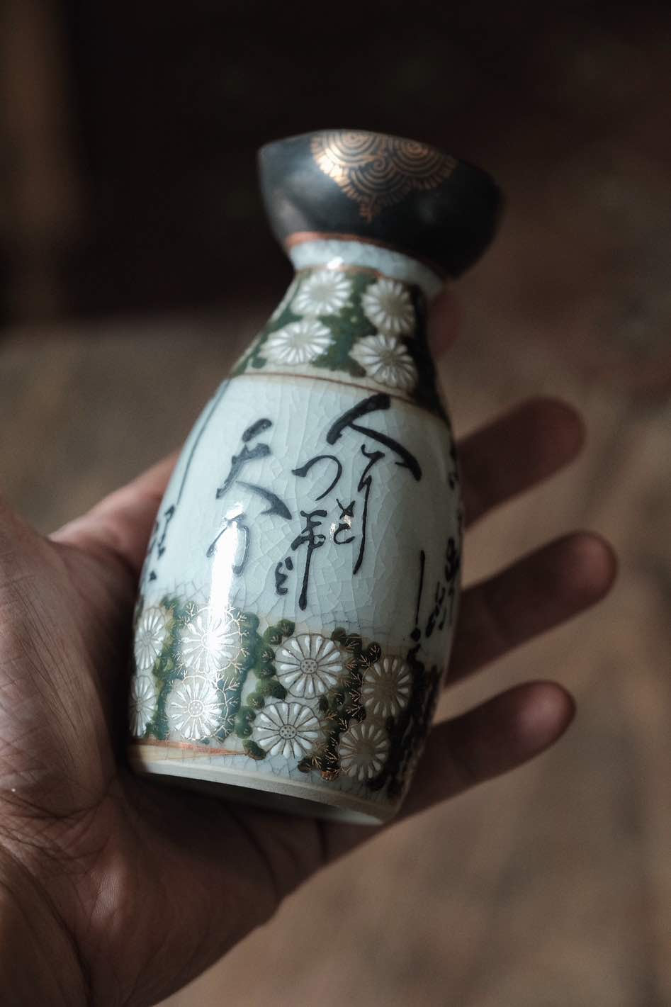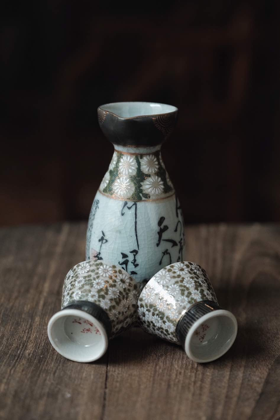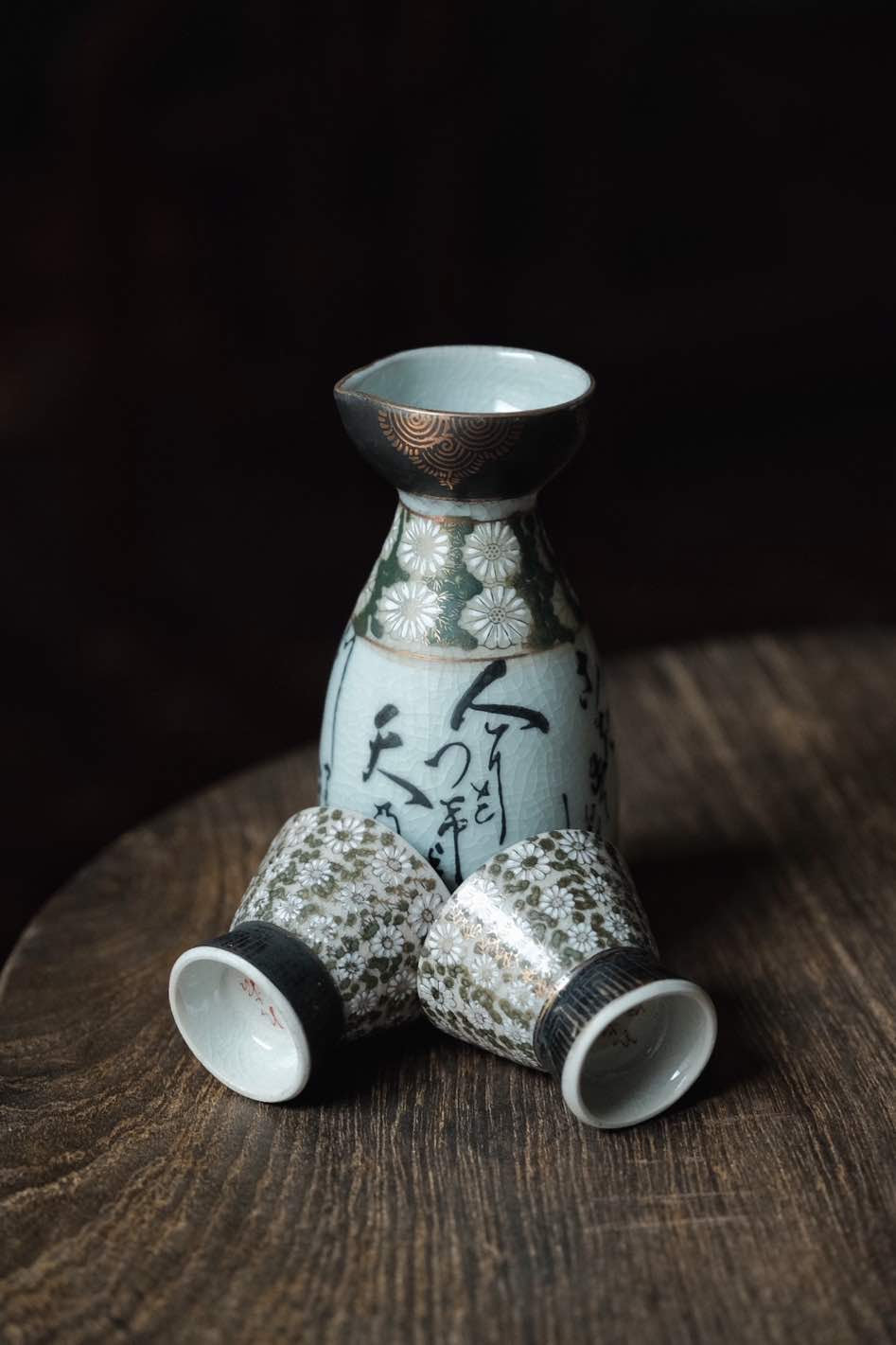 (少有黑色間金)日本製·日本九谷燒手寫詩文黑間花清酒杯連酒瓶