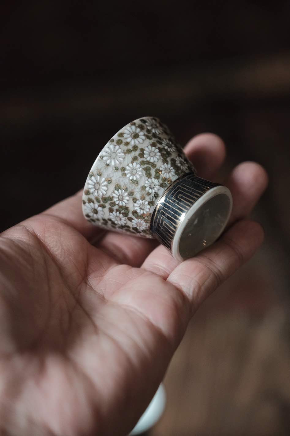 少有大字手寫詩文,黑描金間花,冰裂開片明顯,手點花有立體感,杯花黑繪的勾花