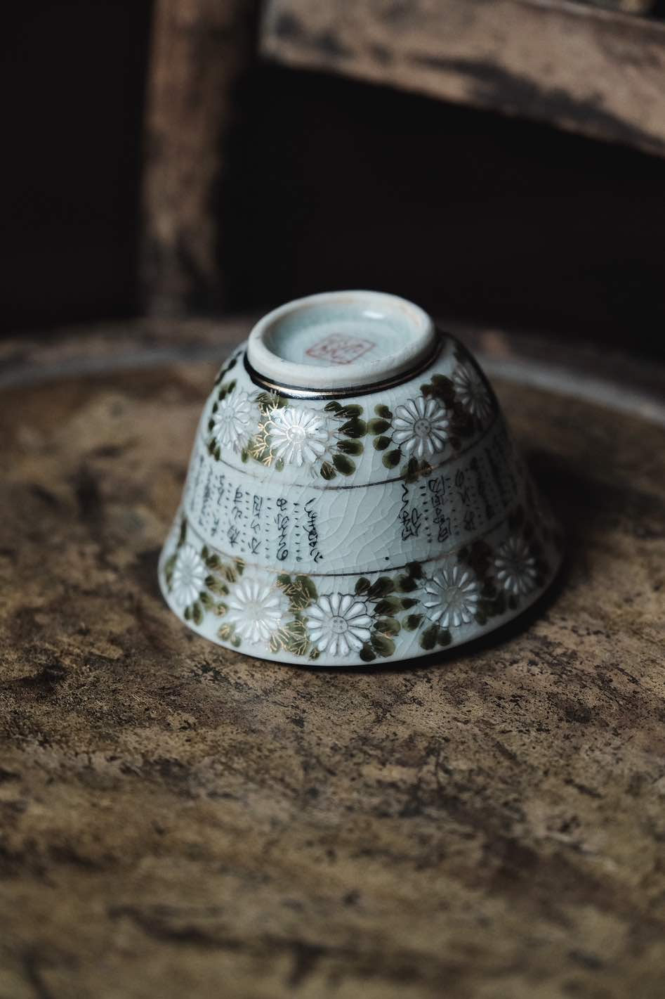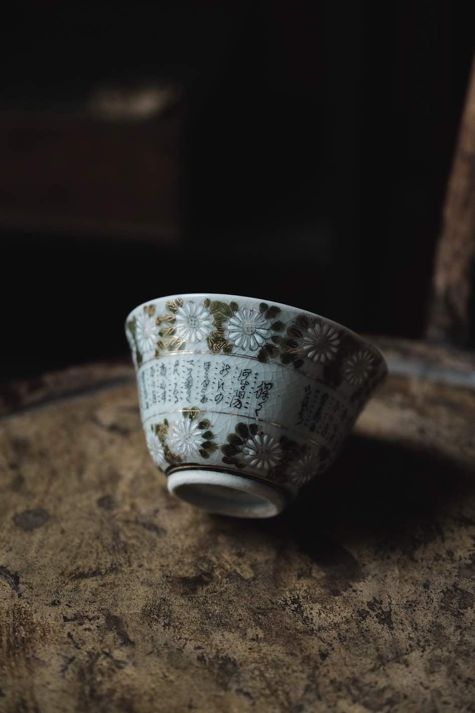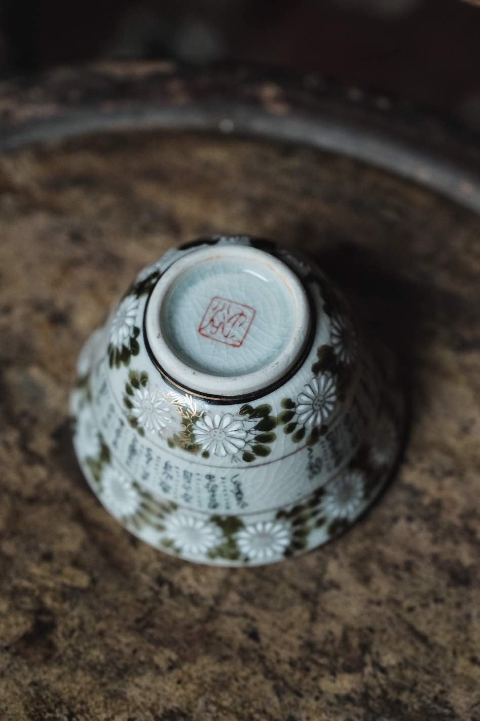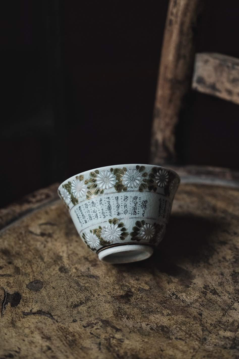 日本九谷燒手繪詩文金調百花不落地茶杯(90ml)