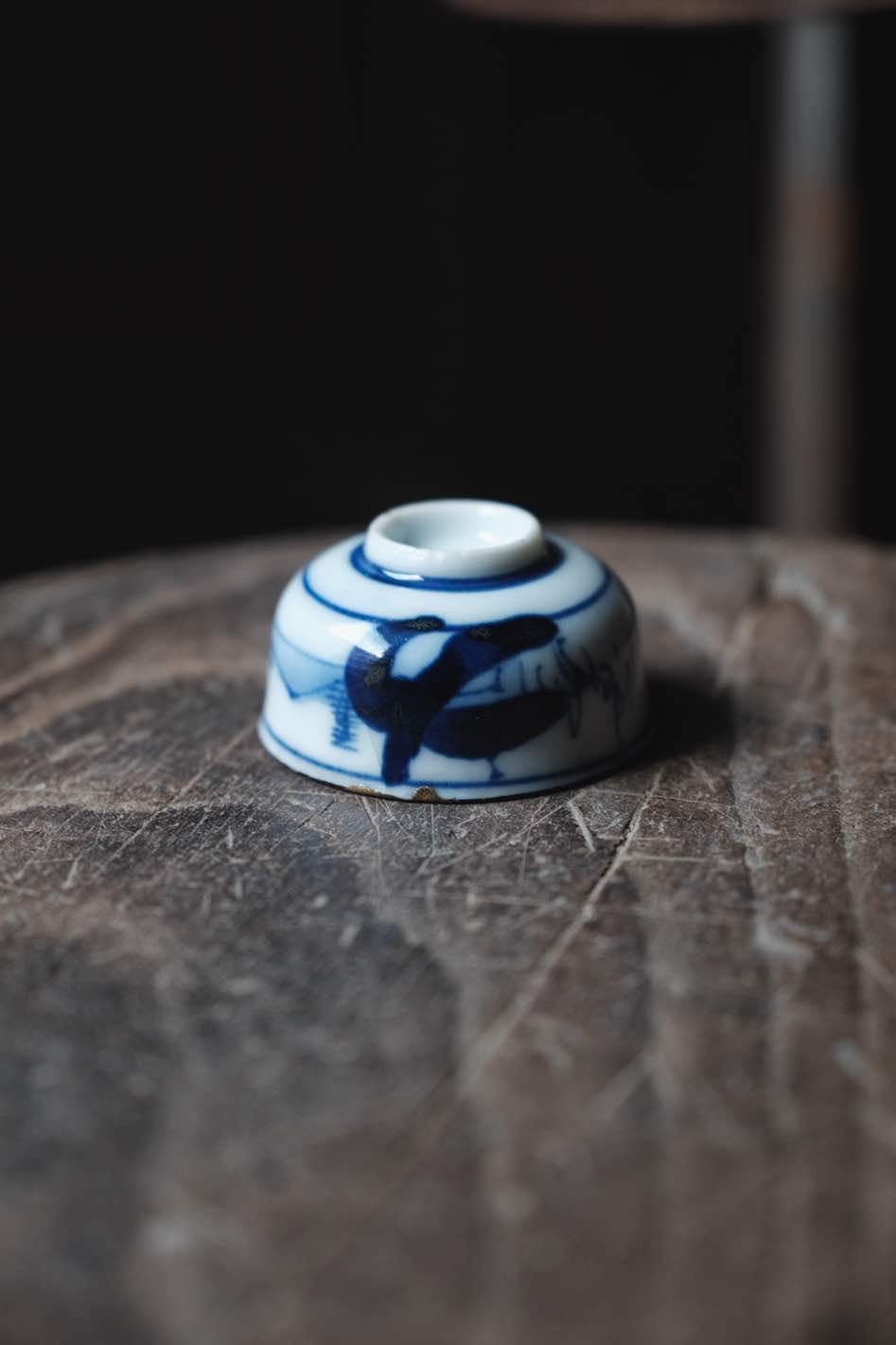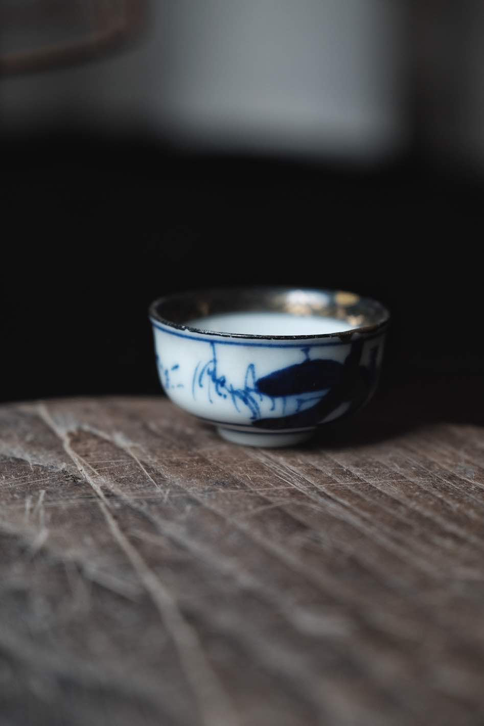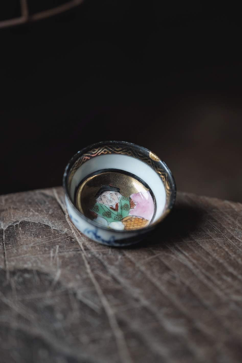 內繪福神有金繼痕跡,外青花付 ,杯邊描金