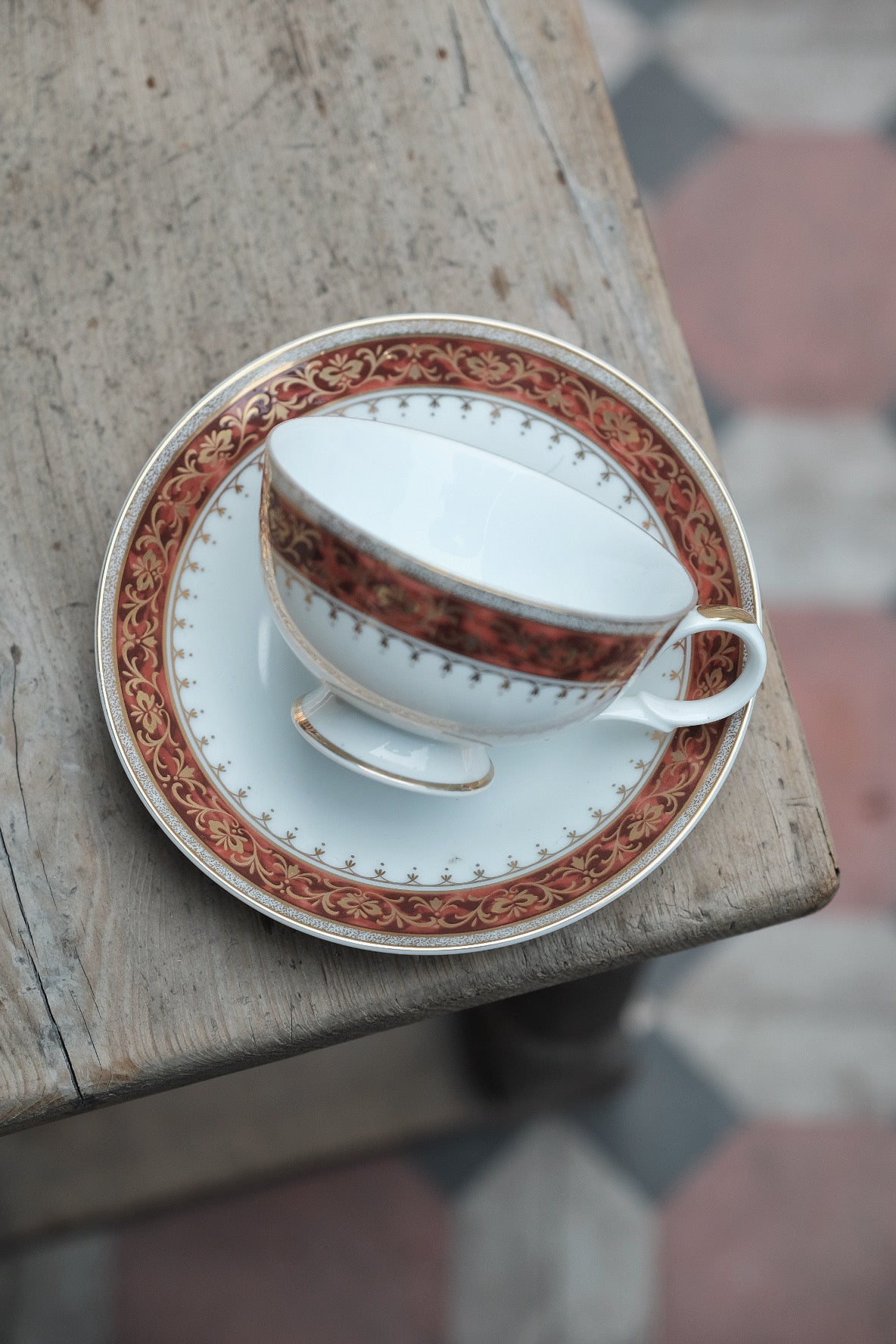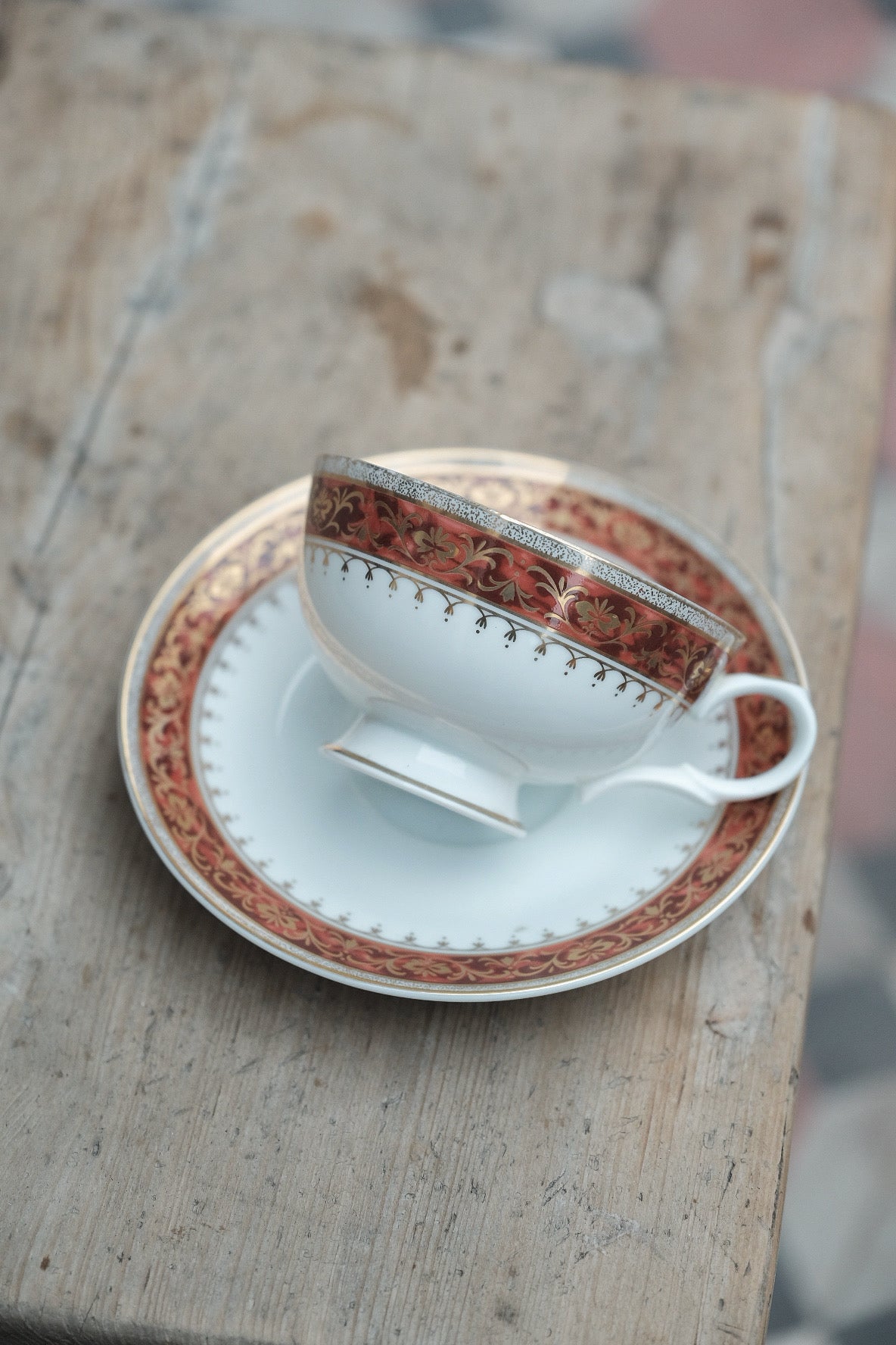 紅底金花描金杯,骨瓷質感細膩,花色高雅