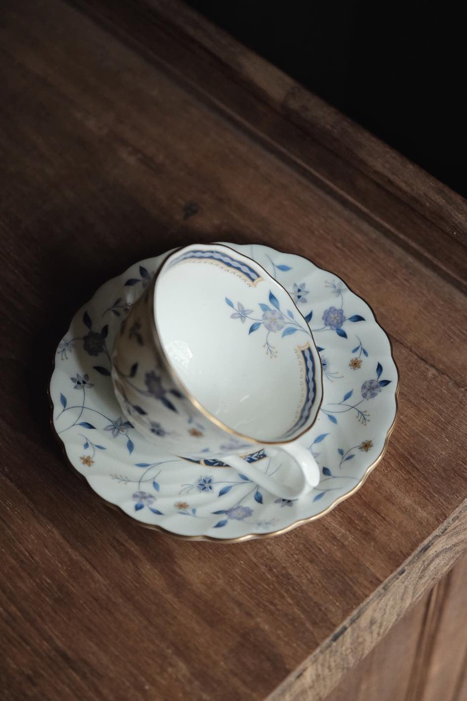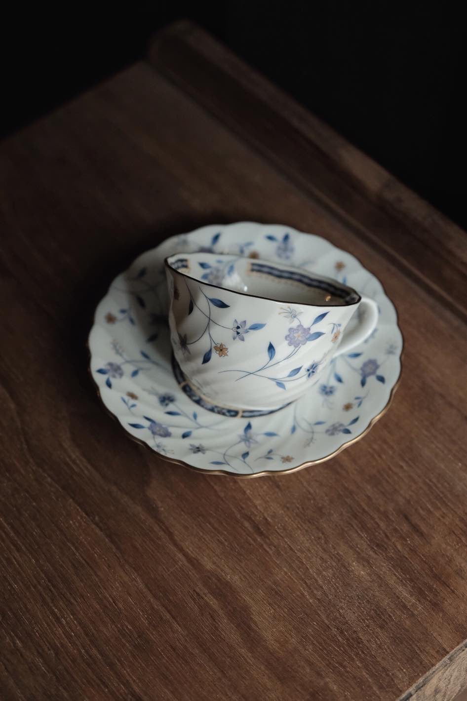 葵口旋轉杯型,有內繪花,藍調花形淨雕描金,青花圖案立體生動,整體感和諧值得擁有