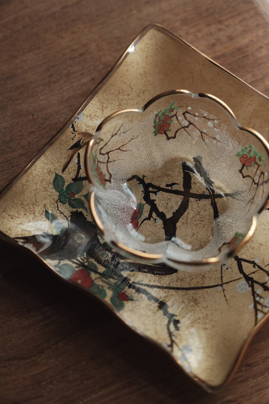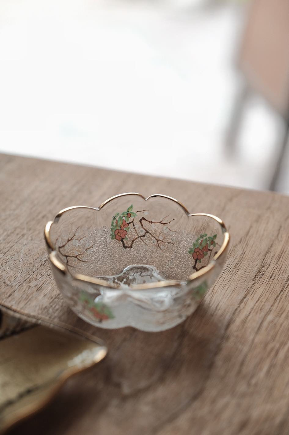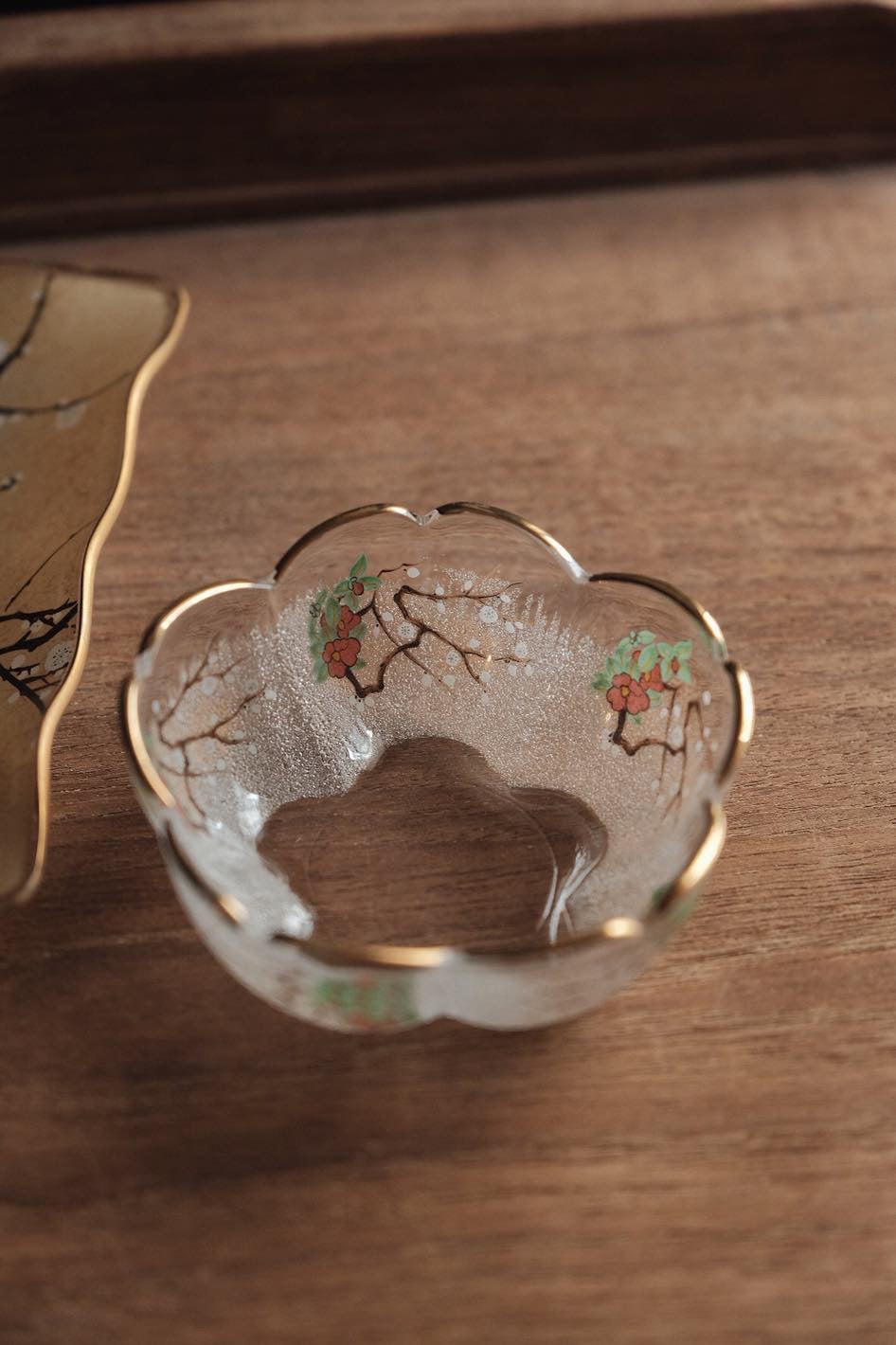 經典梅花光琳繪圖案,小巧精緻梅花型小缽,玻璃更做出雪點的磨砂感,從立意到形狀都非常有心思,陽光下閃閃發光。