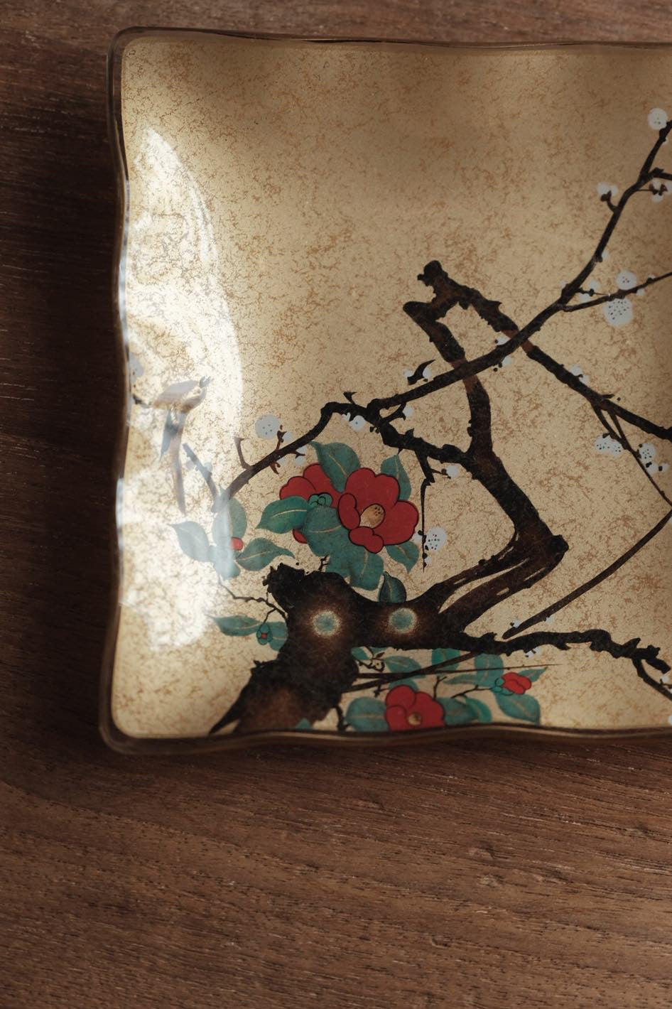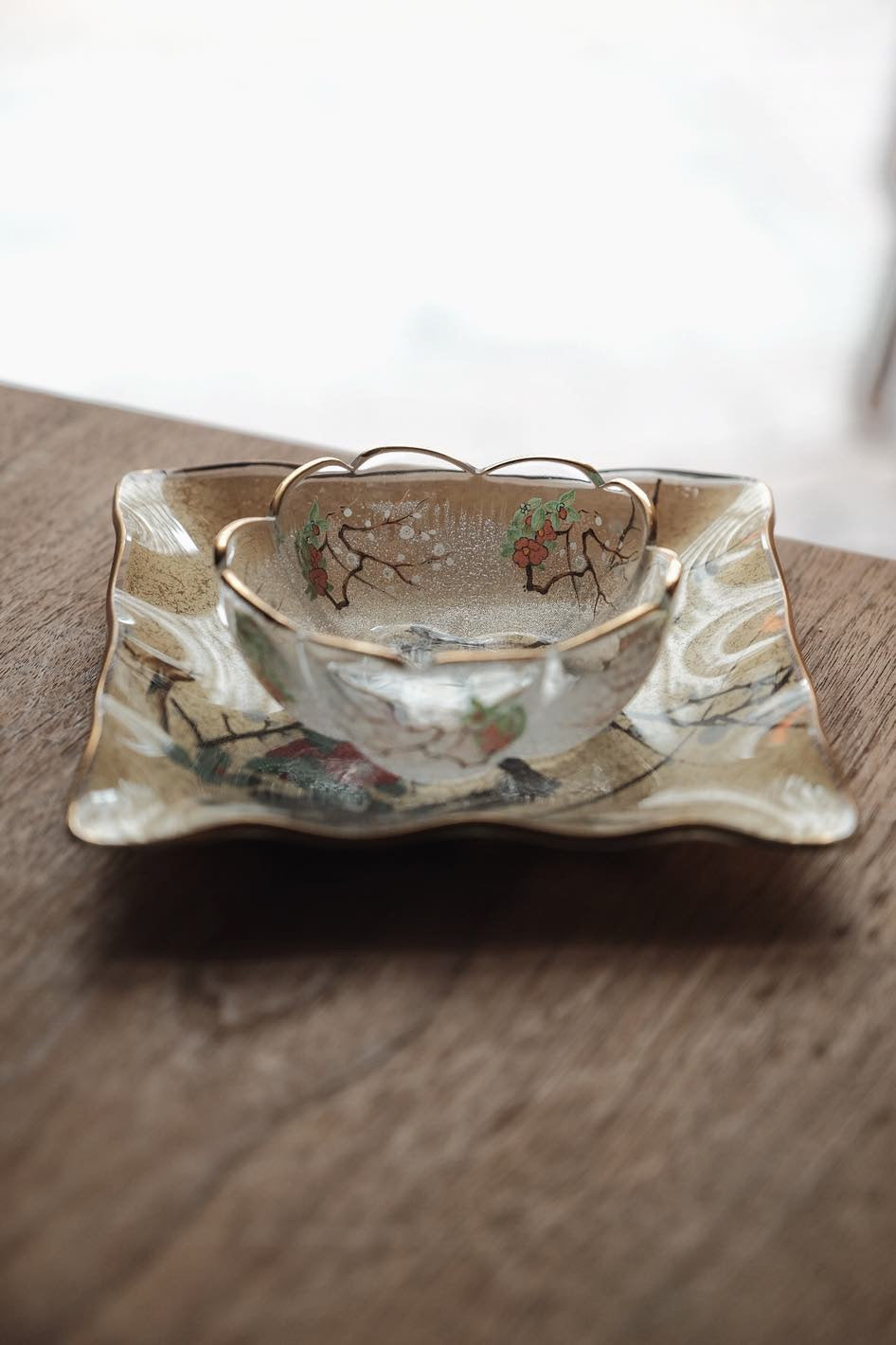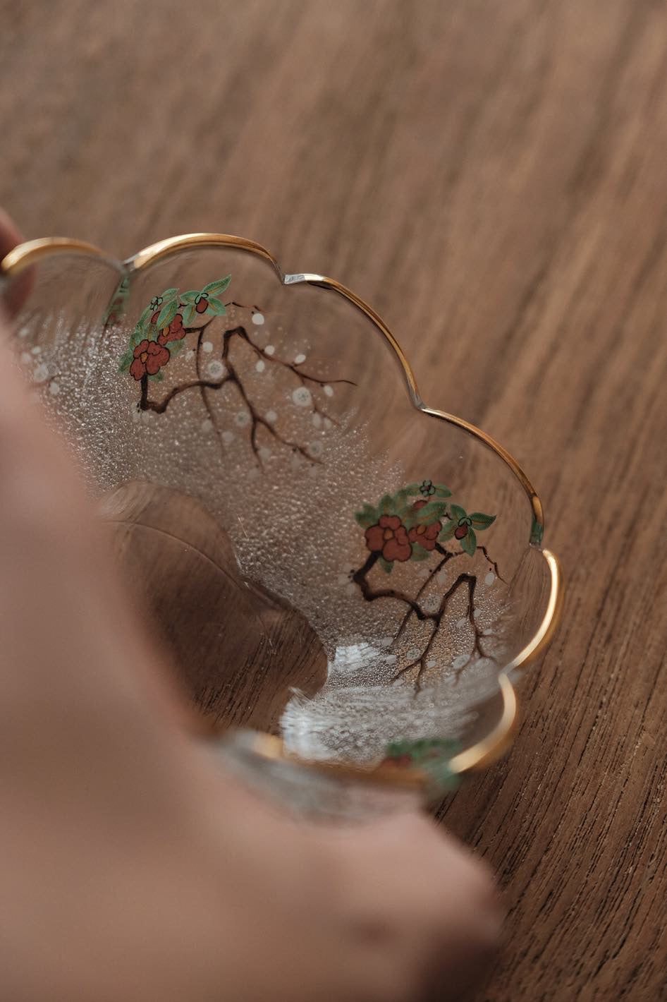 經典梅花光琳繪圖案,小巧精緻梅花型小缽,玻璃更做出雪點的磨砂感,從立意到形狀都非常有心思,陽光下閃閃發光。