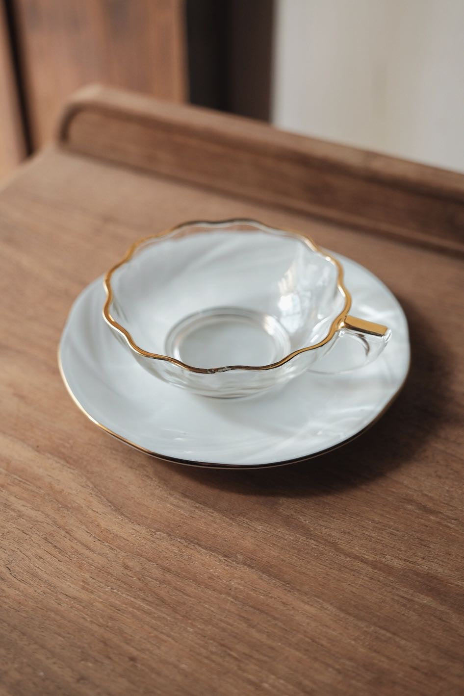 杯柄位一體成形非常特別,底杯身闊杯有助花茶味更易散發,花型描金,配底碟旋轉素白。