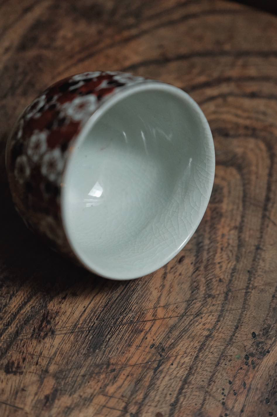 百花不落地傳統樣式,白紅梅花,足繪紅紋,外内里冰裂開片。