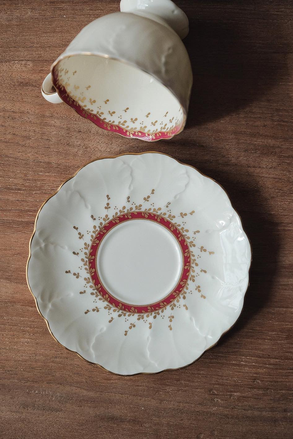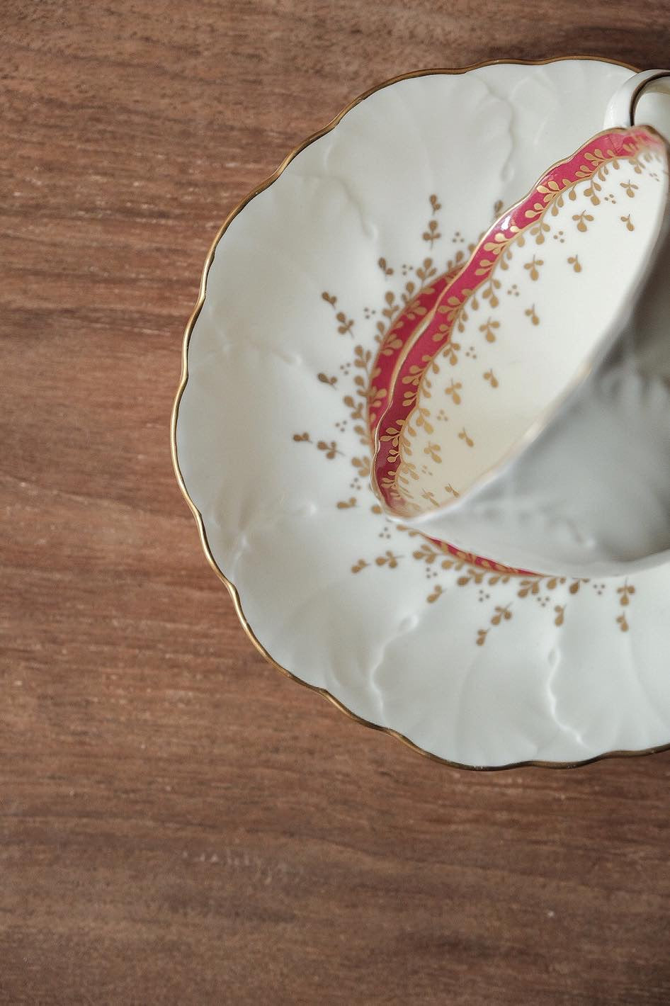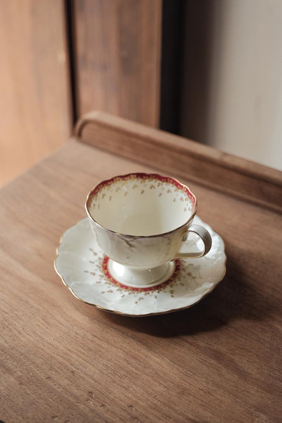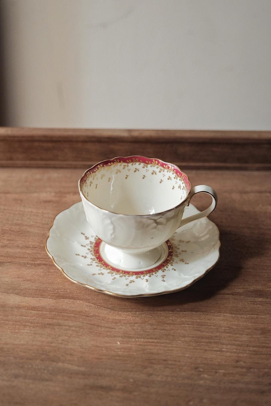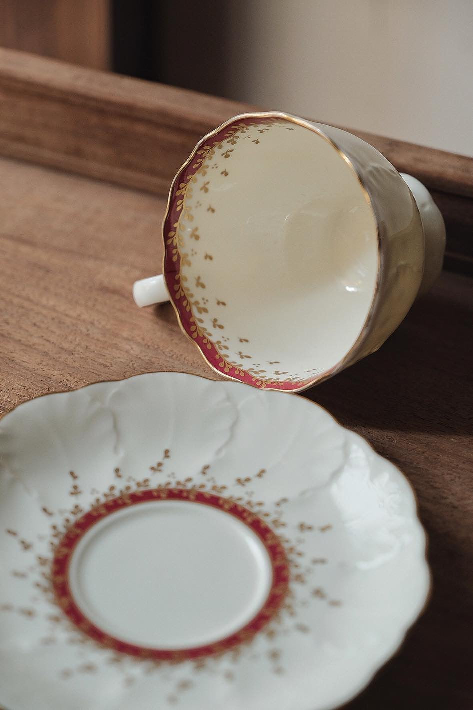日本製•嗚海Narumi浮雕骨瓷酒紅描金花高足紅茶杯