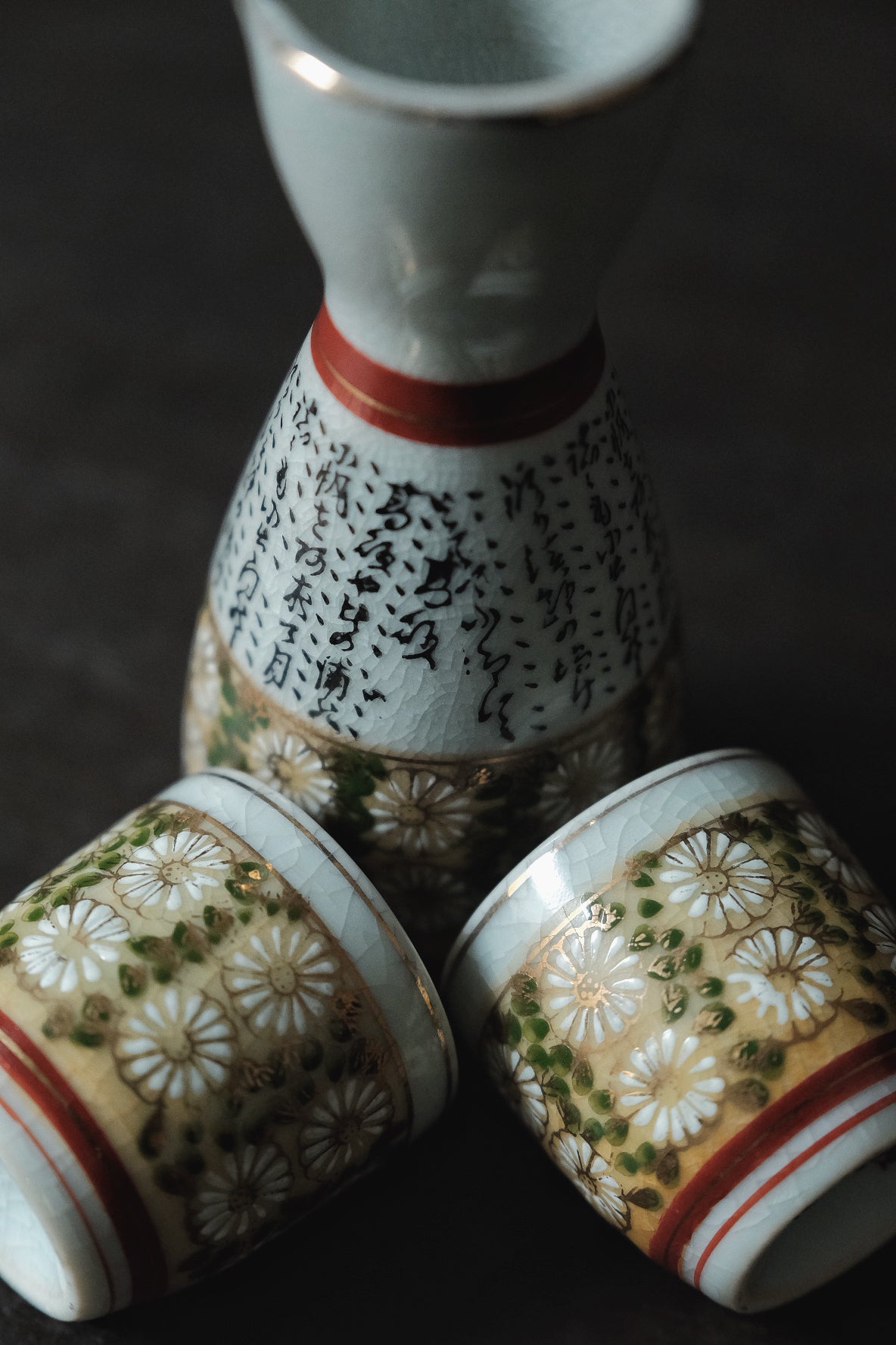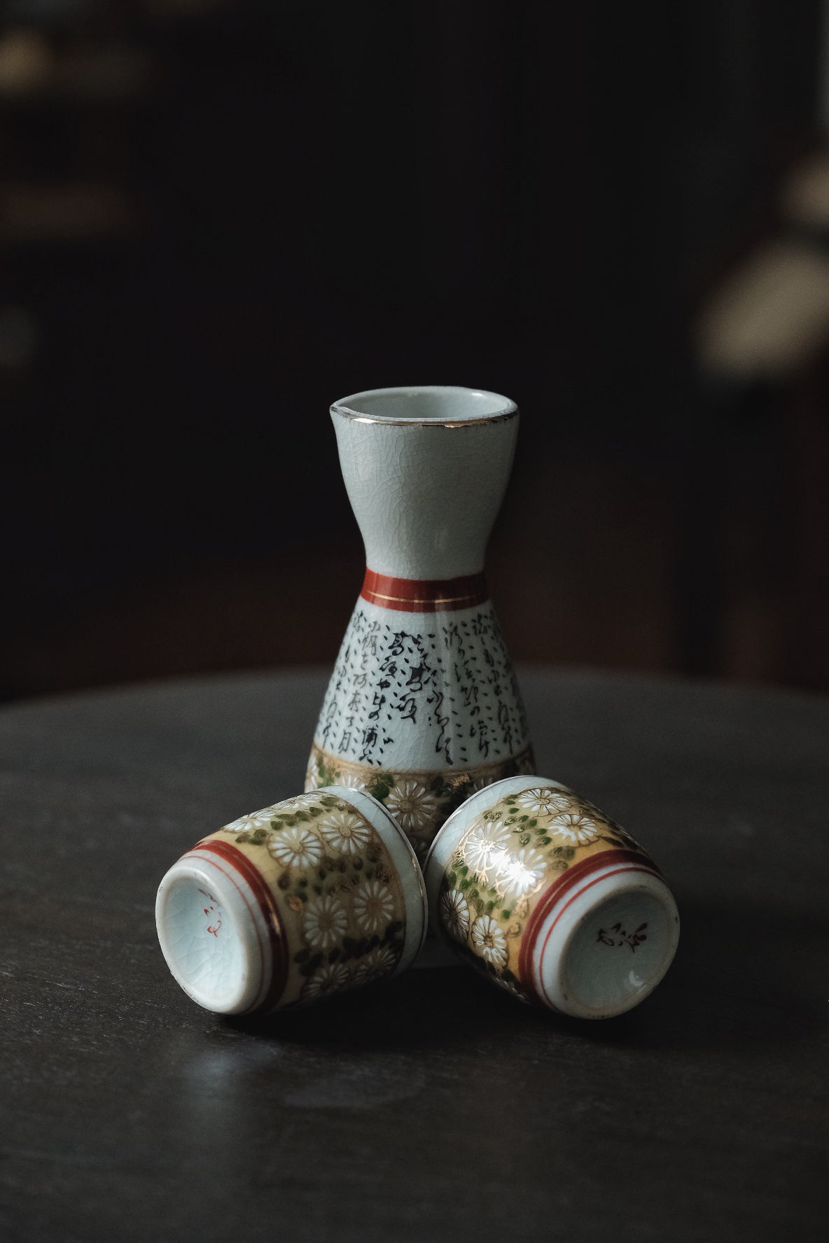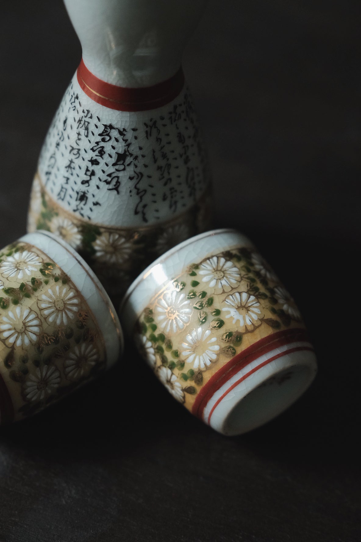 日本製·日本九谷燒手寫詩文赤繪點白花清酒杯連酒瓶