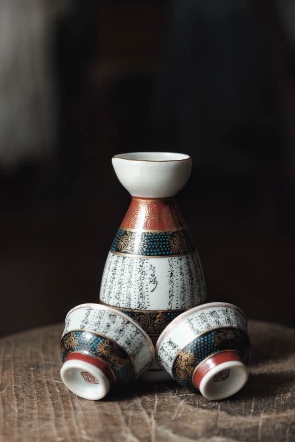 日本製·日本九谷燒手寫詩文點青間花清酒杯連酒瓶