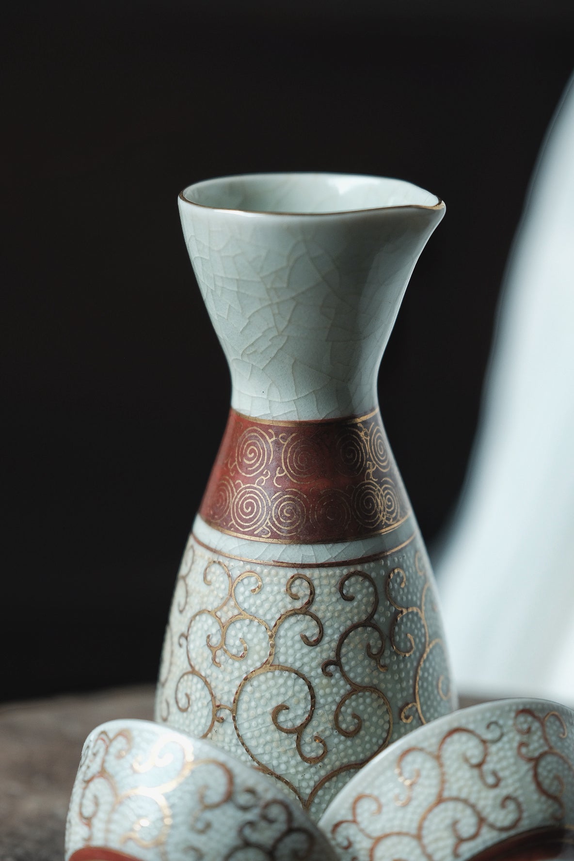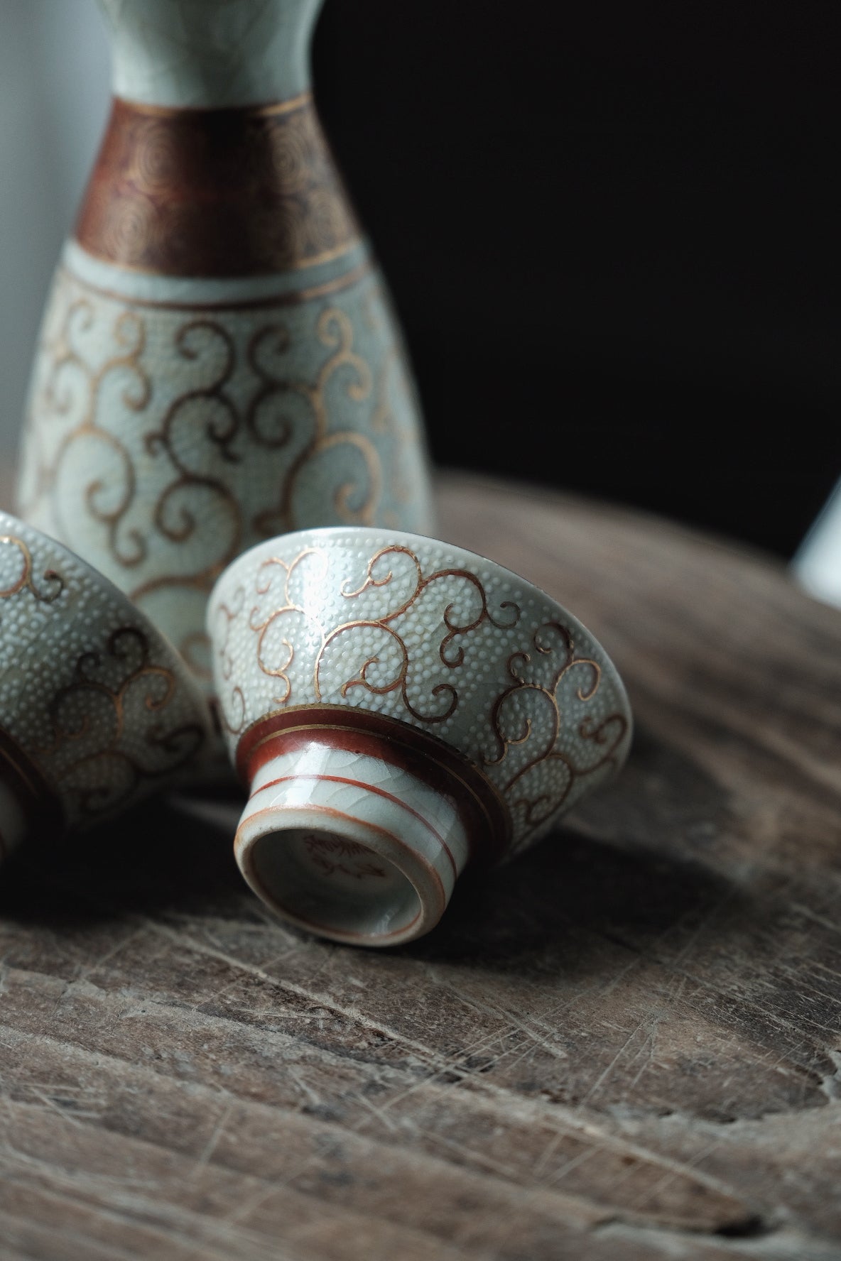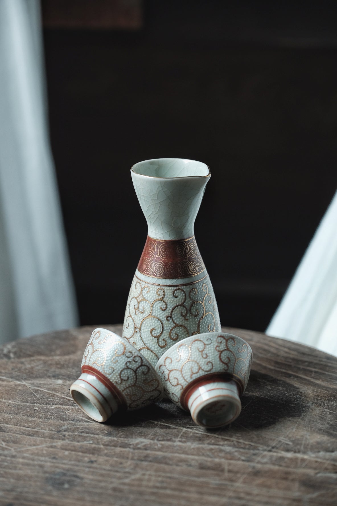 日本製·日本九谷燒點花赤繪清酒杯連酒瓶