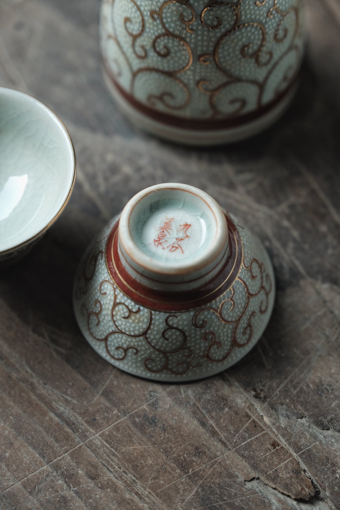 赤繪描金間花,冰裂開片明顯,手點花有立體感,杯花白繪的勾花