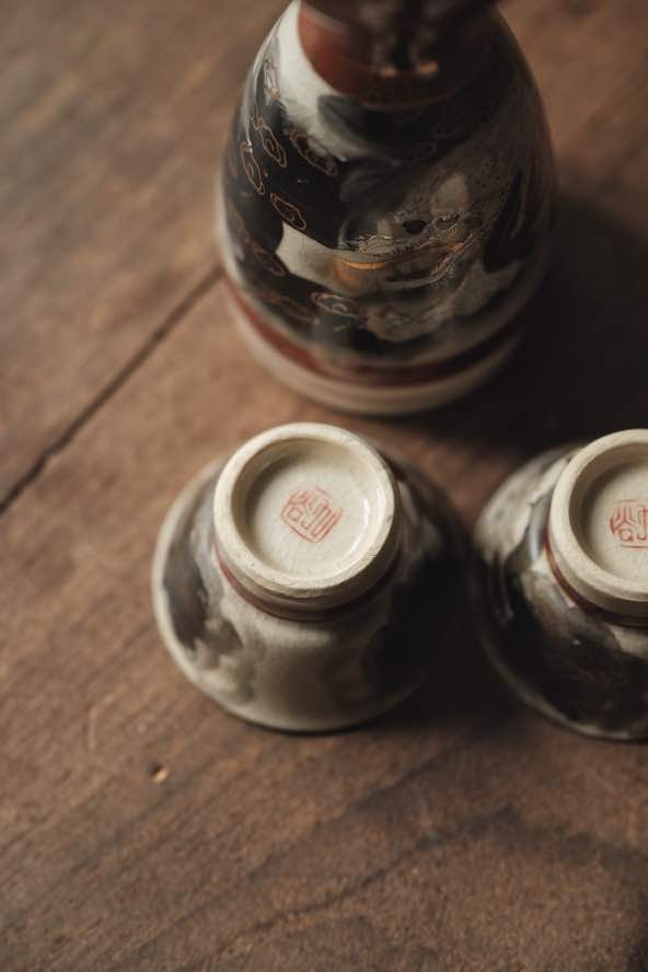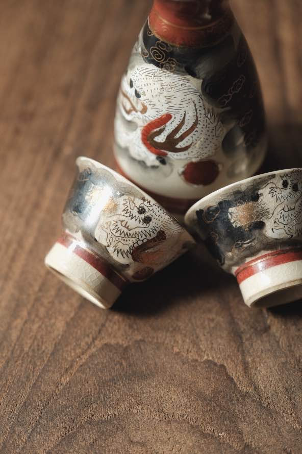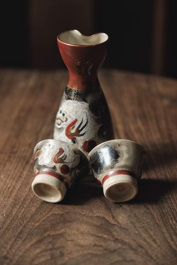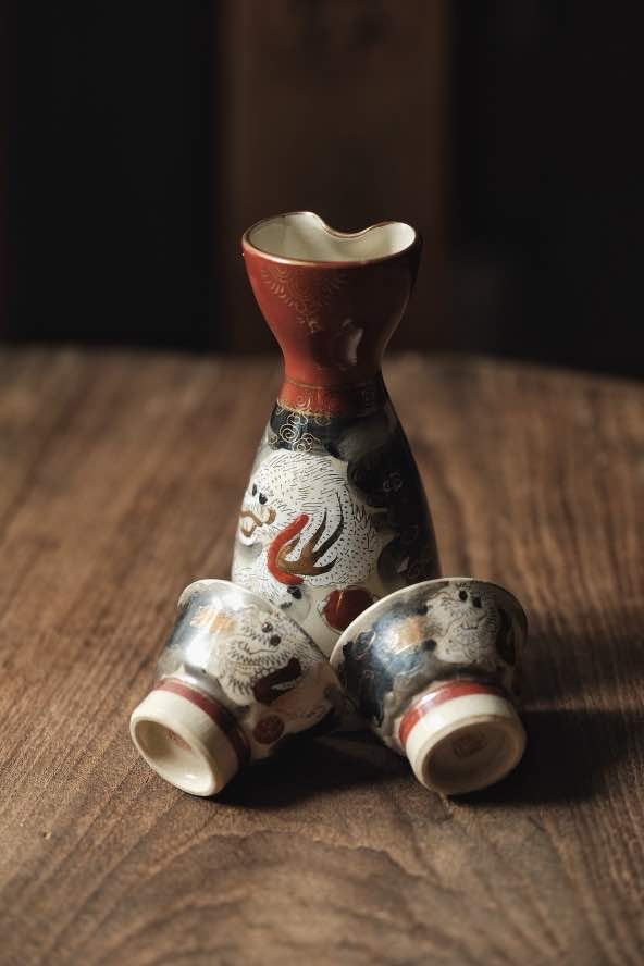 日本製·日本九谷燒龍畫片赤繪清酒杯連酒瓶