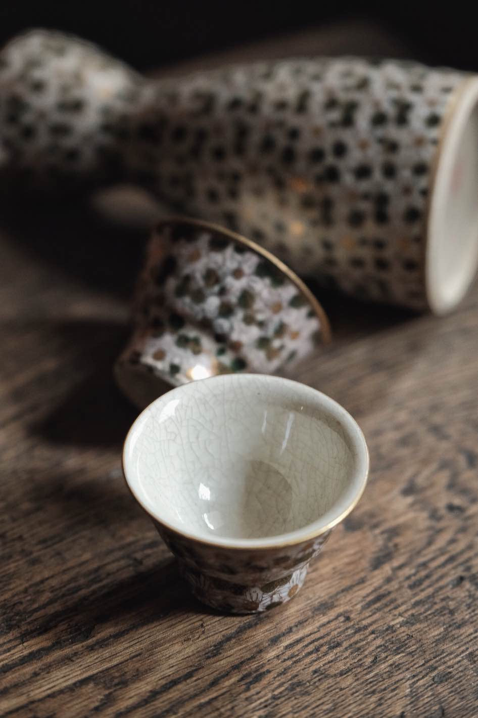 滿工花,全面點花圖,描金,酒杯足滿花,手點花有立體感,杯花點金,白粒點的勾花 ,外内里冰裂開片。