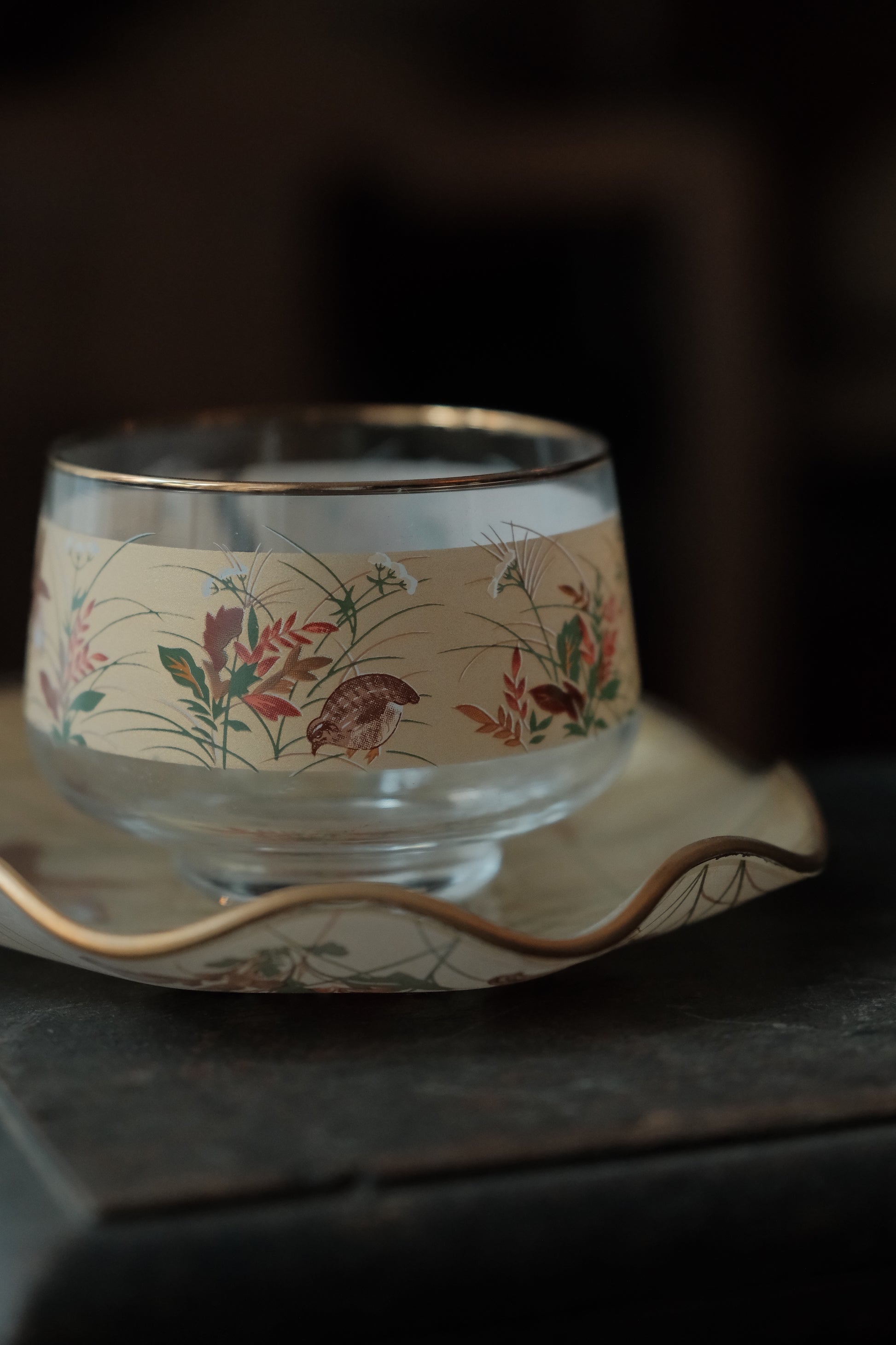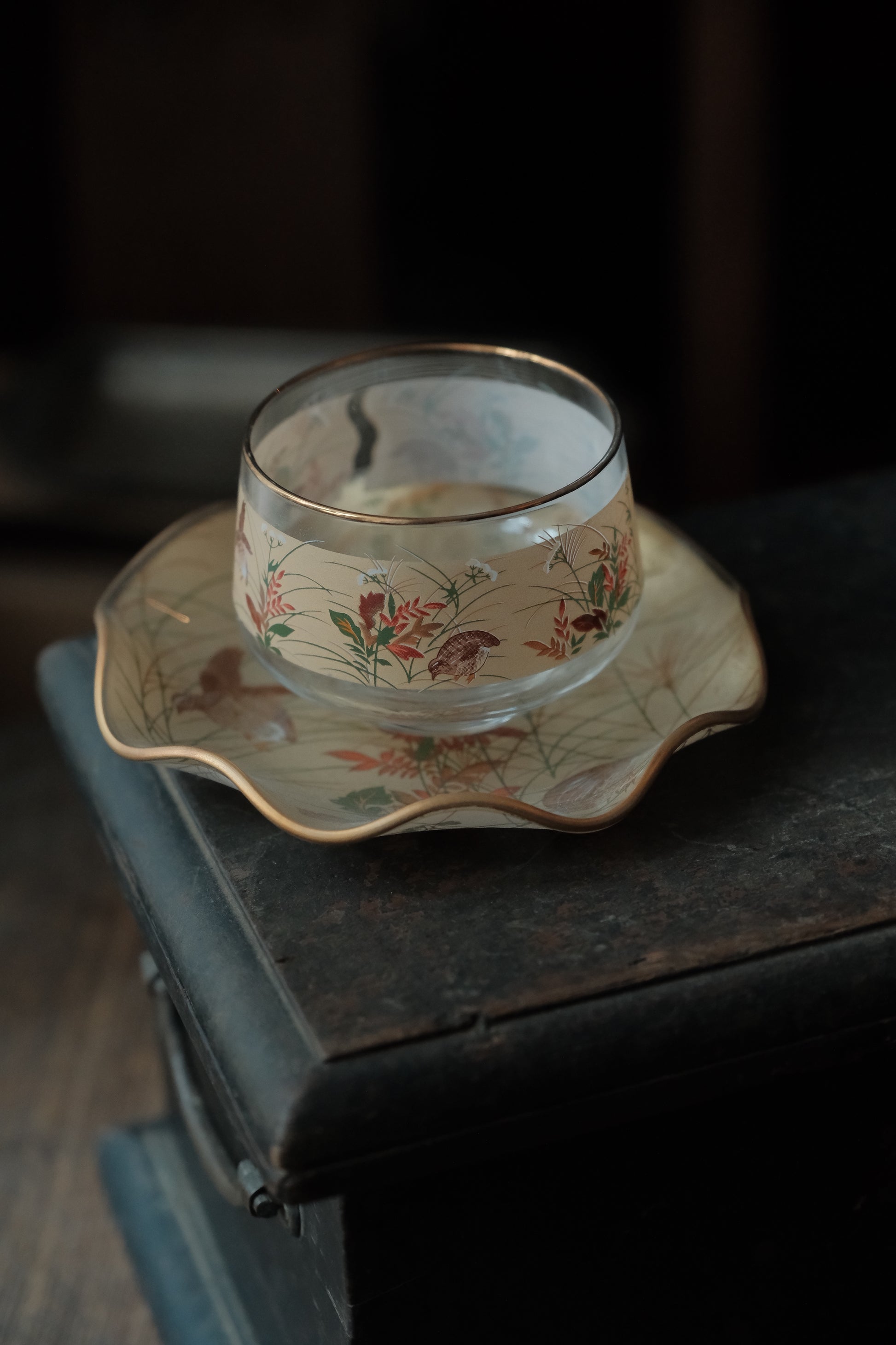 描金玻璃杯玻璃碟透光有質感,四季花鳥圖金箔底,