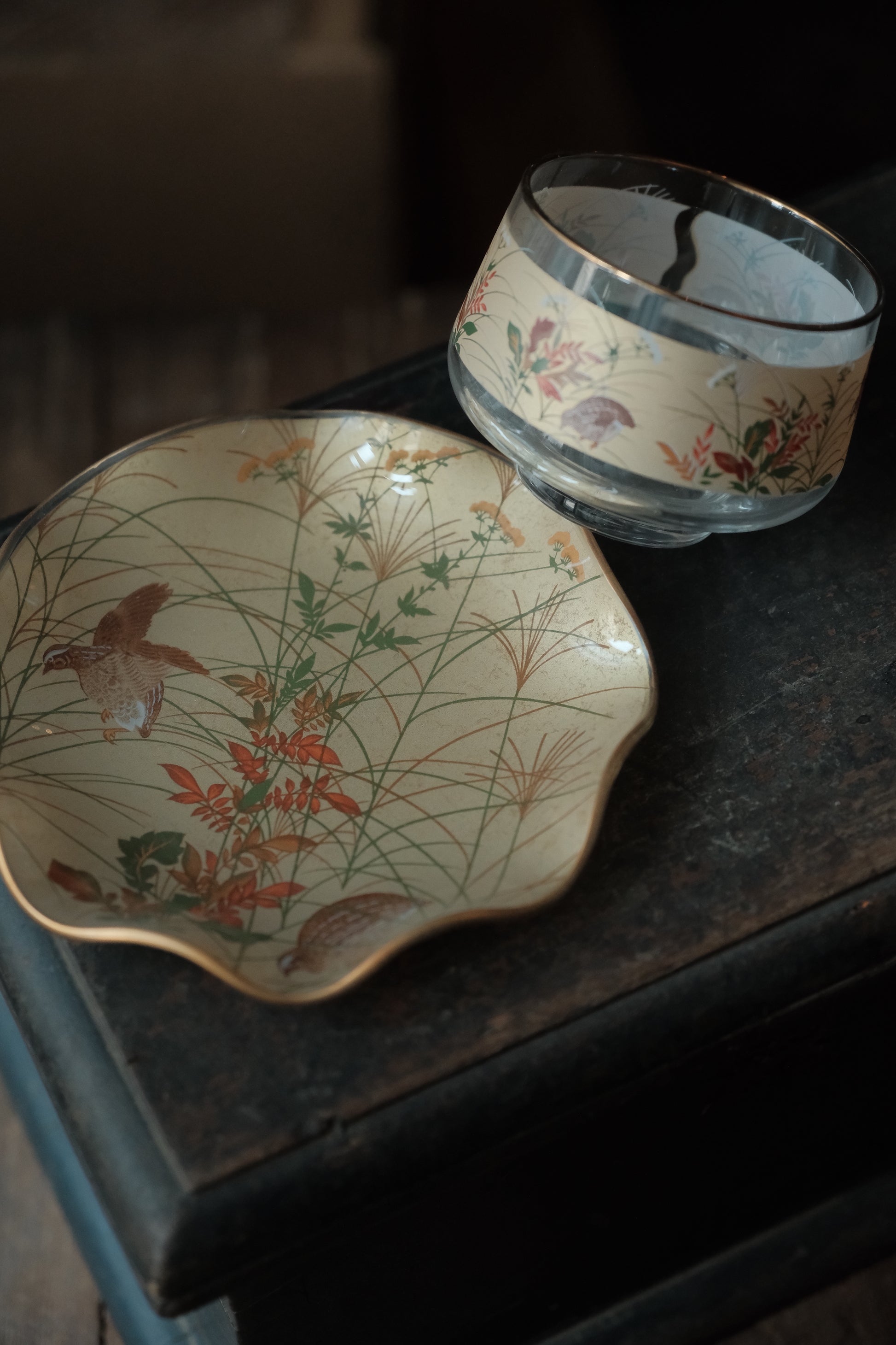 日本製•昭和光琳繪花鳥冷茶杯連碟