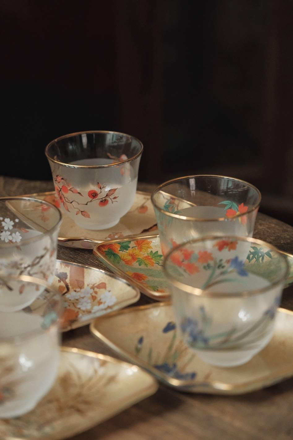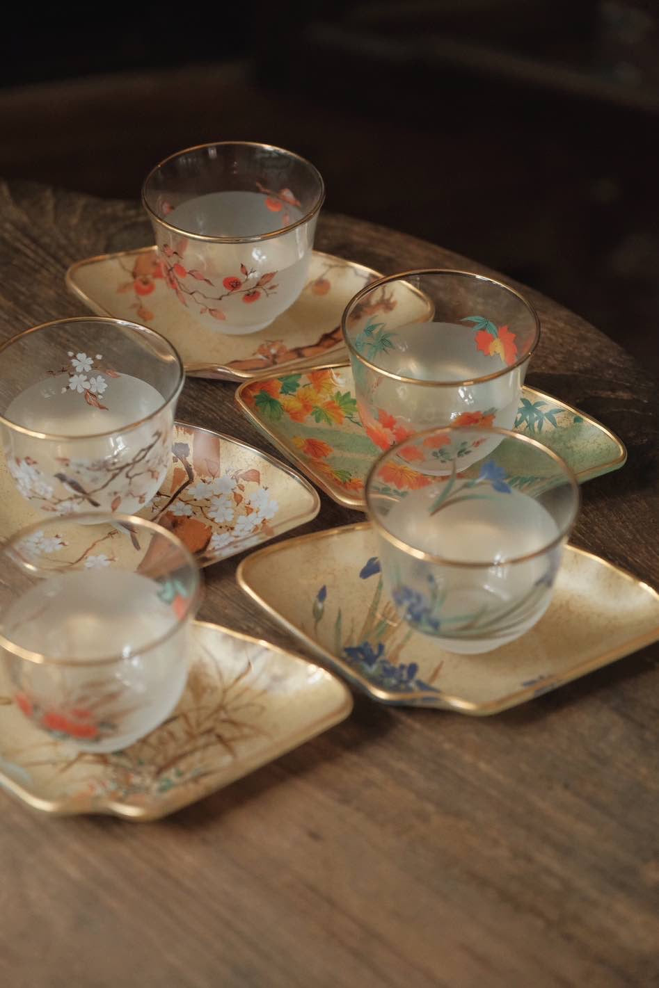 日本製•昭和光琳繪花鳥冷茶磨砂杯連扇碟(160ml)