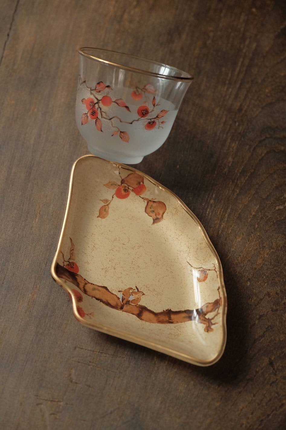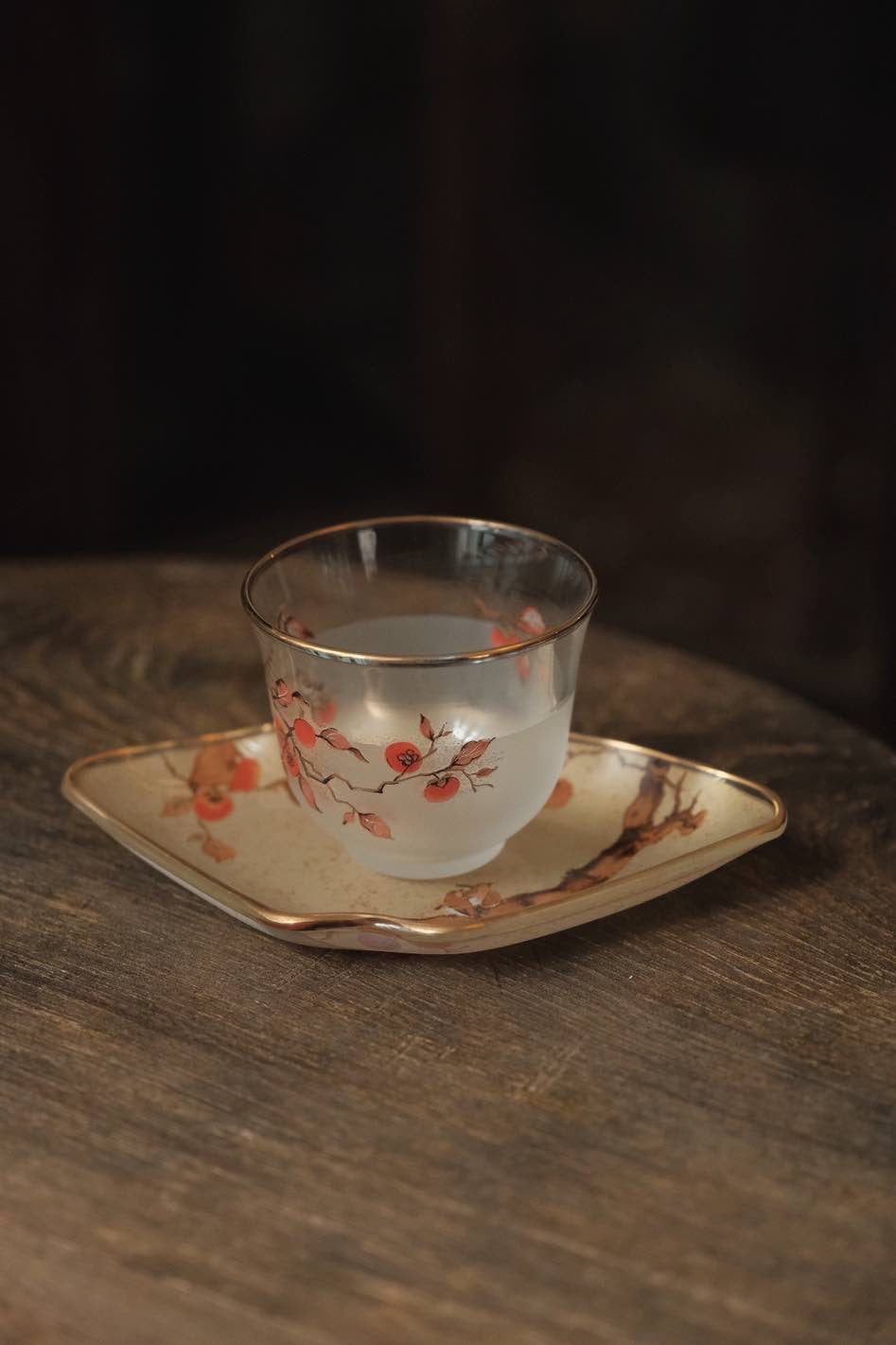 少有扇形碟配,描金磨砂玻璃杯玻璃碟透光有質感,花鳥圖金箔底,夏日小清凉