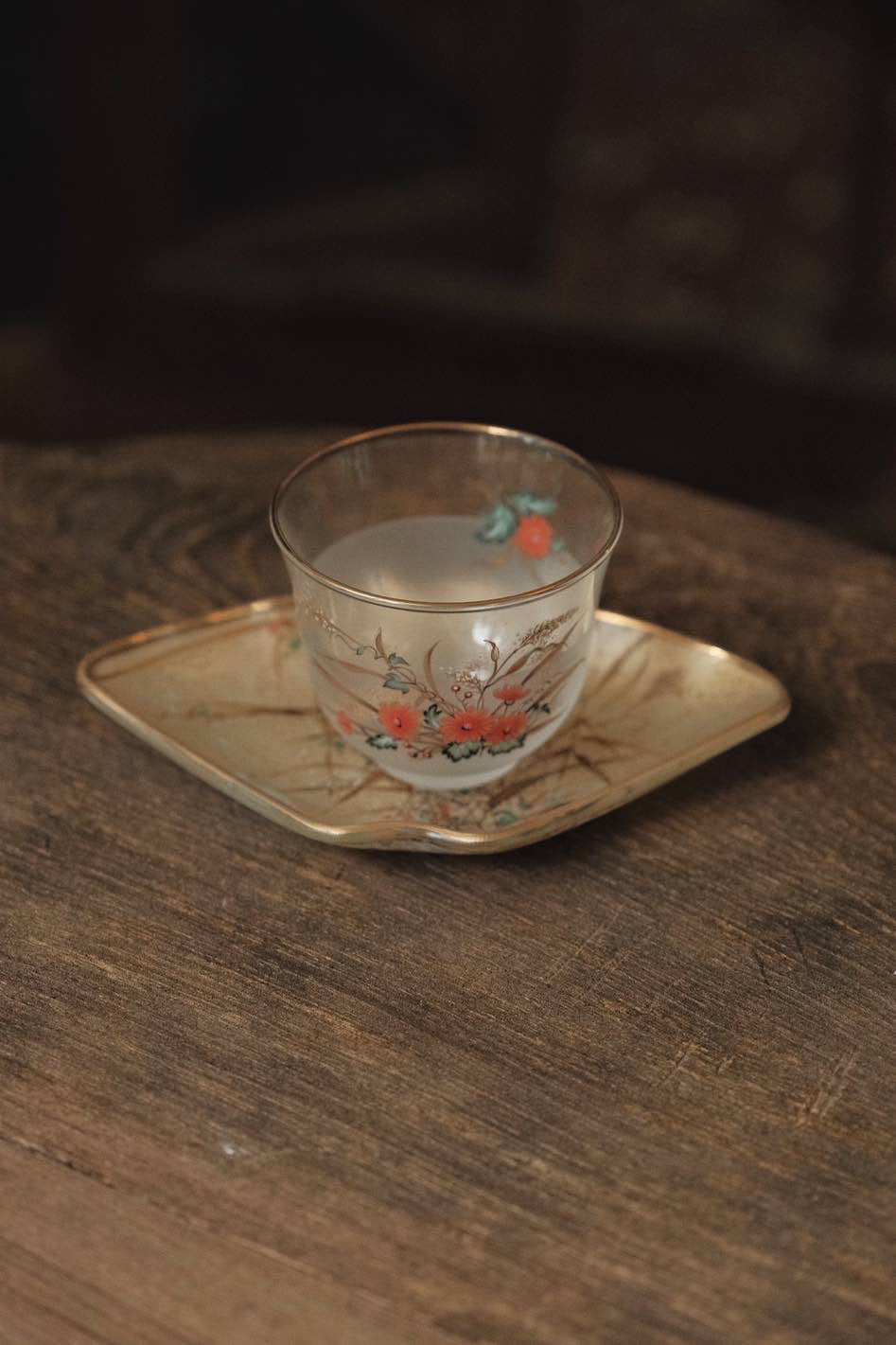 日本製•昭和光琳繪花鳥冷茶磨砂杯連扇碟(160ml)