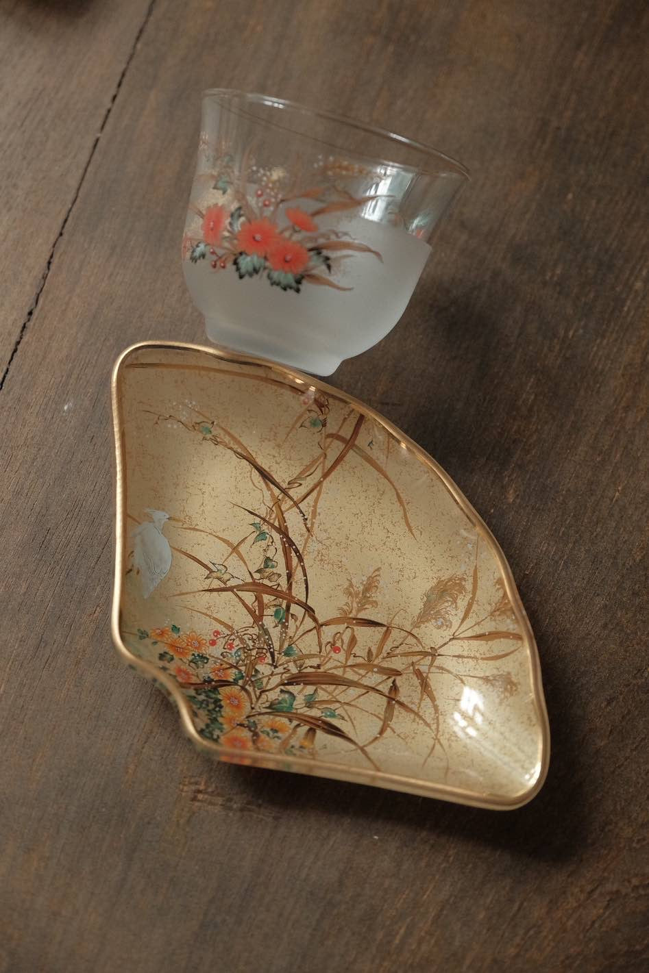 少有扇形碟配,描金磨砂玻璃杯玻璃碟透光有質感,花鳥圖金箔底,夏日小清凉