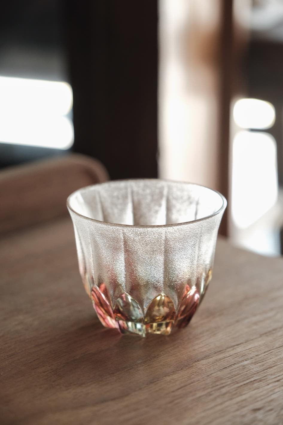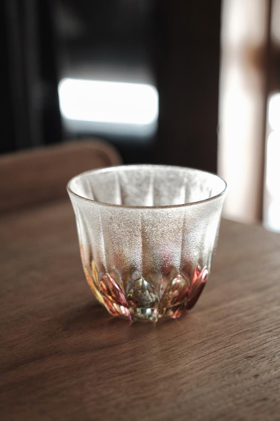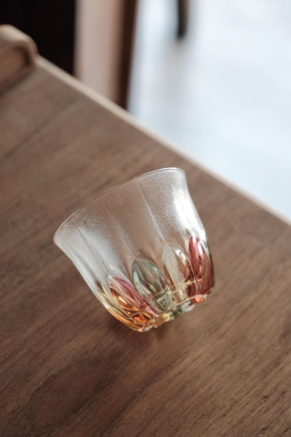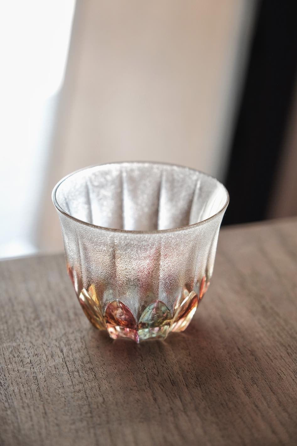 彩色玻璃切割透光漂亮,折射光線有種舊式彩玻璃窗感覺,厚重有質感,可當冷茶杯使用