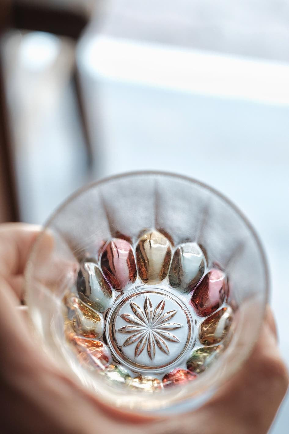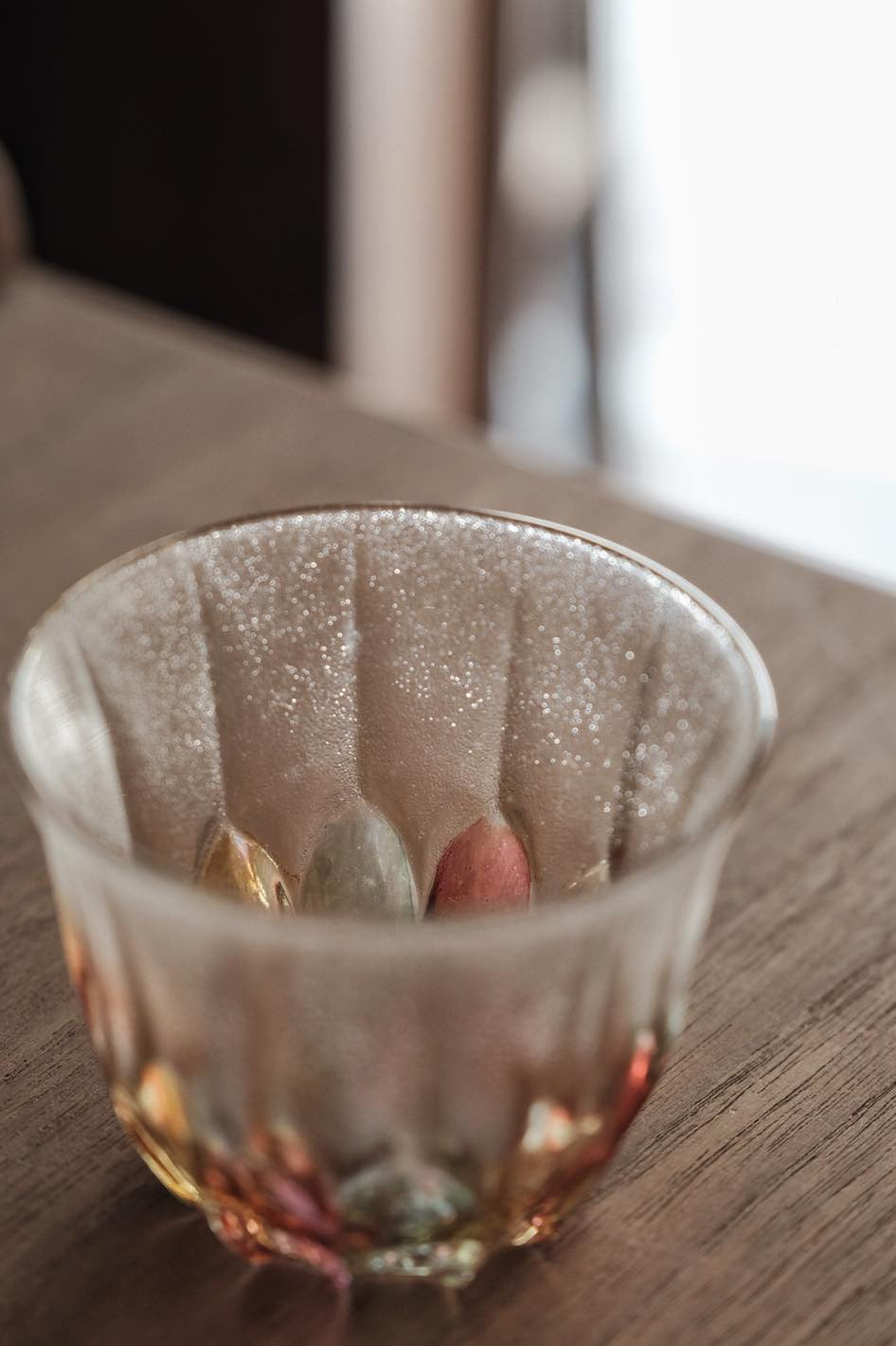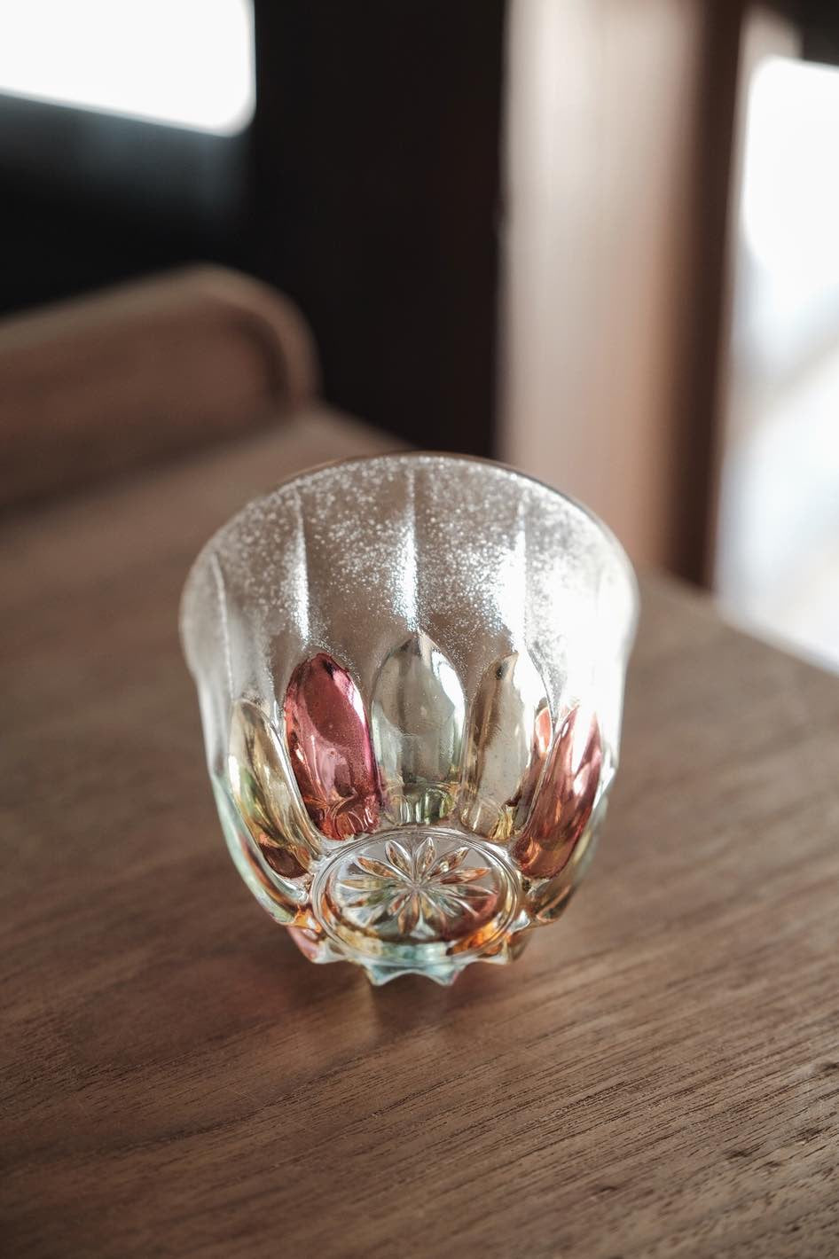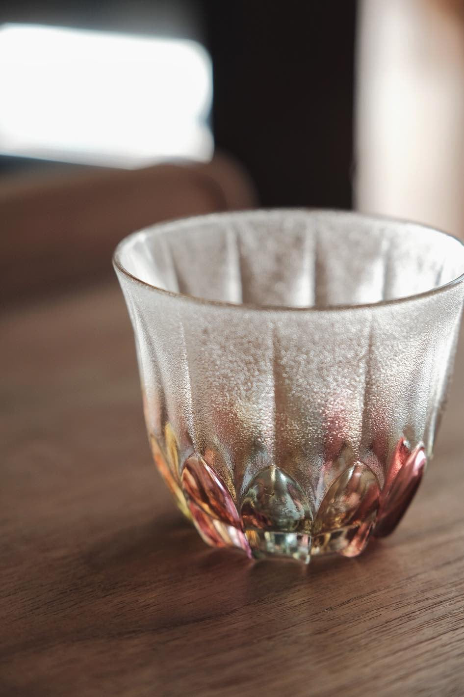 彩色玻璃切割透光漂亮,折射光線有種舊式彩玻璃窗感覺,厚重有質感,可當冷茶杯使用