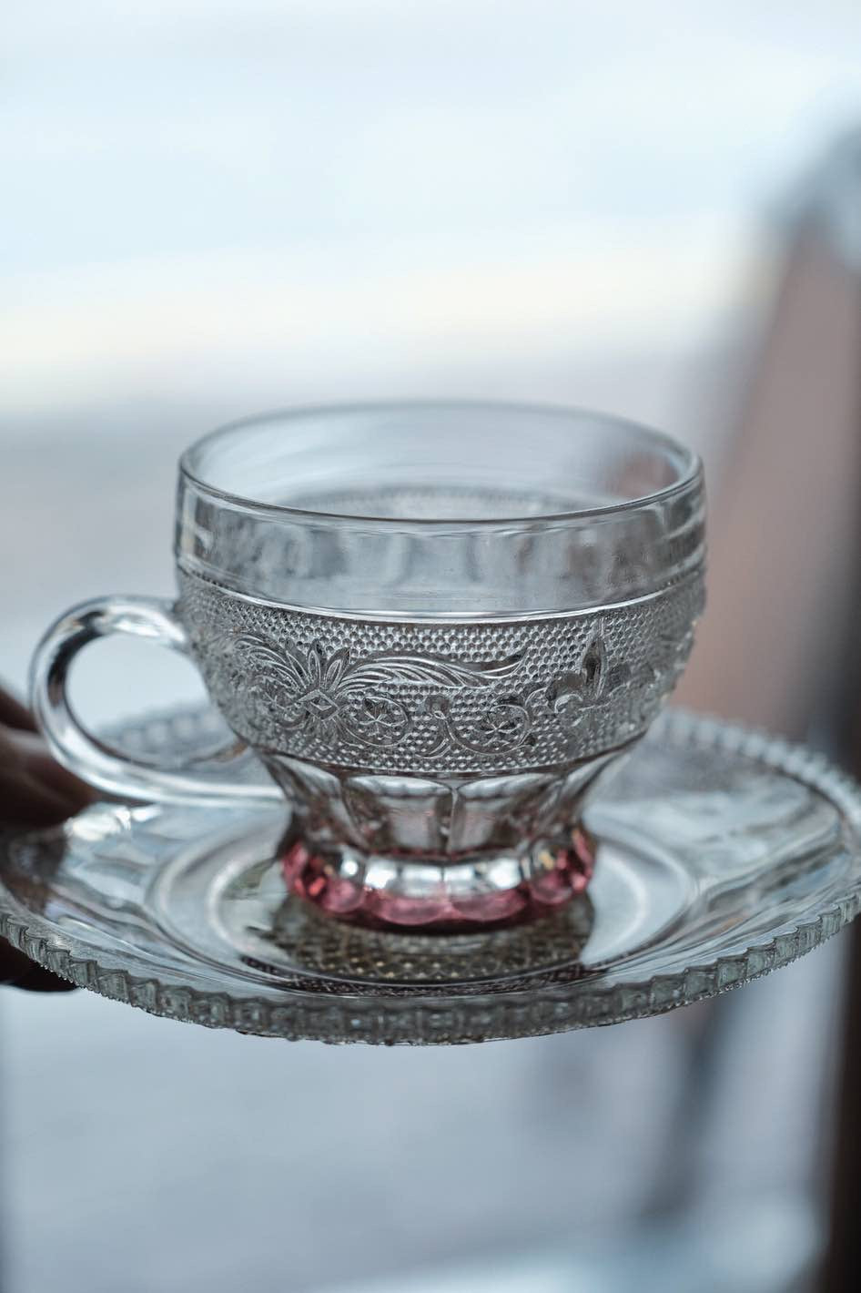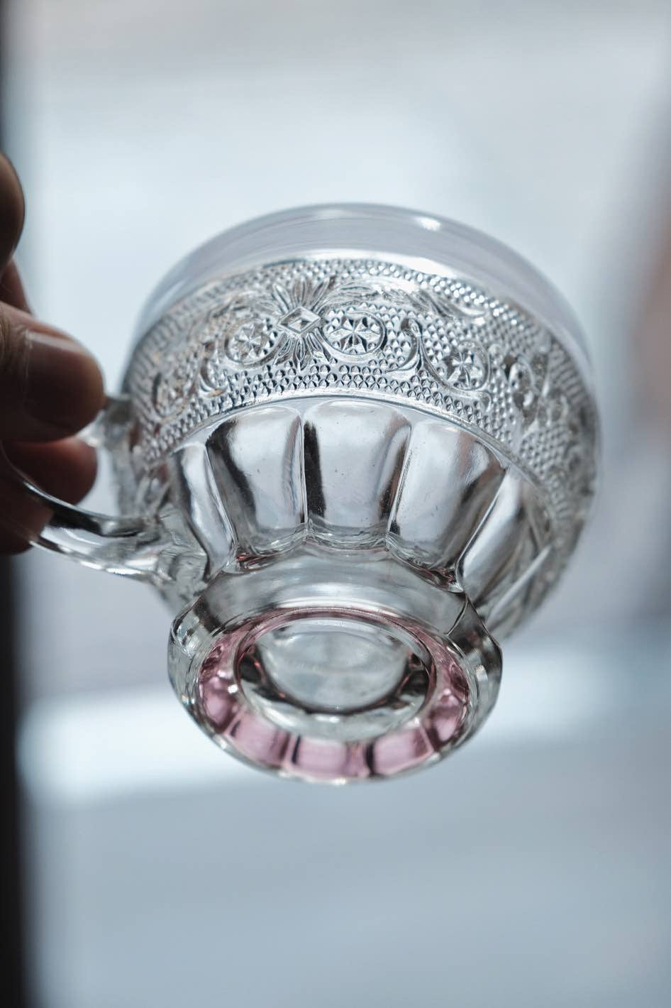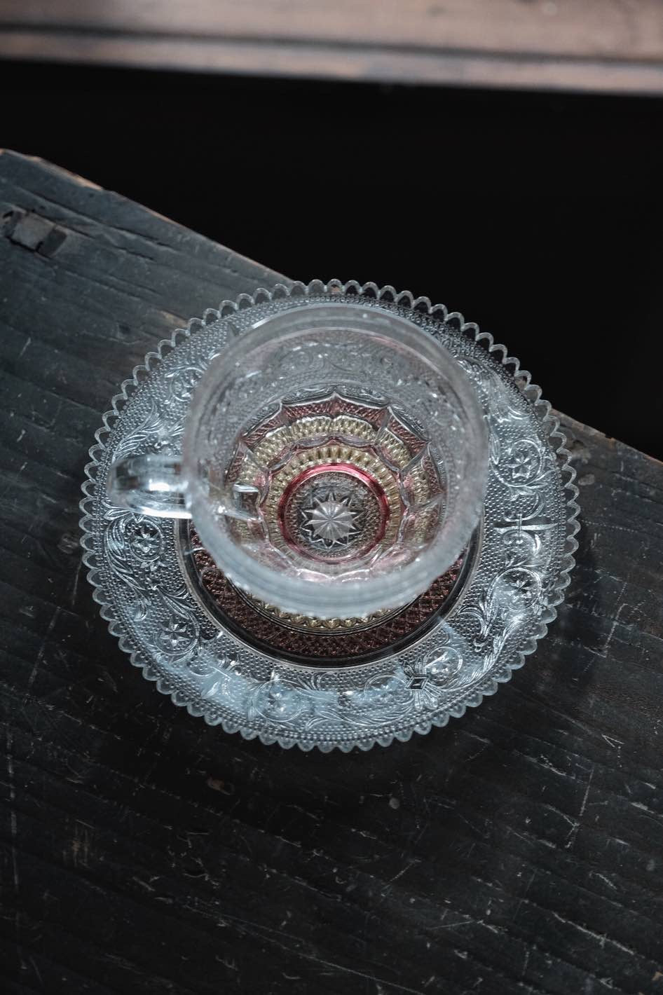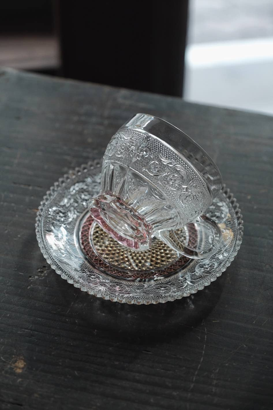 昭和時期刻花琉璃,玻璃咖啡杯碟满雕刻工藝,下方縮口粉色底,碟底黄粉底相間色,印刻鳶尾花紋