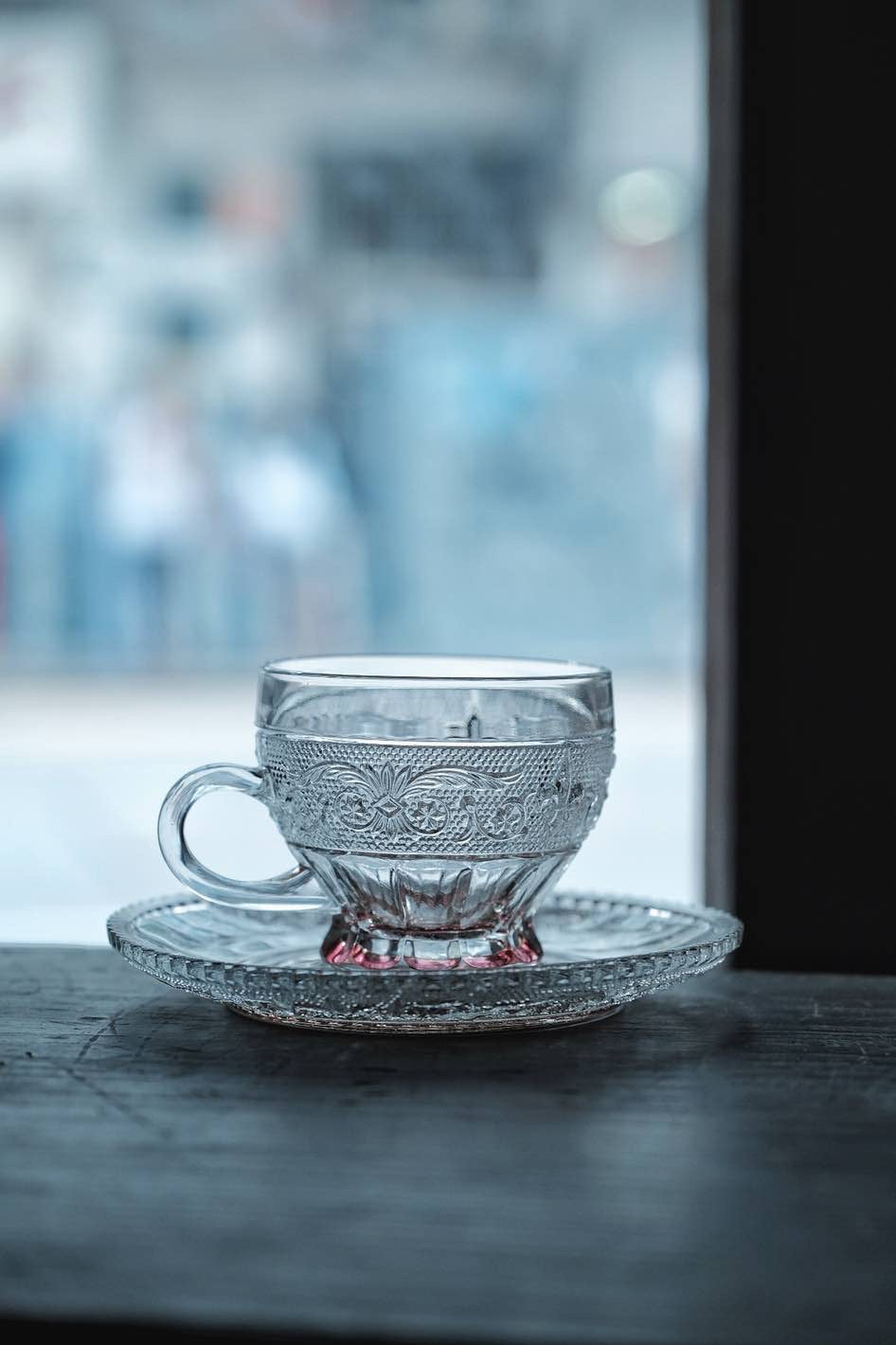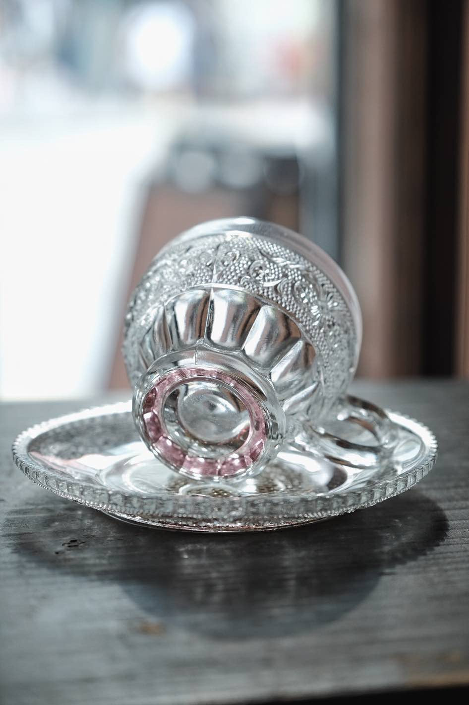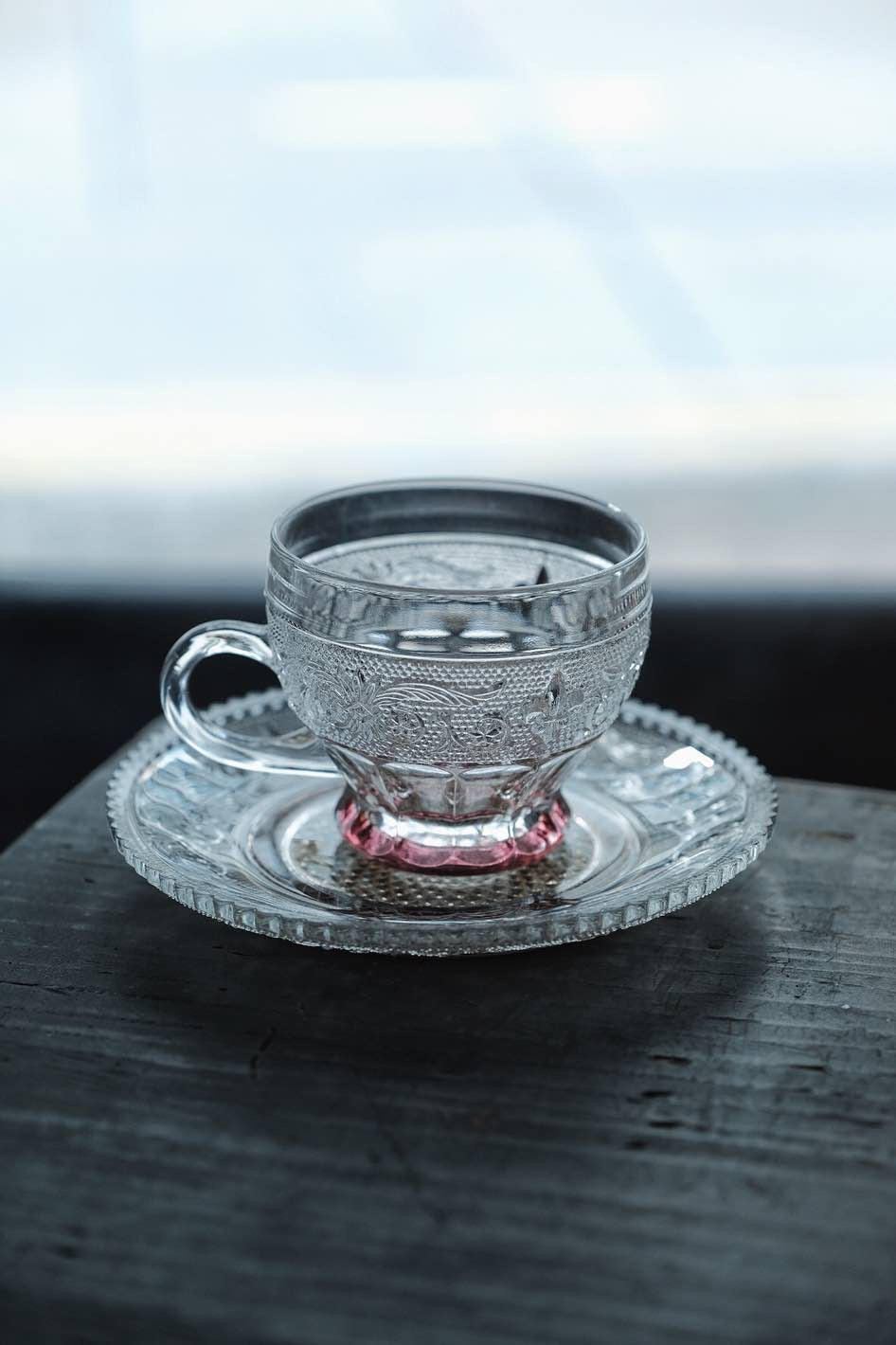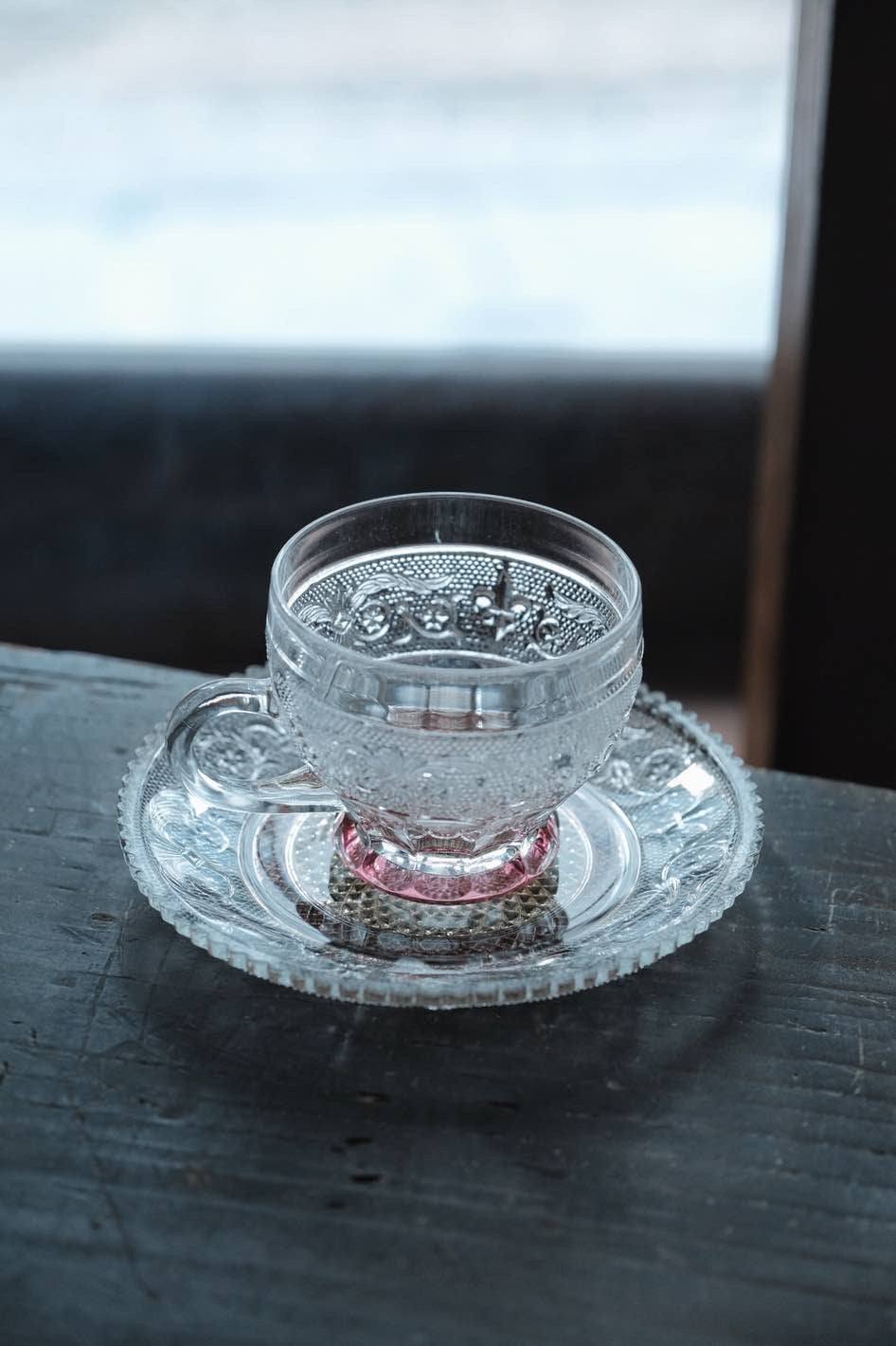 昭和時期刻花琉璃,玻璃咖啡杯碟满雕刻工藝,下方縮口粉色底,碟底黄粉底相間色,印刻鳶尾花紋