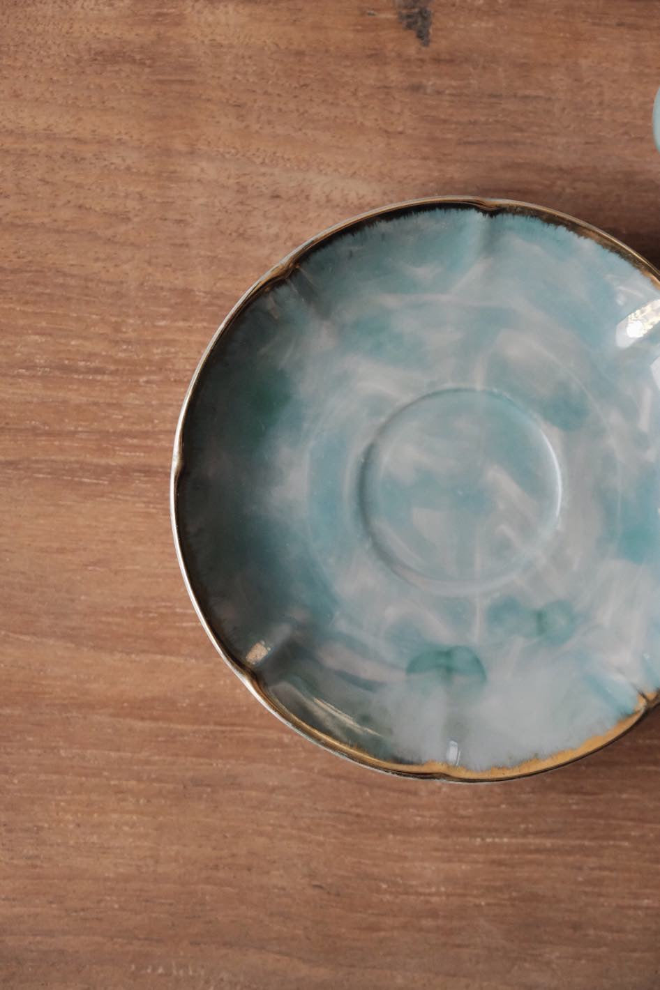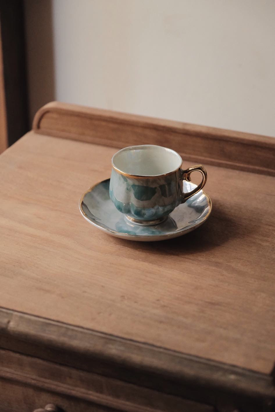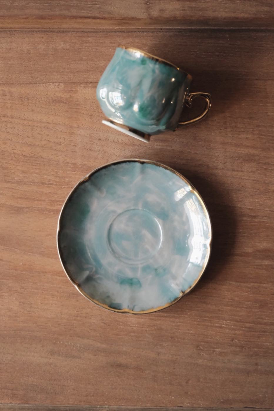 湖水綠自然色優雅美感,花瓣般形狀的浮雕杯身碟身,光線照射呈現的七彩珍珠色落為簡潔配色呈現高貴感。