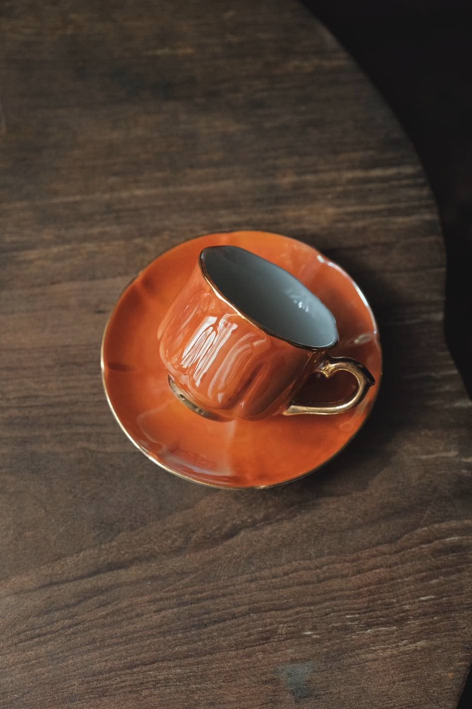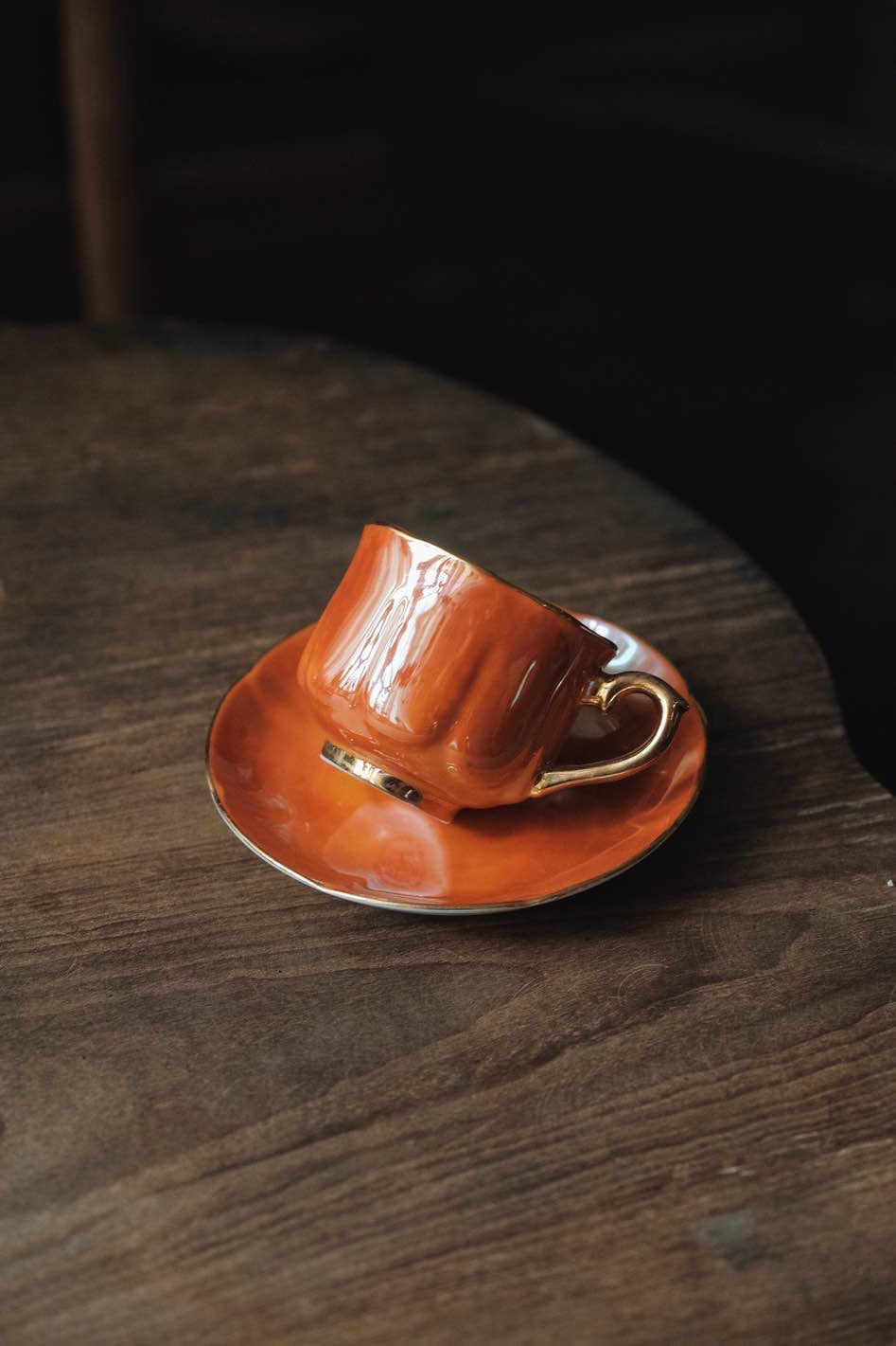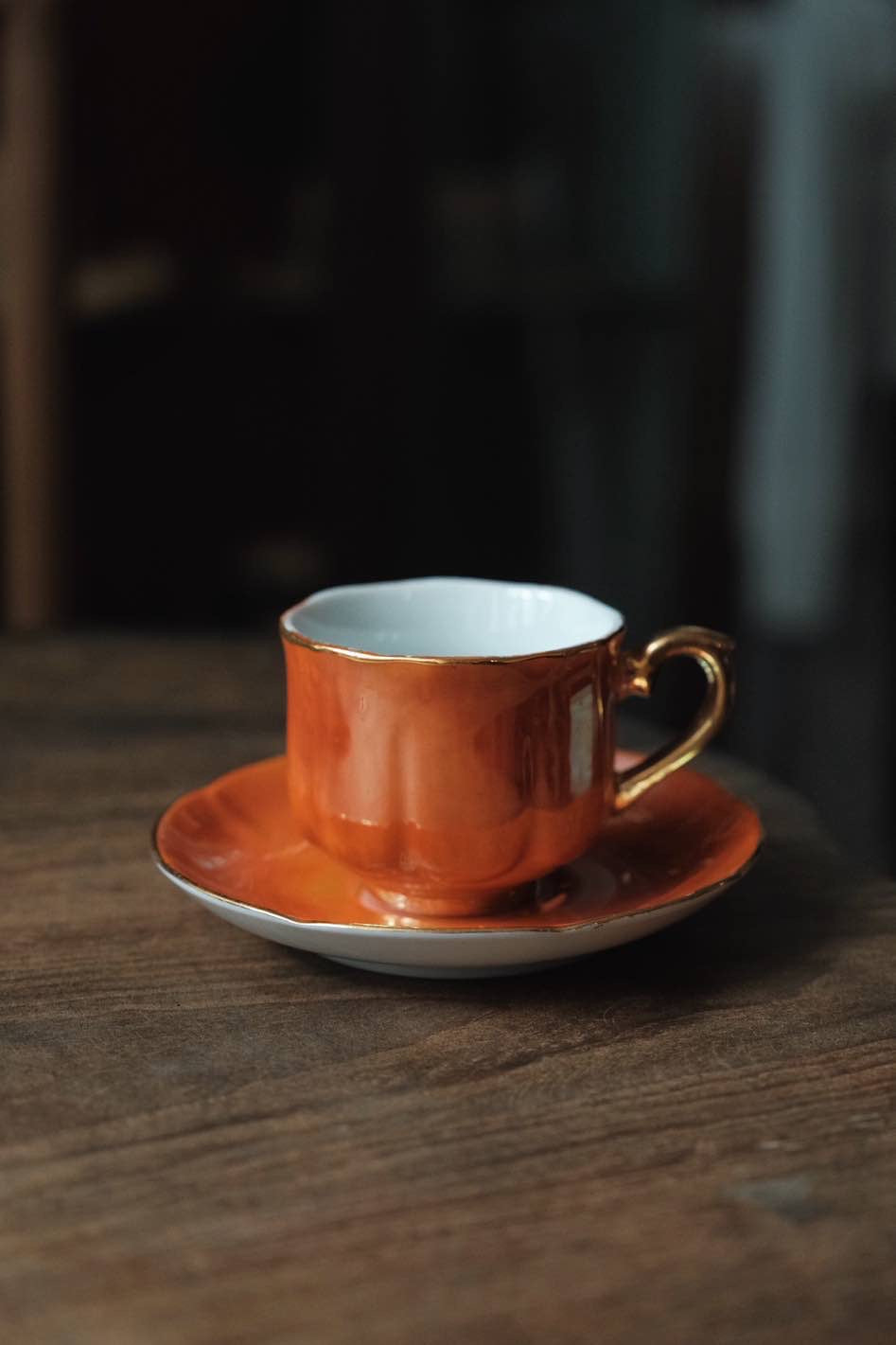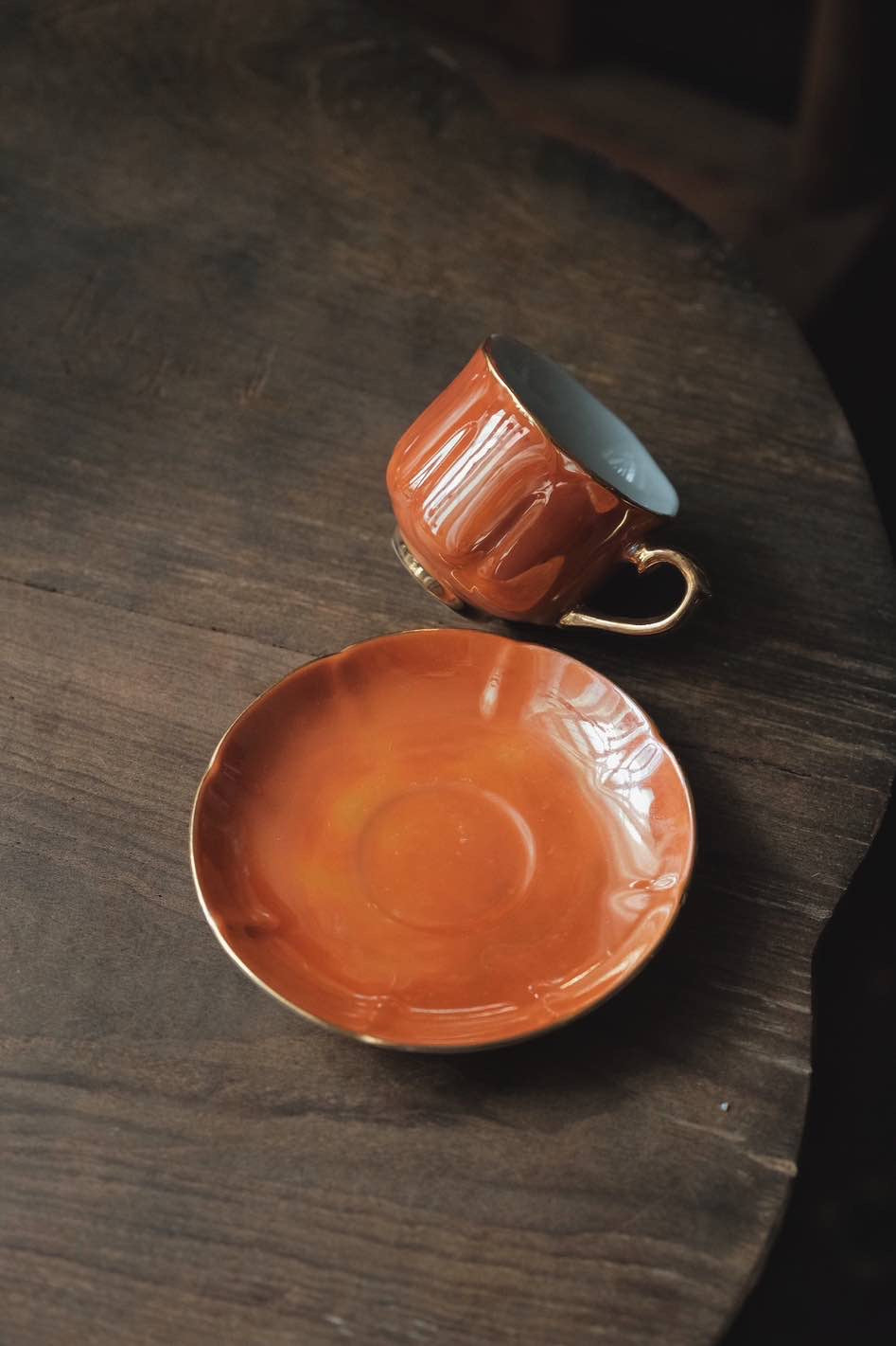 少有全橙光全手把金,强反光珠寶色感,描金圖,花瓣般形狀的浮雕杯身碟身,光線照射呈現的七彩珍珠色落為簡潔配色呈現高貴感。
