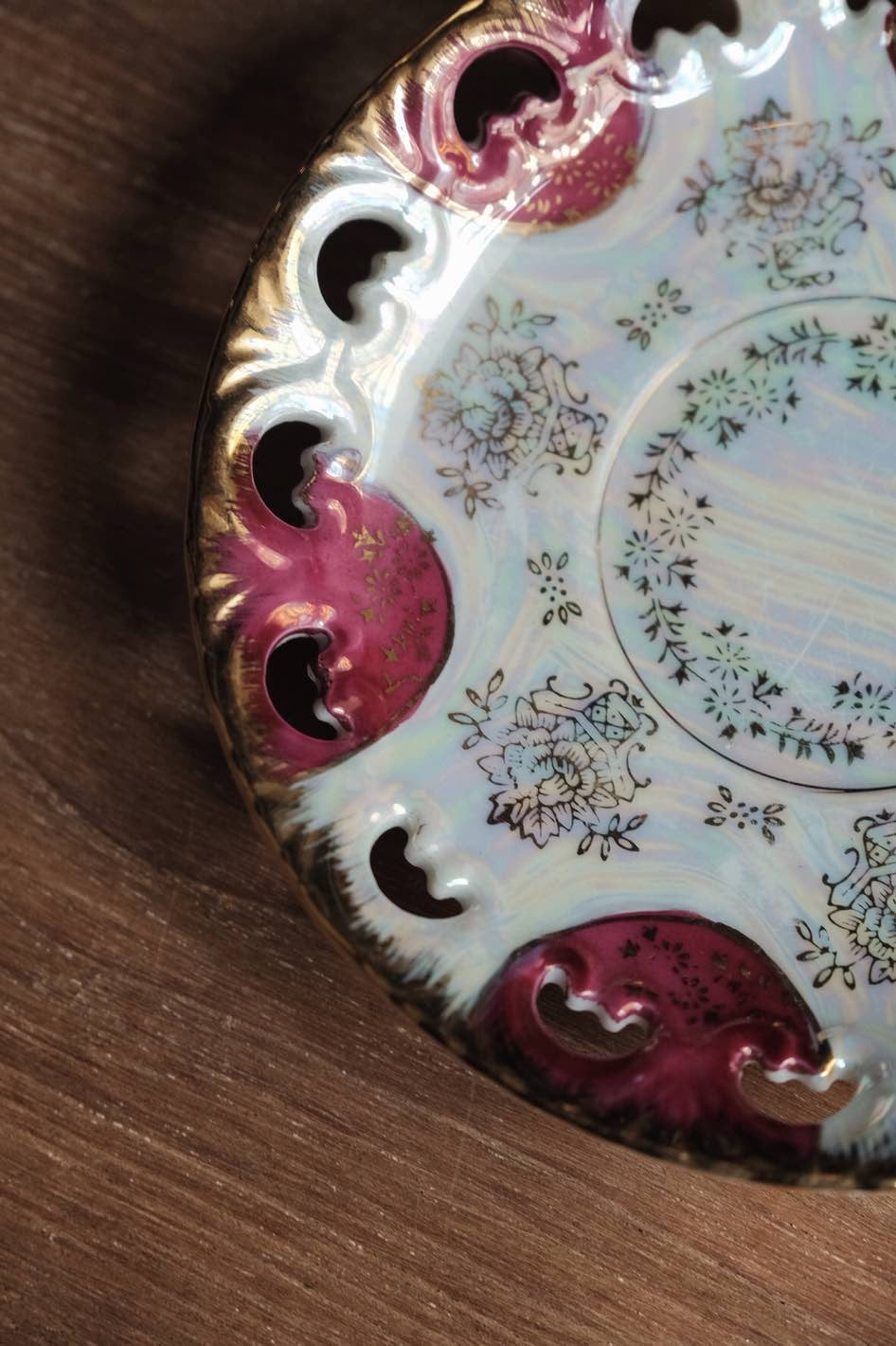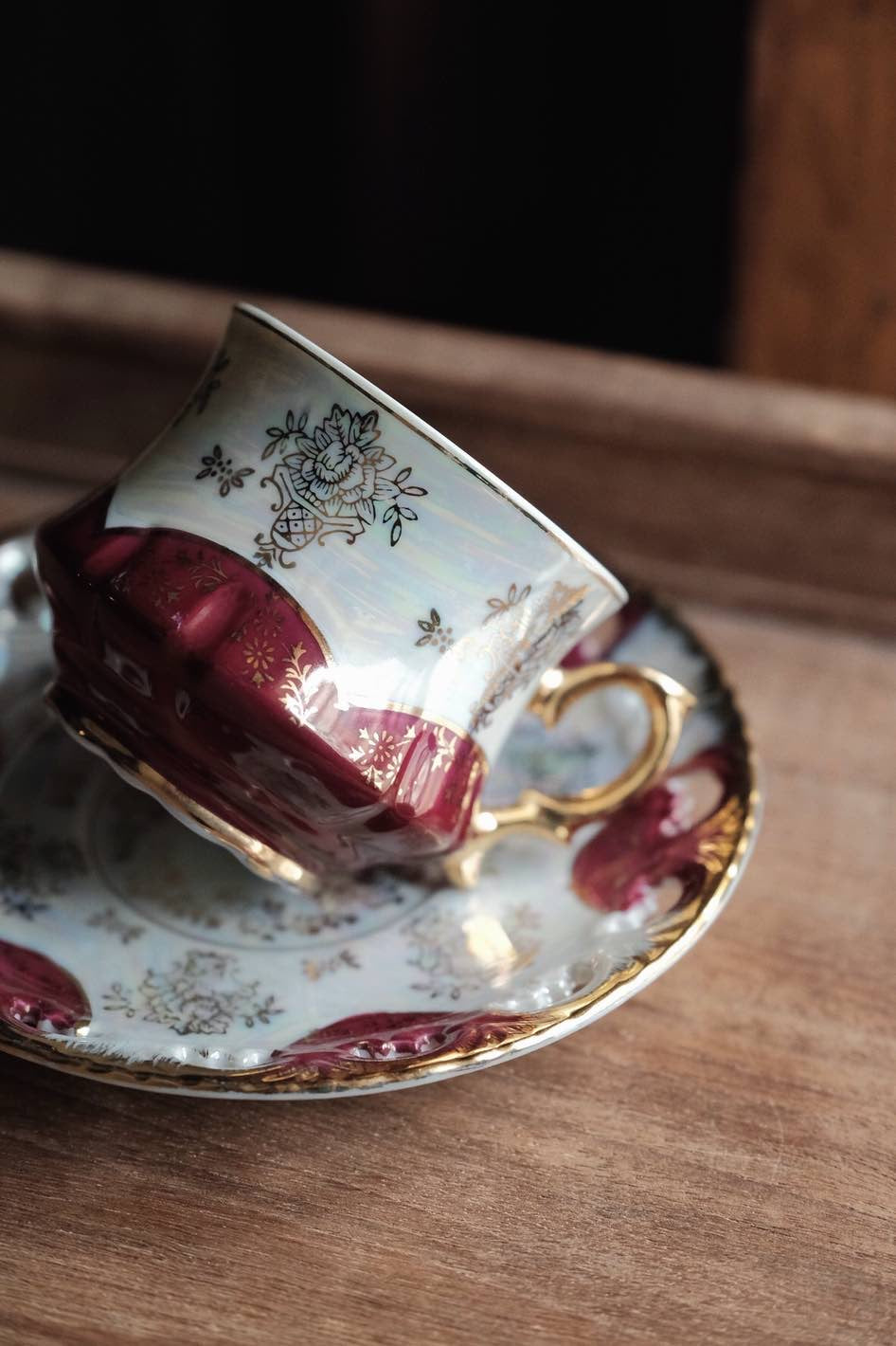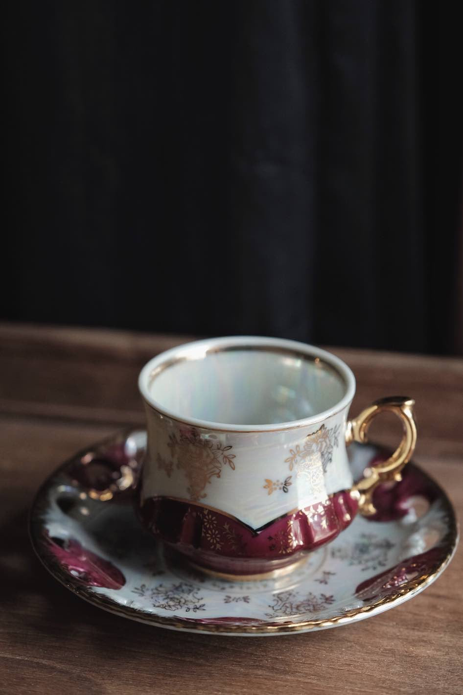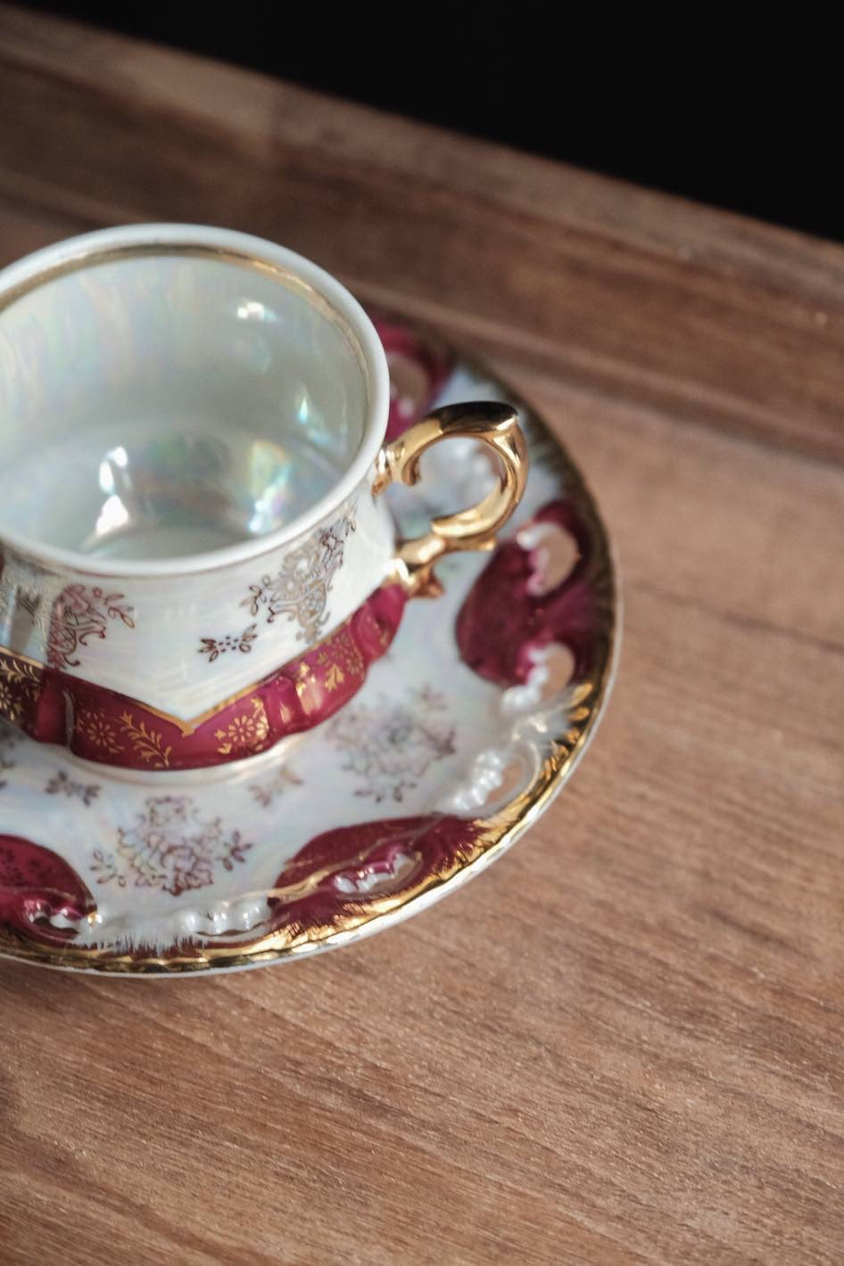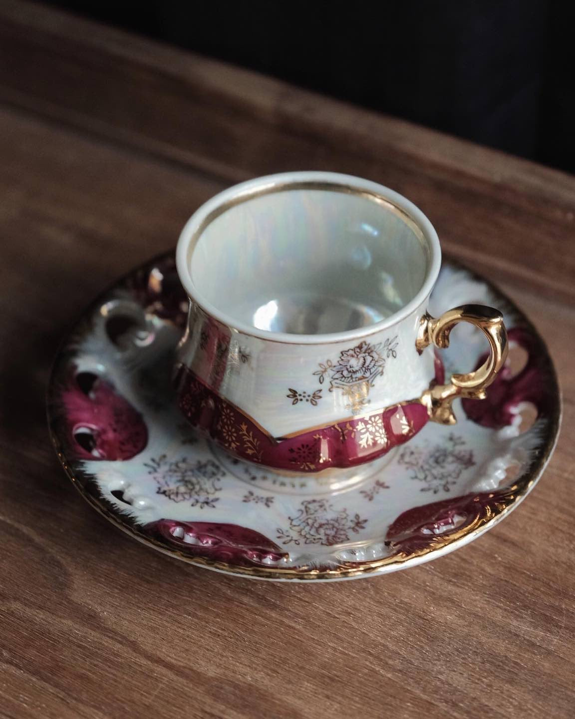 不同光線下有不同顏色,整體滿工描金畫,杯內白色珍珠釉增加層次,光線照射呈現的七彩珍珠色落為簡潔配色呈現高貴感。