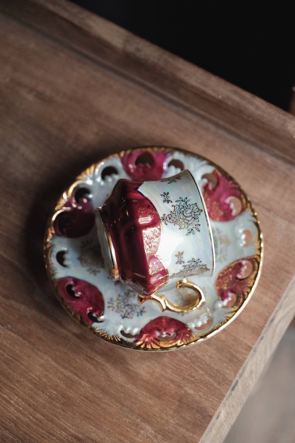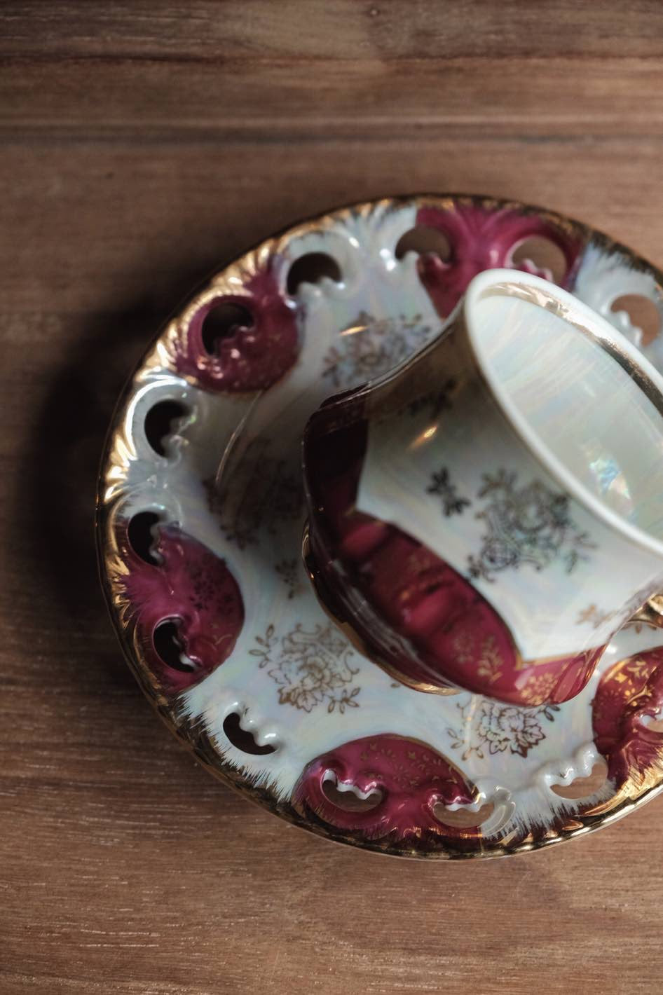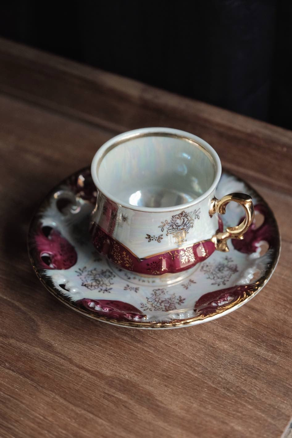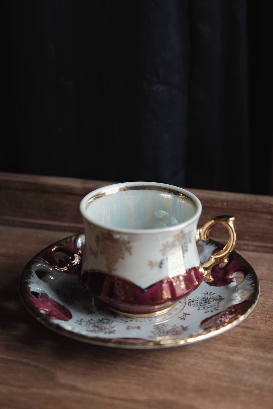 以紫紅拼珍珠色作主調色,碟邊有浮雕,杯形像旋轉中的裙擺,更難得是杯內有粗金線繪簡潔有力。
