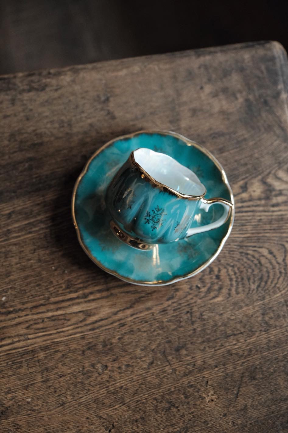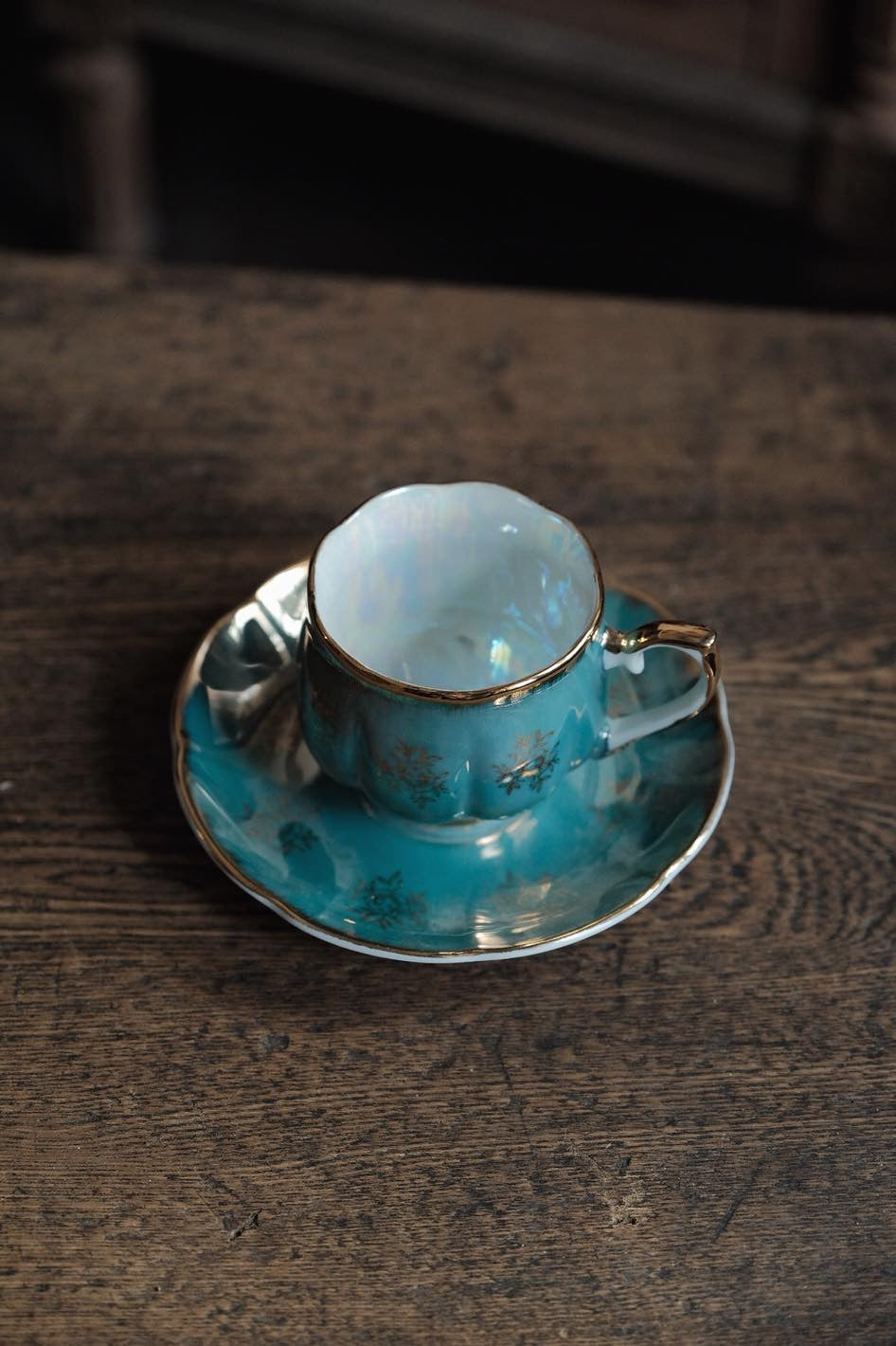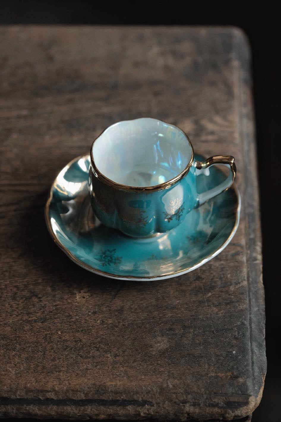 湖水綠自然色優雅美感,强反光珠寶色感,描金圖,花瓣般形狀的浮雕杯身碟身,光線照射呈現的七彩珍珠色落為簡潔配色呈現高貴感。