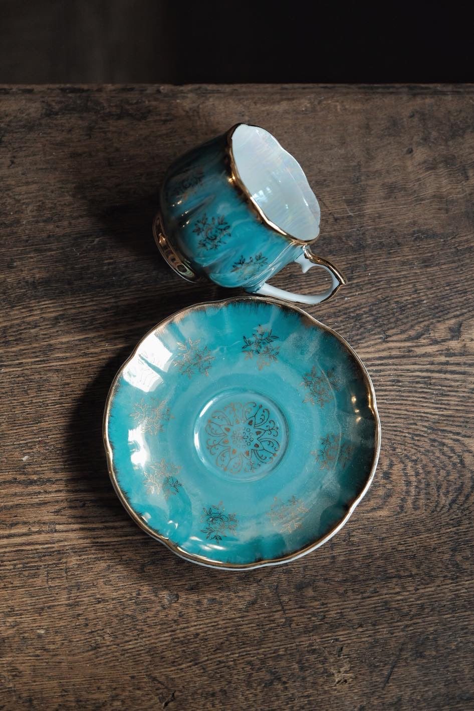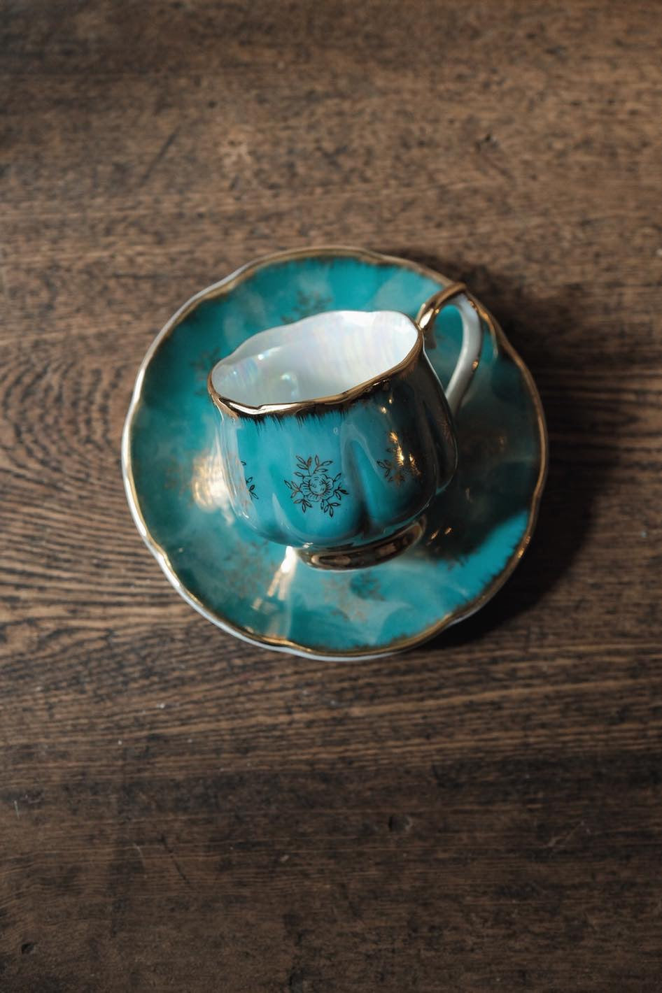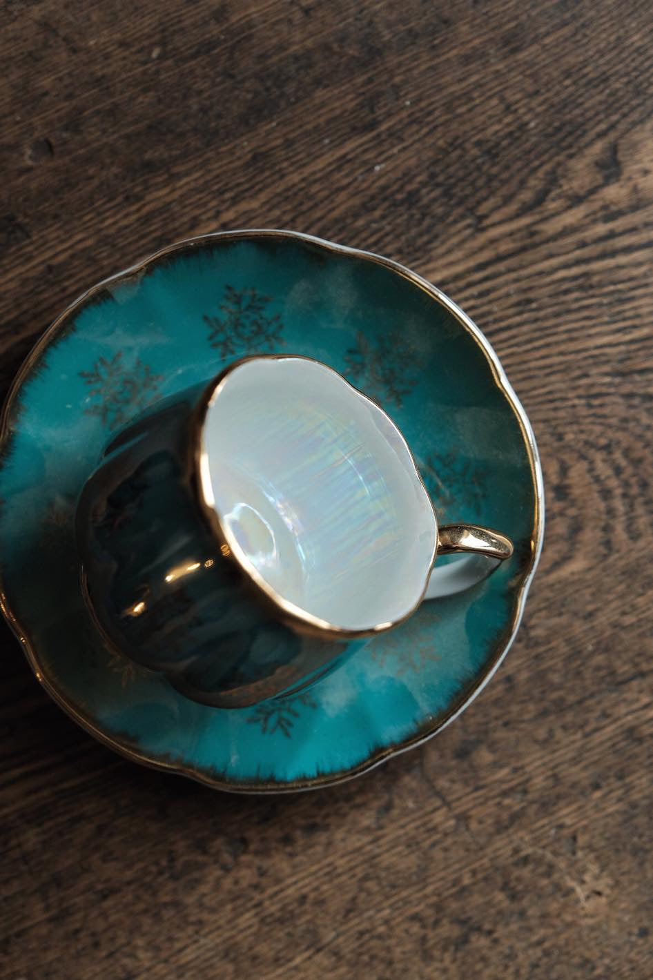 湖水綠自然色優雅美感,强反光珠寶色感,描金圖,花瓣般形狀的浮雕杯身碟身,光線照射呈現的七彩珍珠色落為簡潔配色呈現高貴感。