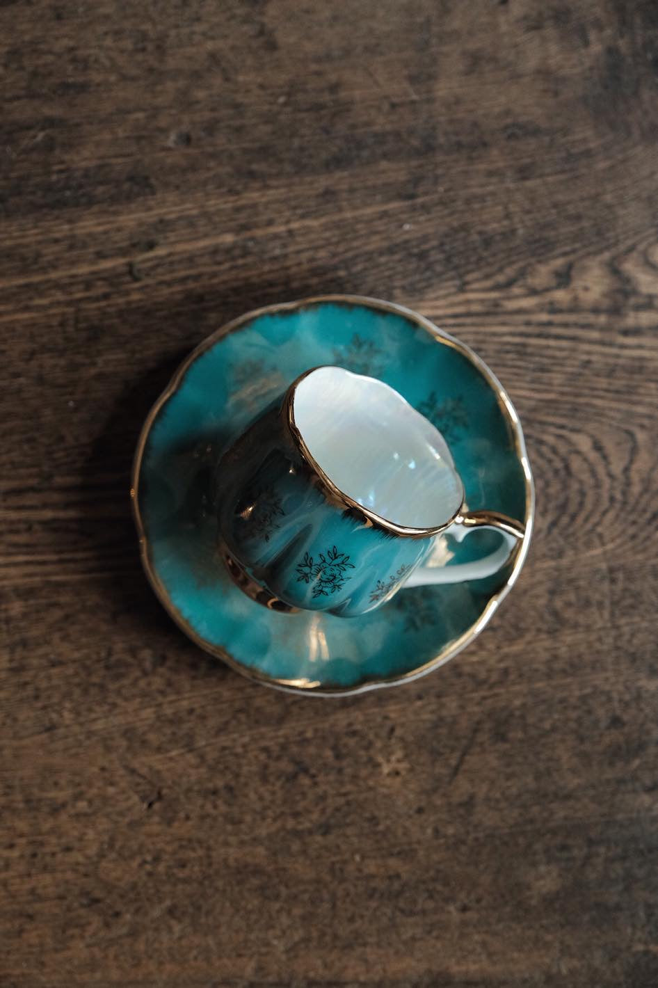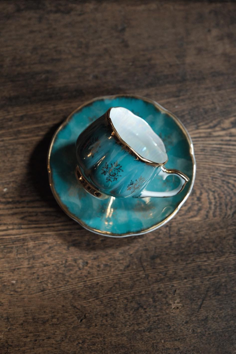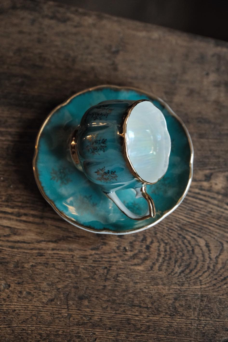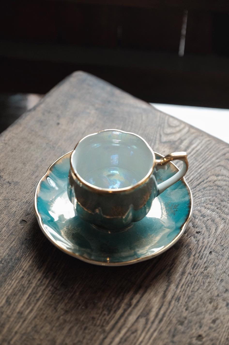 日本製·珍珠湖水綠描金貝殼釉骨瓷杯連碟(150ml)