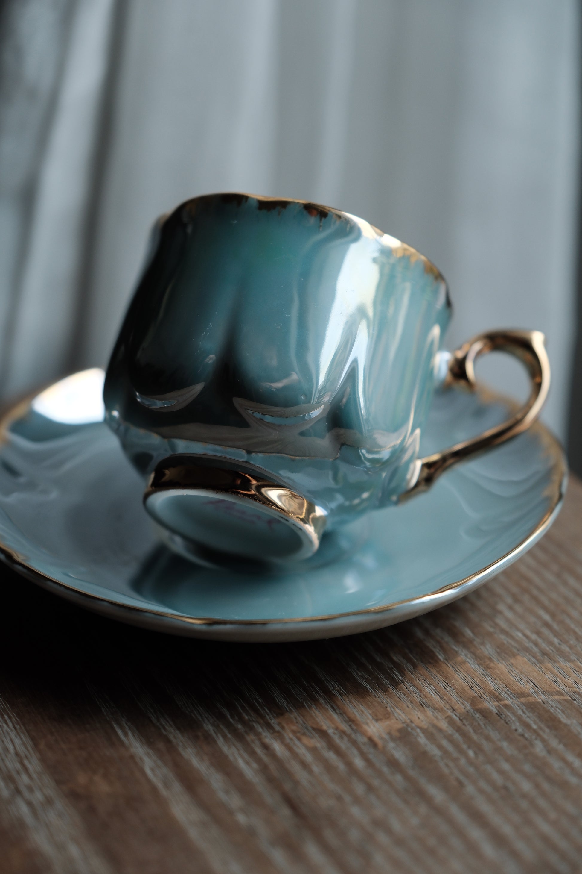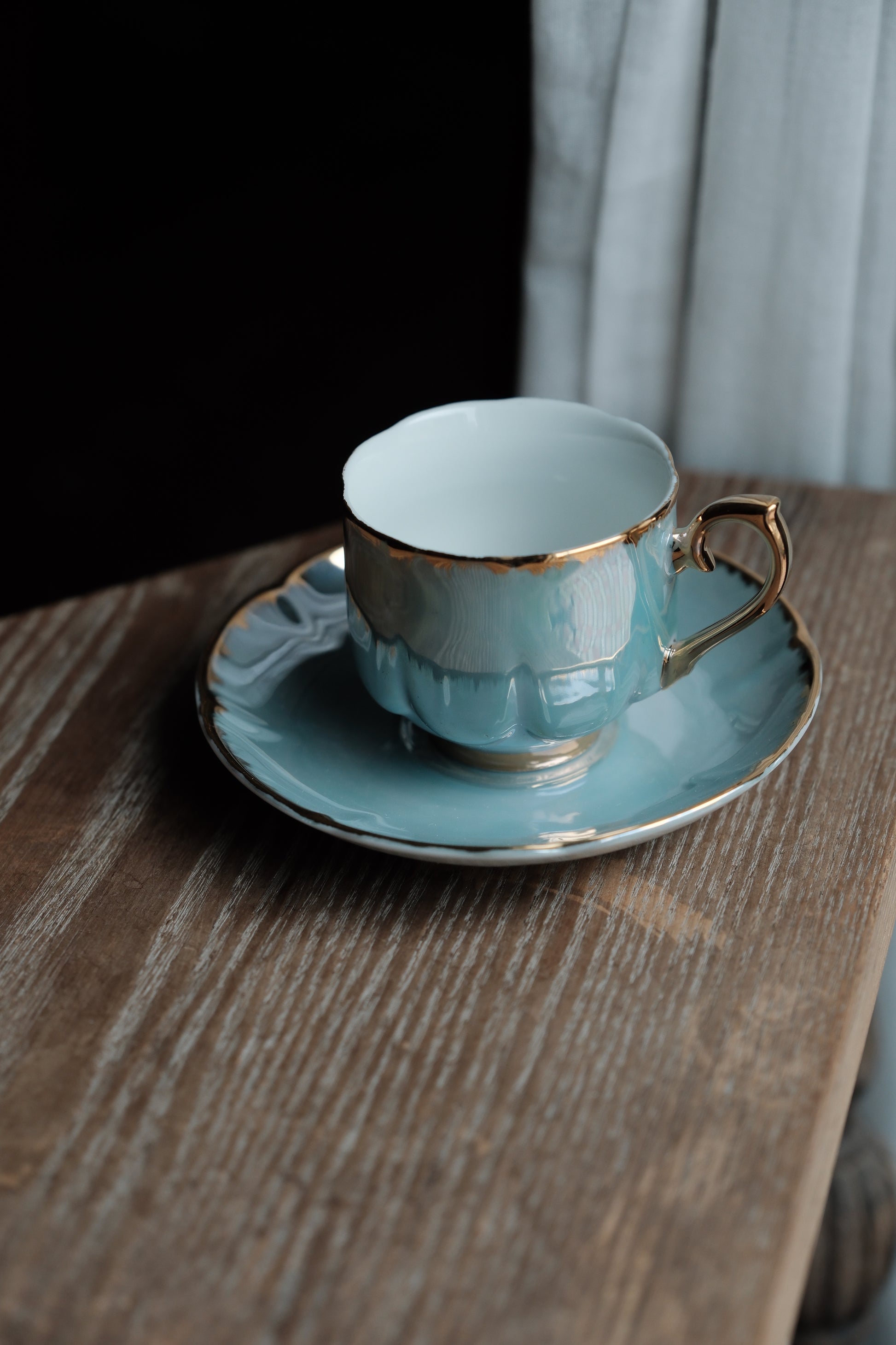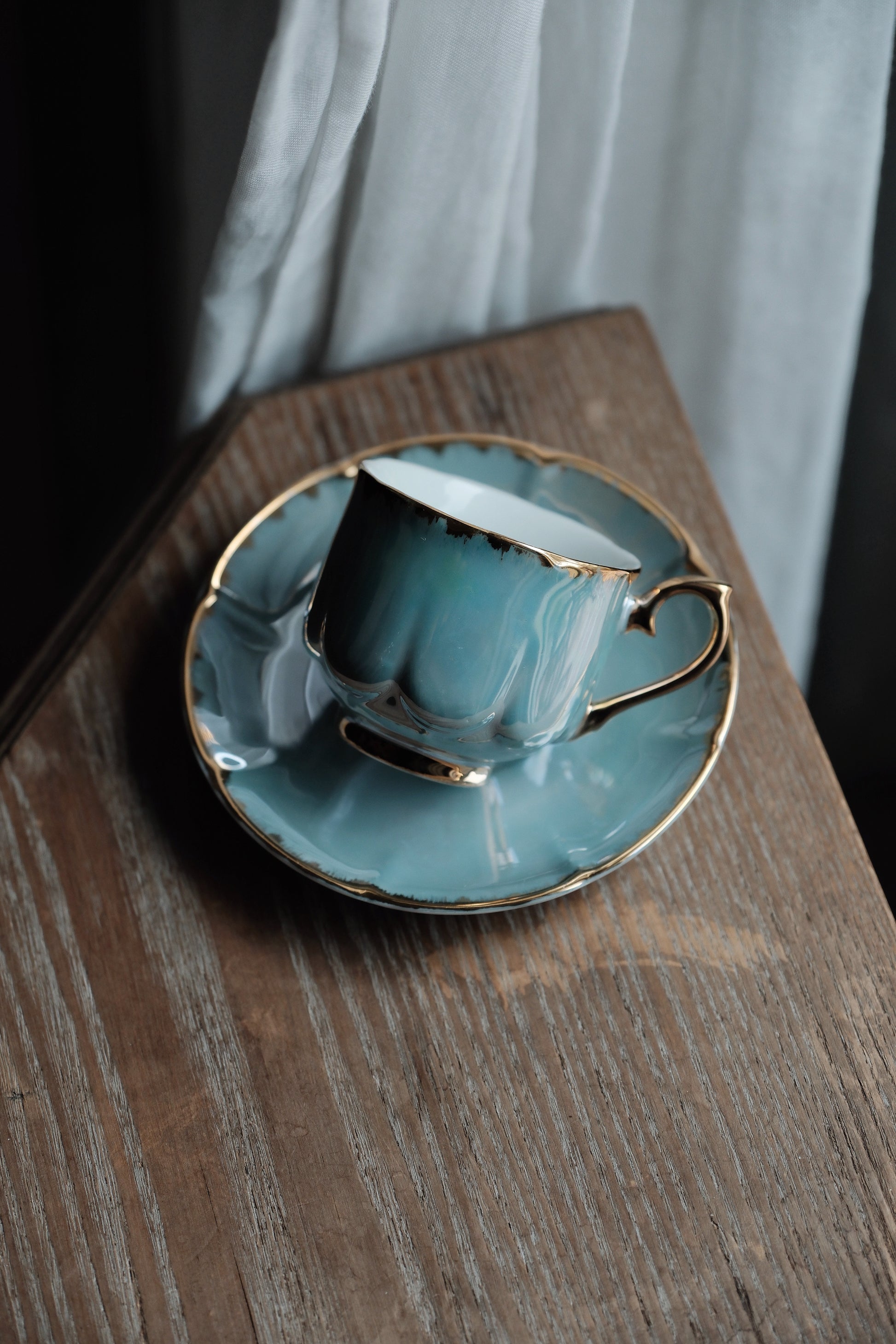 湖水藍自然色優雅美感,强反光珠寶色感,描金圖,花瓣般形狀的浮雕杯身碟身,光線照射呈現的七彩珍珠色落為簡潔配色呈現高貴感。