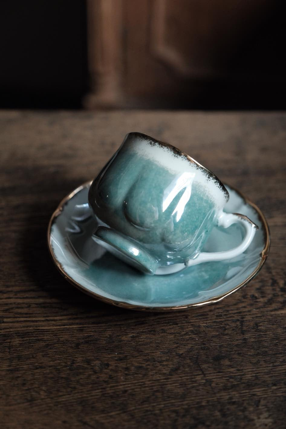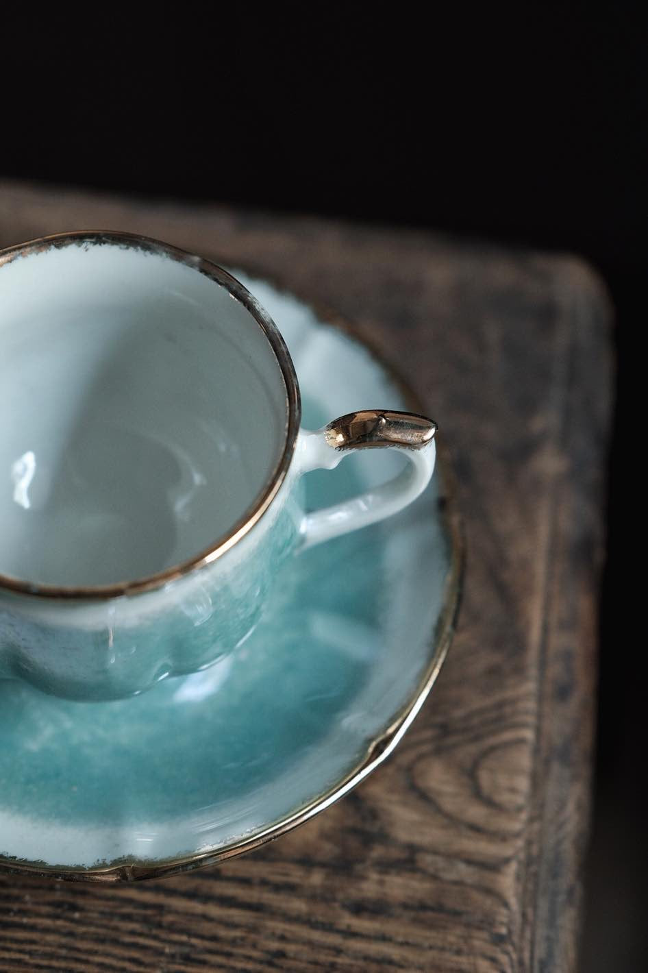 湖水藍自然色優雅美感,花瓣般形狀的浮雕杯身碟身,光線照射呈現的七彩珍珠色落為簡潔配色呈現高貴感。