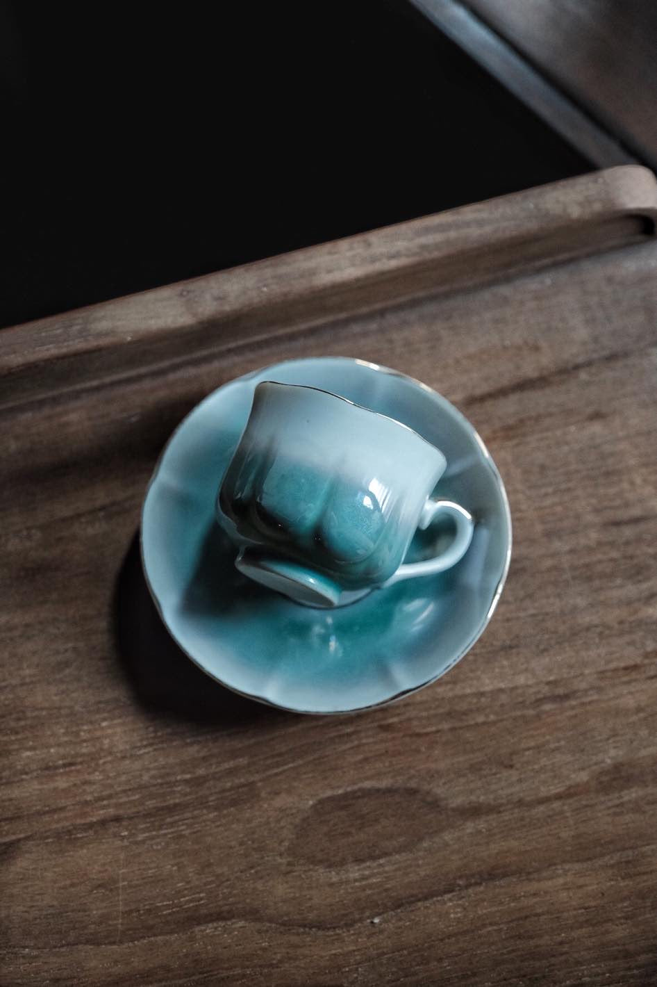 湖水藍自然色優雅美感,花瓣般形狀的浮雕杯身碟身,光線照射呈現的七彩珍珠色落為簡潔配色呈現高貴感。