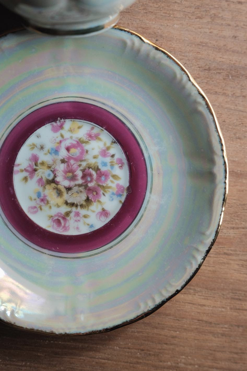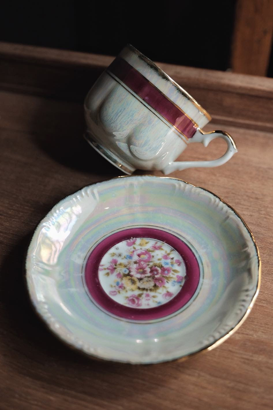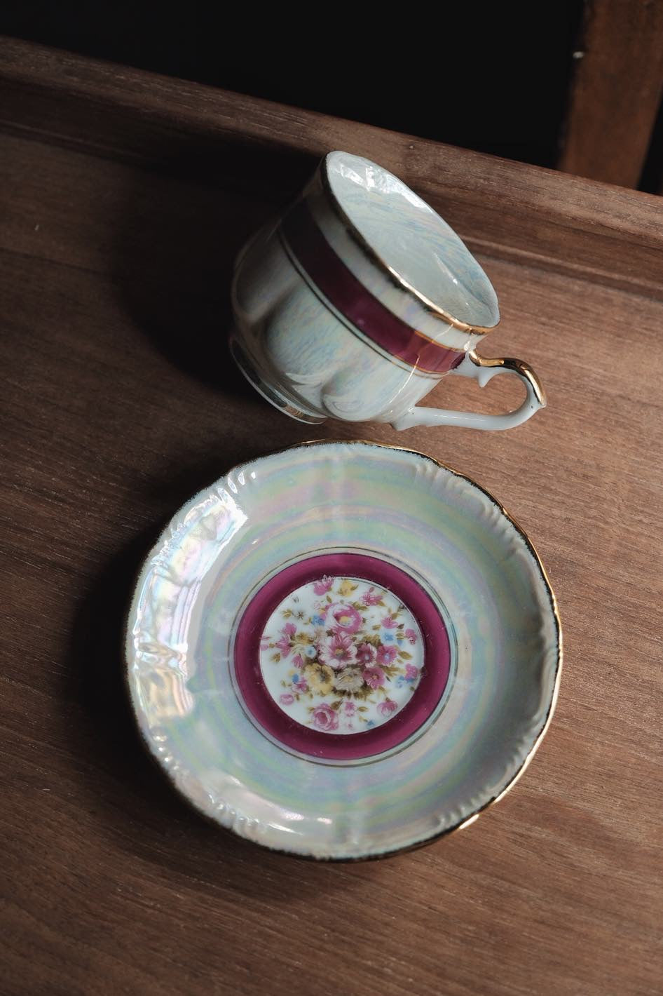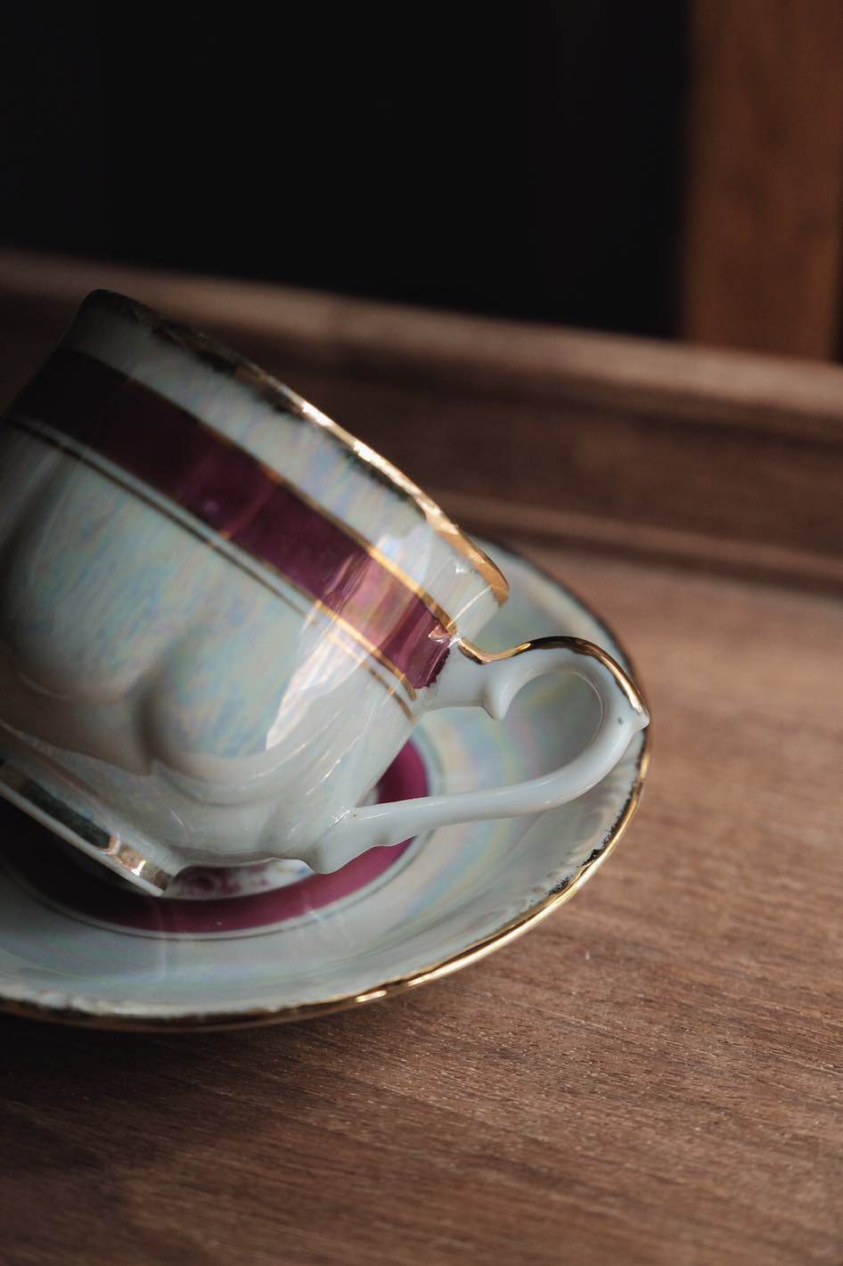 杯身容量大,杯胚有重量,以紫色為色調,咖啡杯把手套有精緻描金,碟芯有繪花,