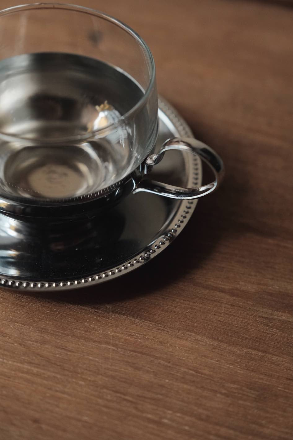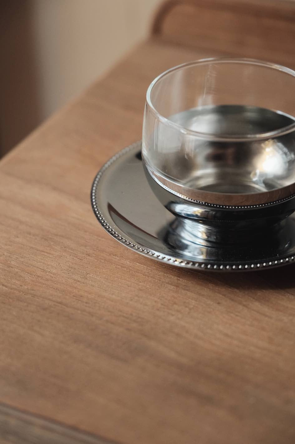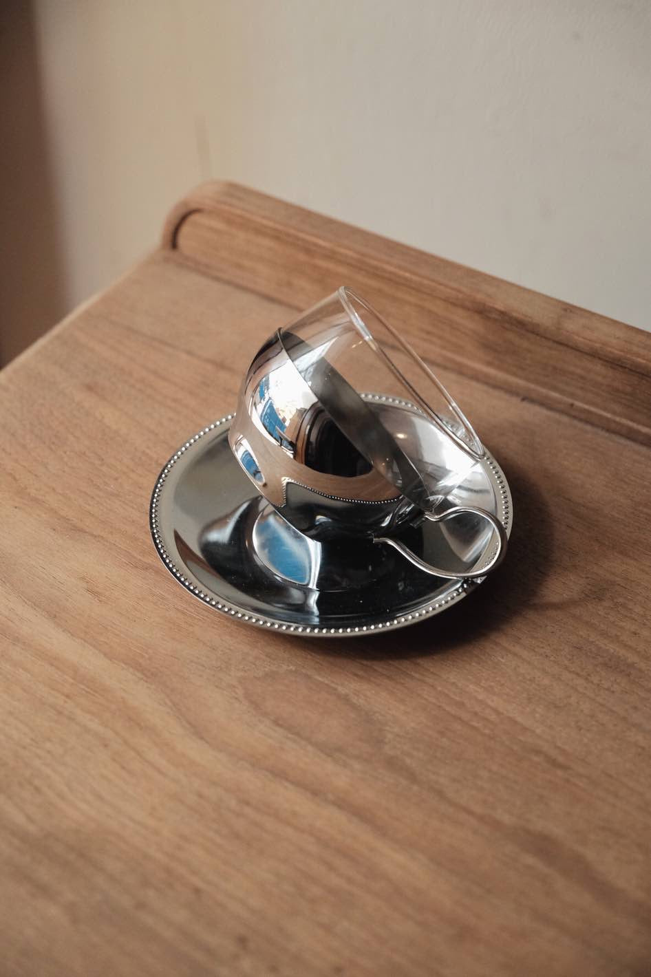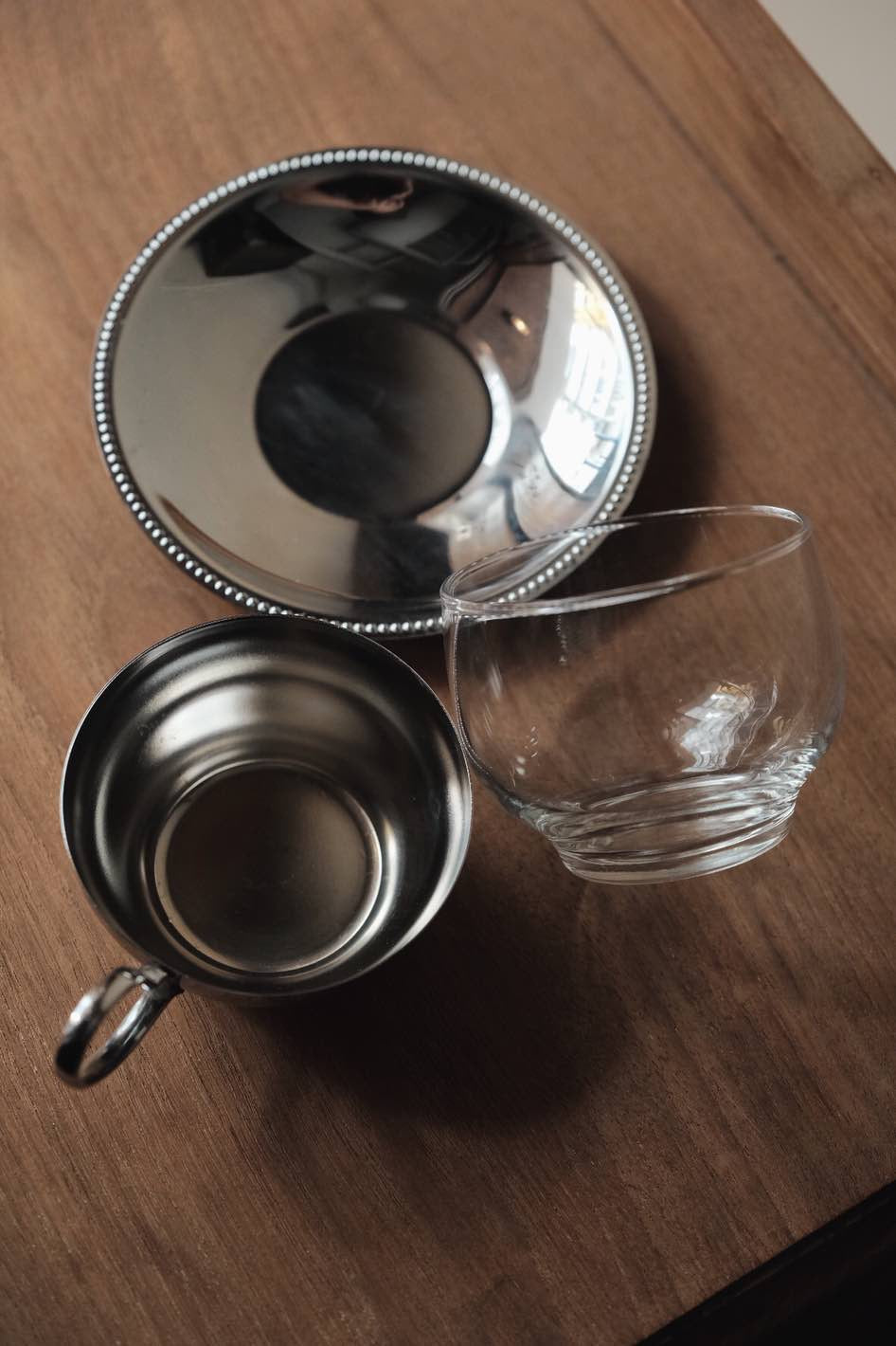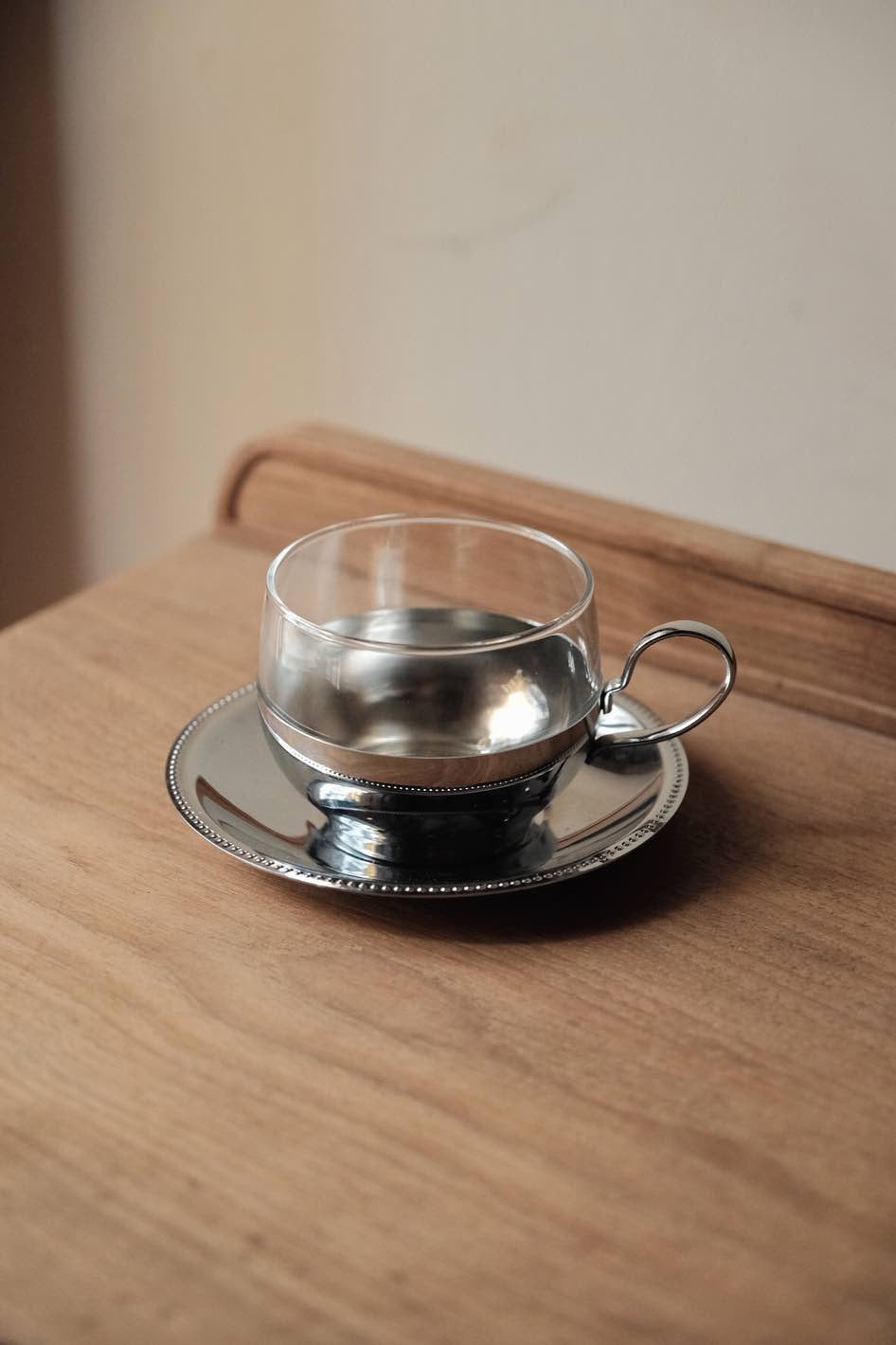 金屬托杯設計,簡潔飽滿,碟邊有珠粒裝飾,玻璃杯可獨立拆出清潔,鍍銀表面有氧化痕跡。