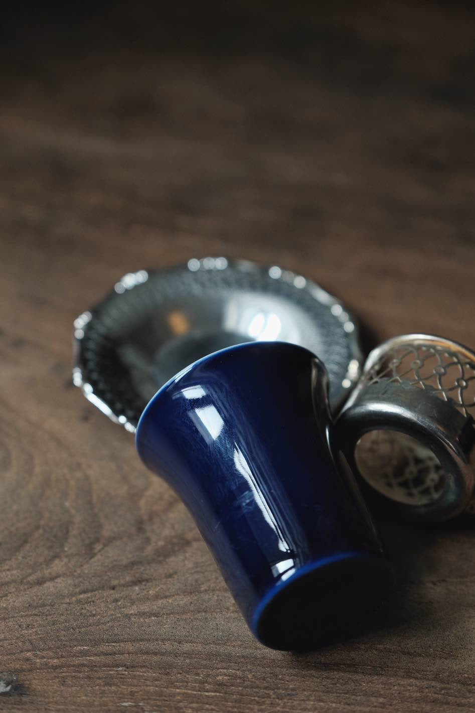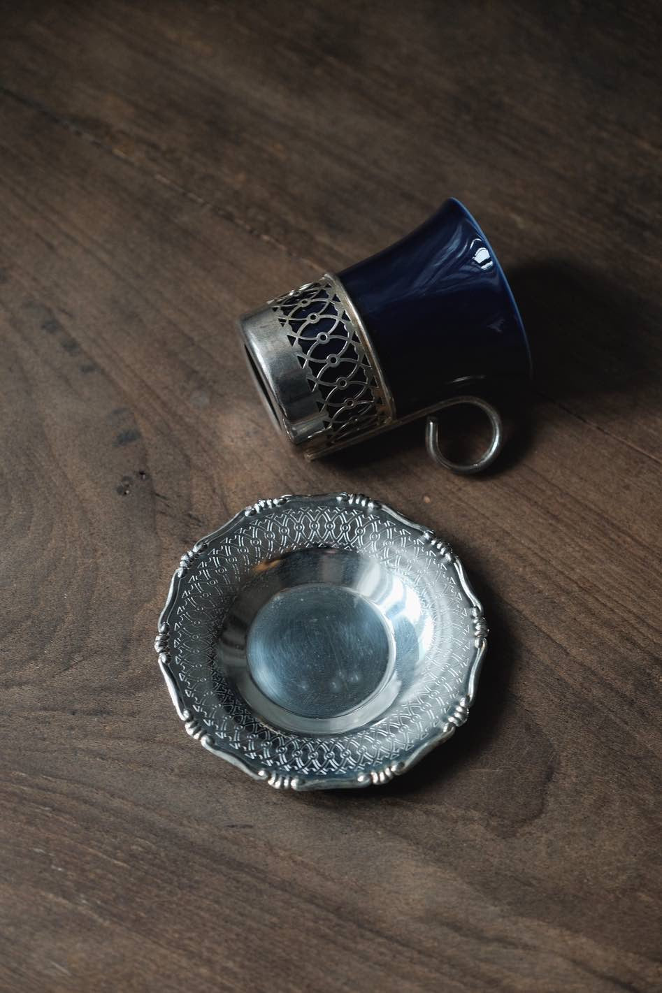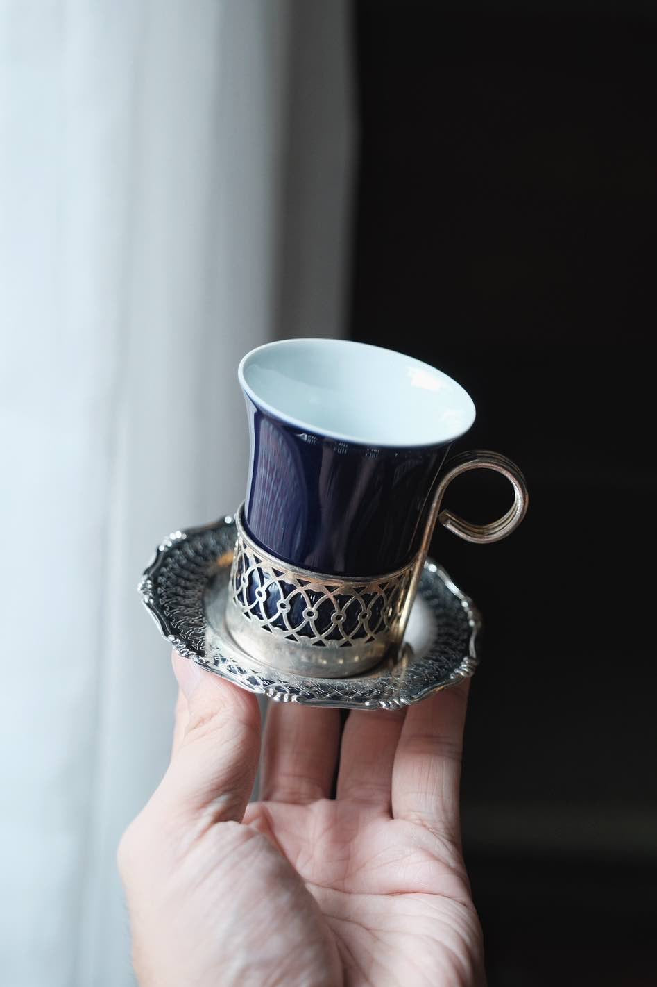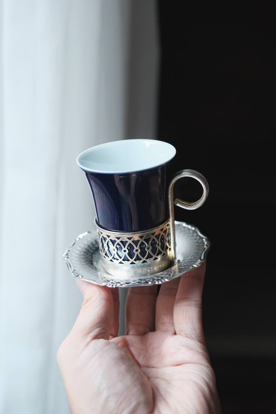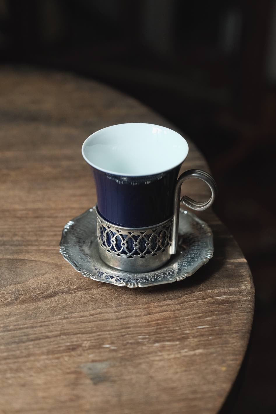 細小精致,鏤空金屬花紋配皇家品藍色,高貴典禮,手把位也有細節花紋,底碟有刻紋整體高雅,陶瓷杯可獨立拆出清潔