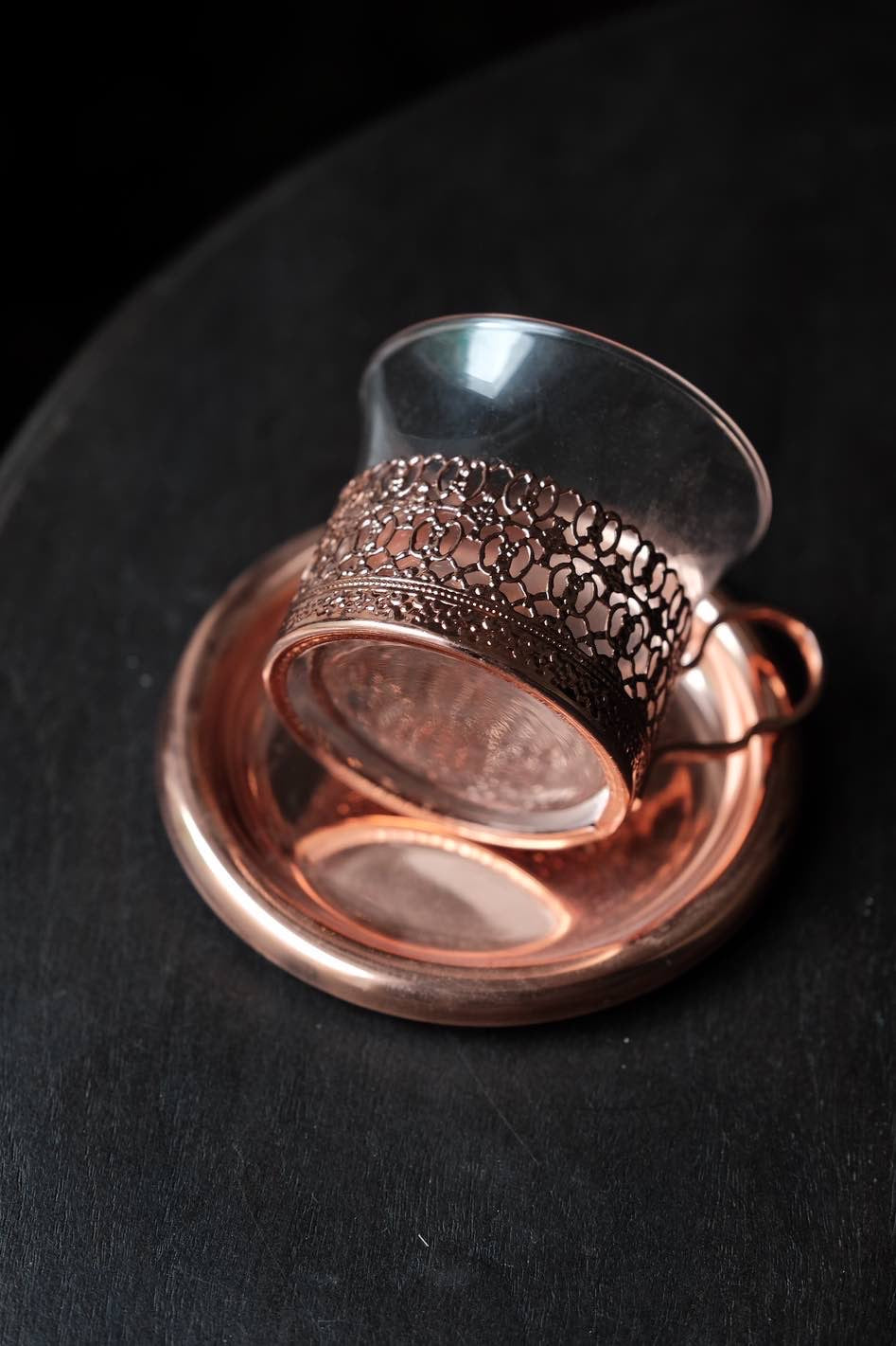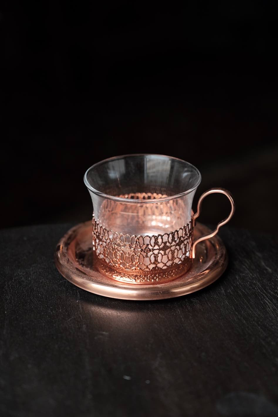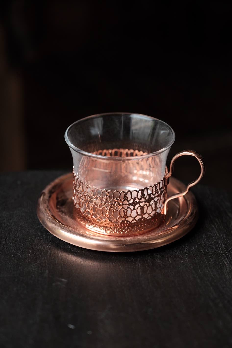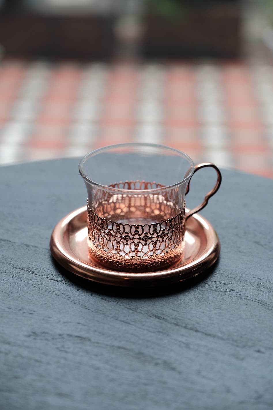 少有紅銅鏤空金屬花紋配玻璃杯,紅銅花型細緻,碟面也有細節刻紋整體高雅,陶瓷杯可獨立拆出清潔