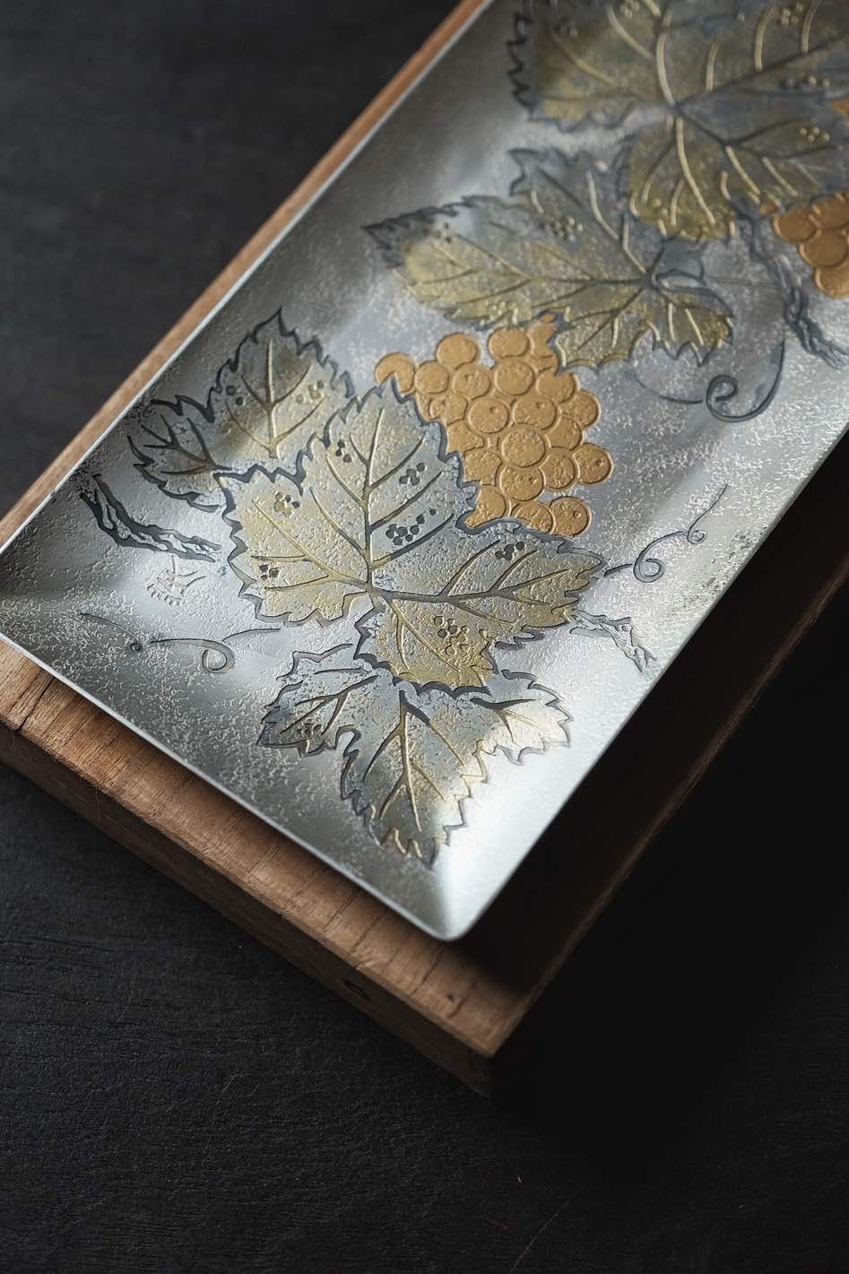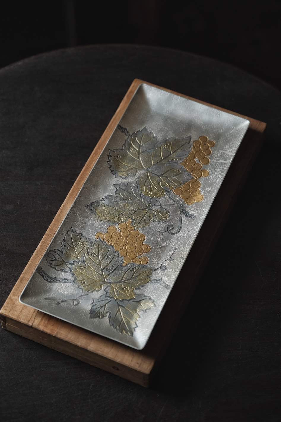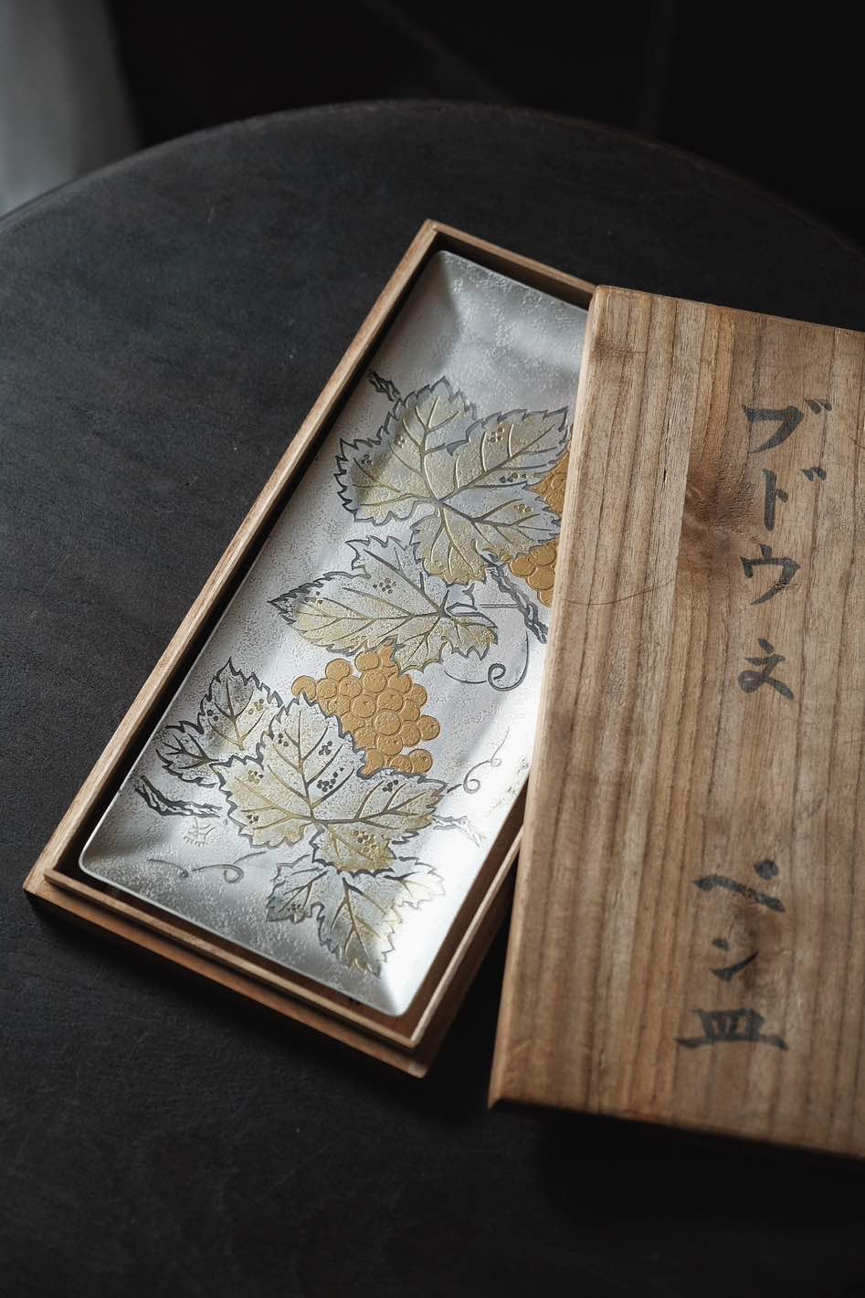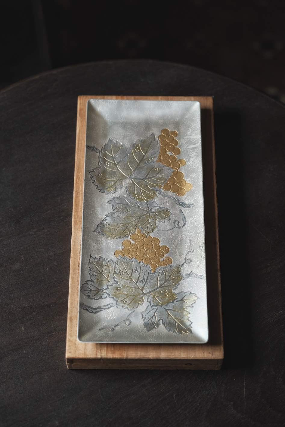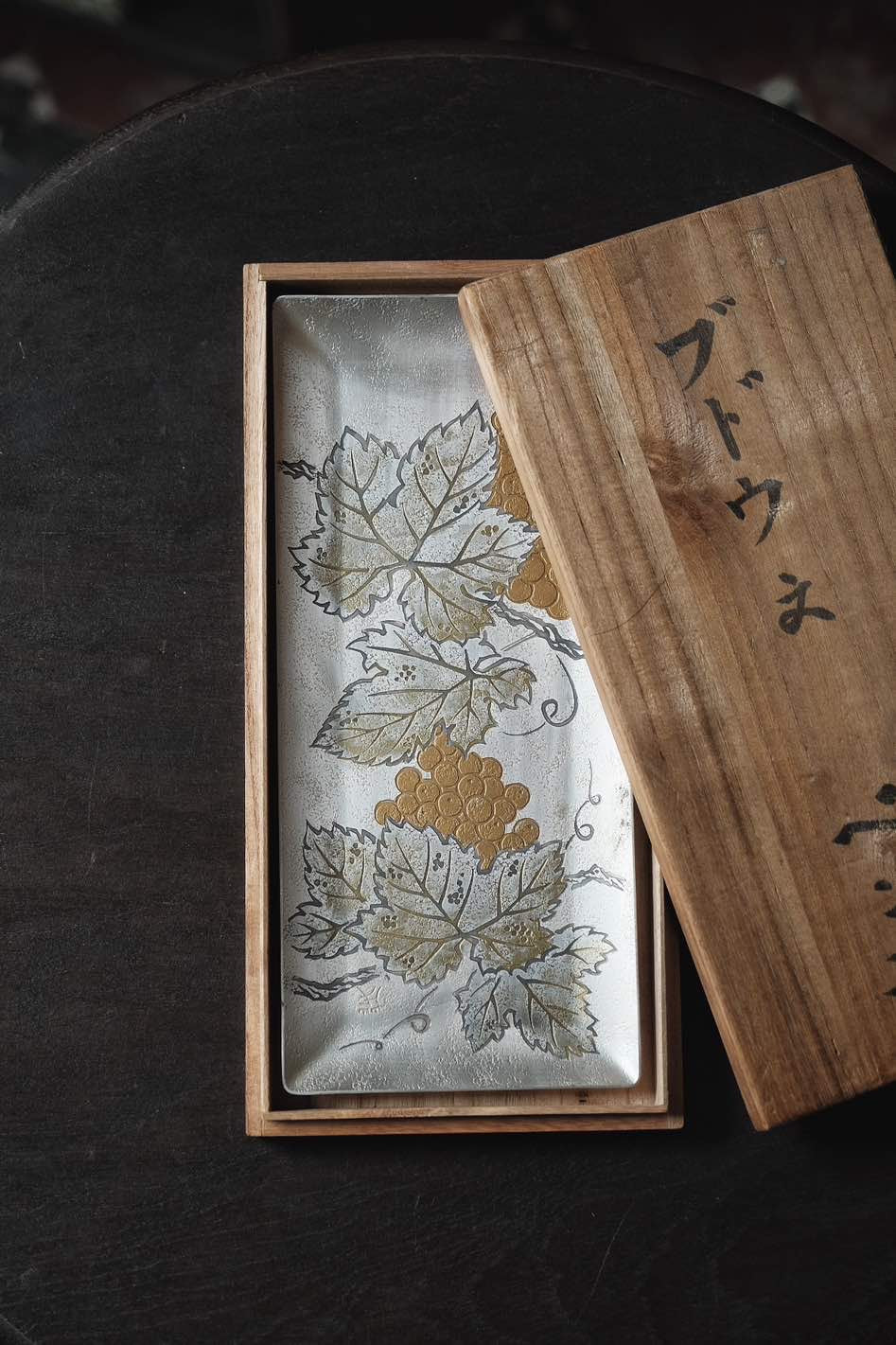 日本製· 葡萄葉紋銀仕上長弁碟連原木盒