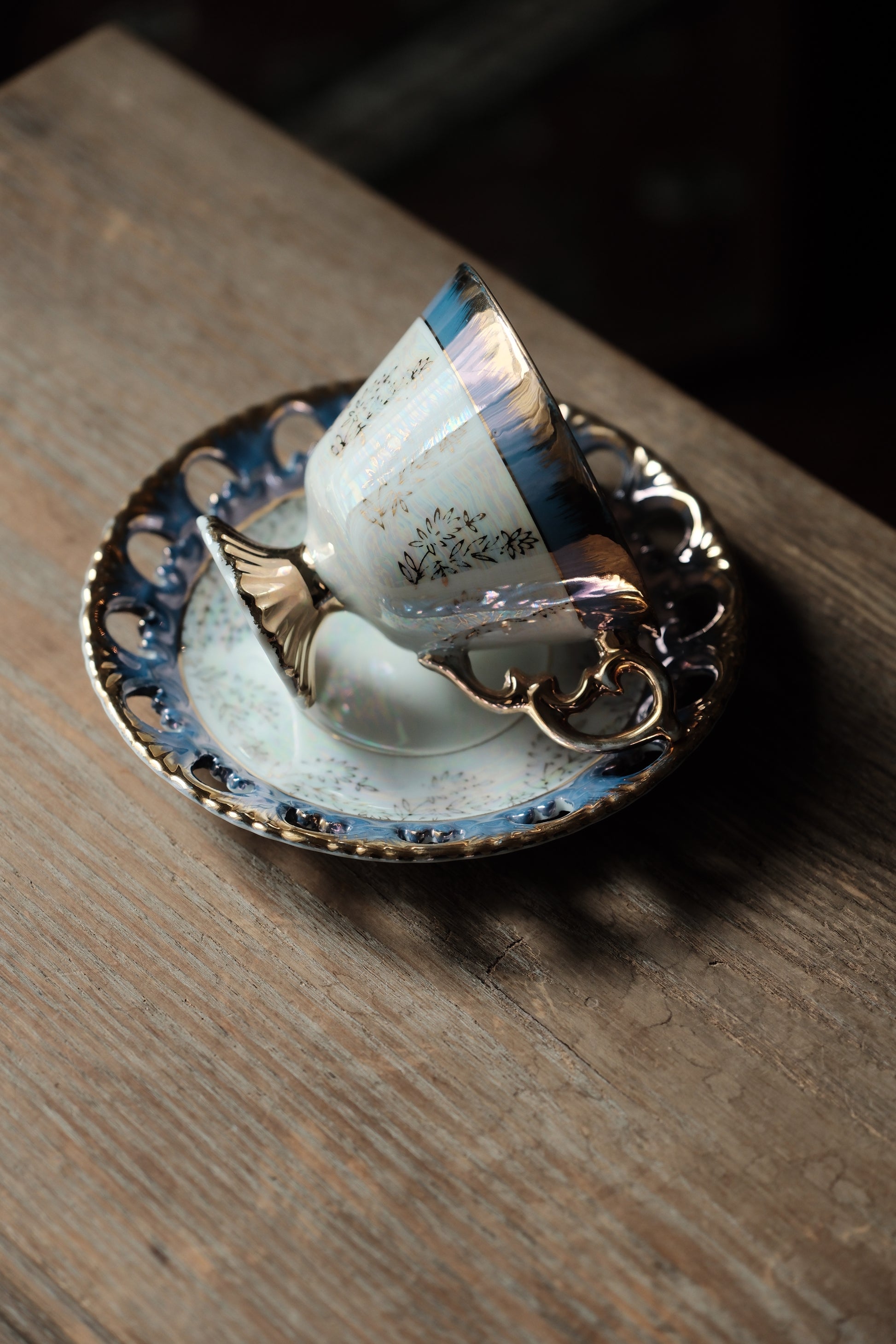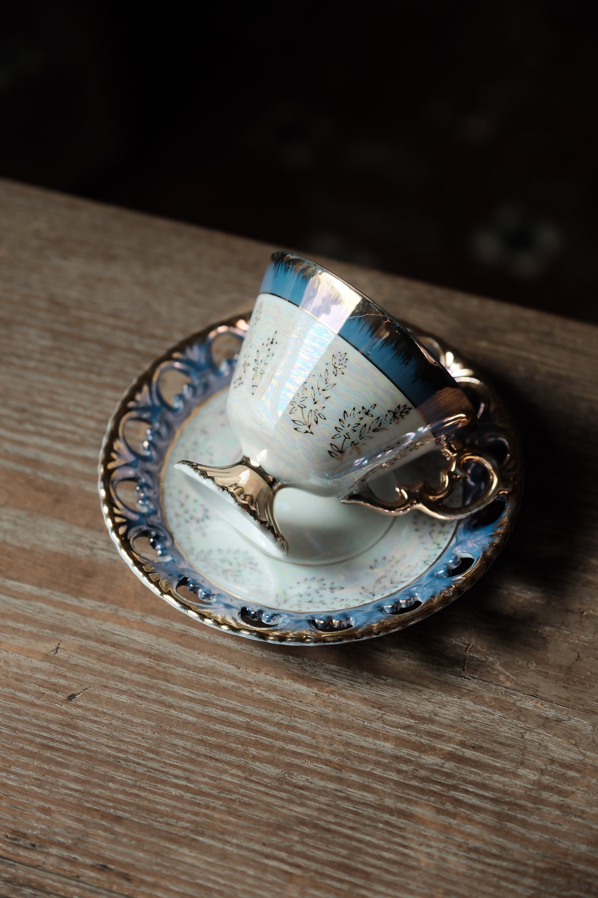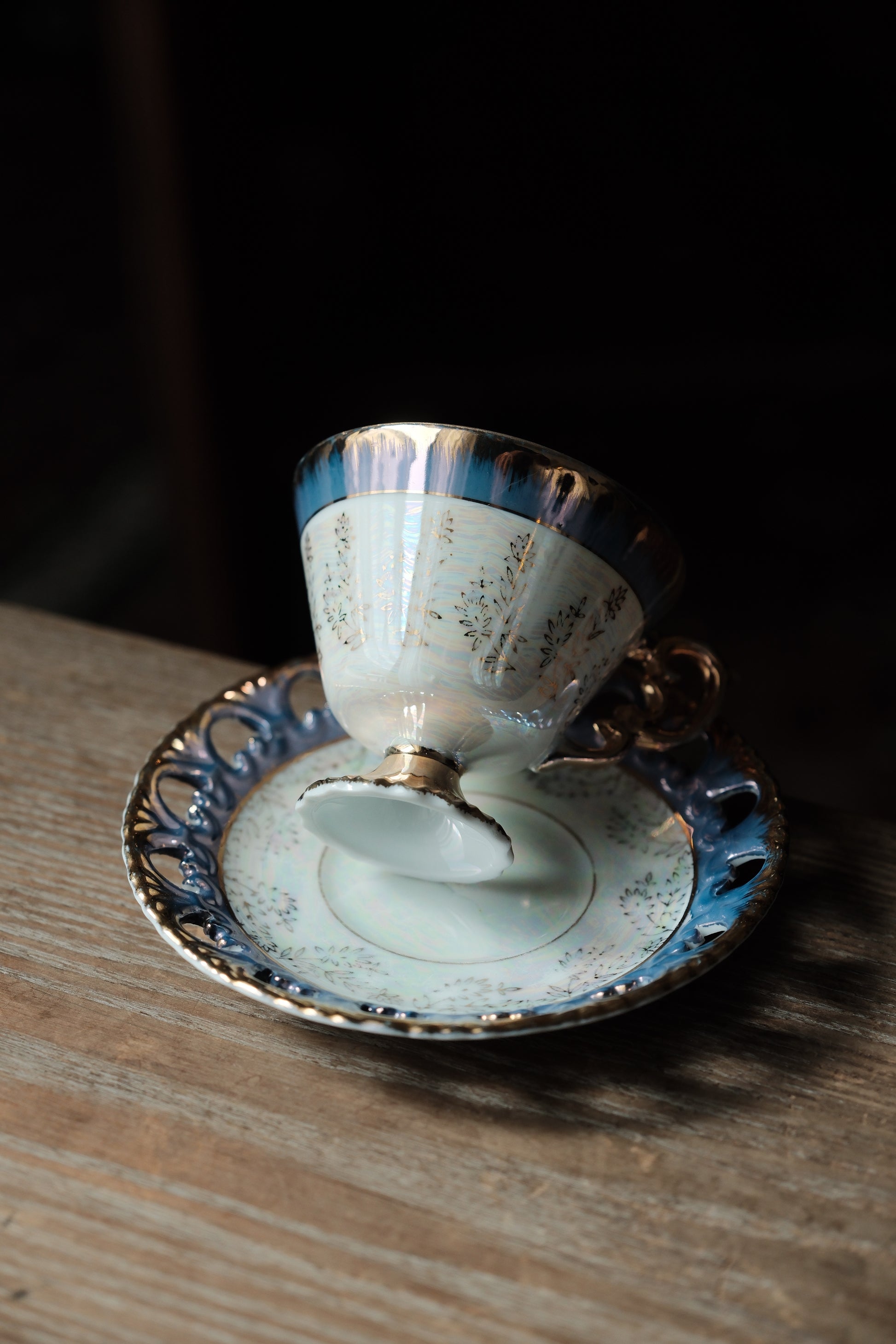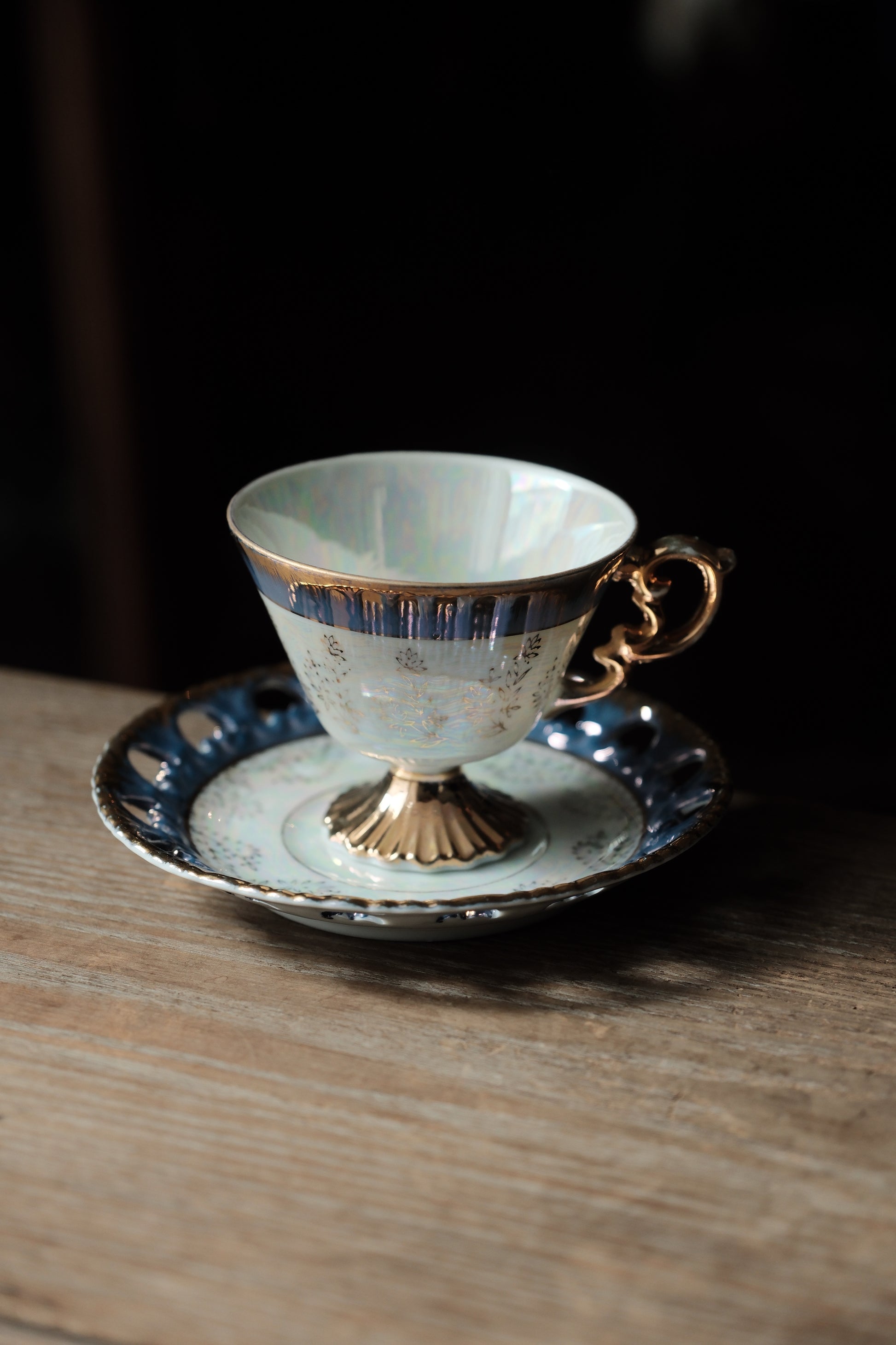 日本製·藍紫間花高足貝殼釉浮雕描金花茶紅茶杯(180ml)
