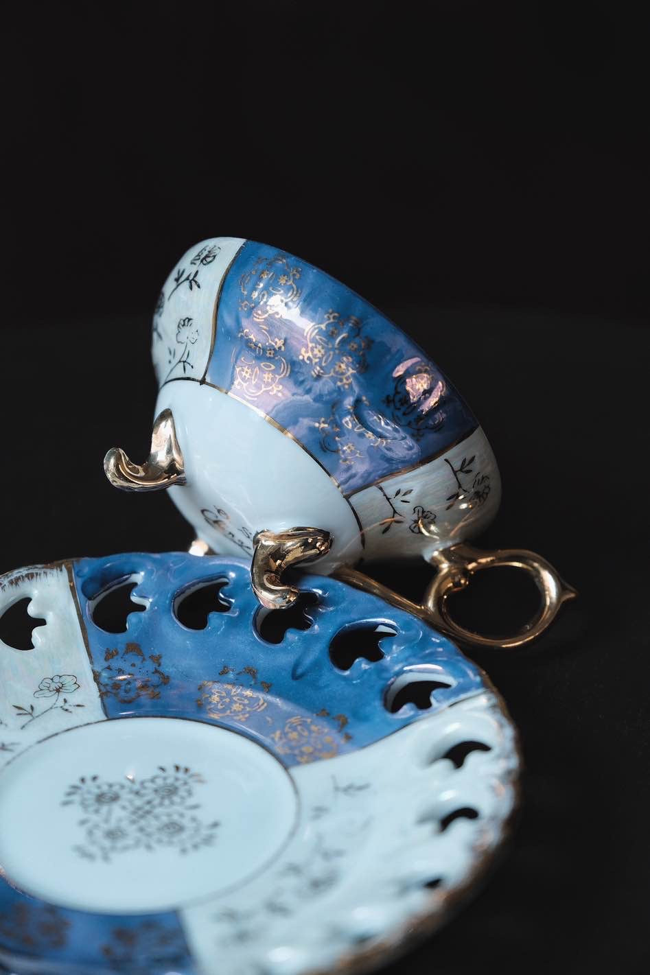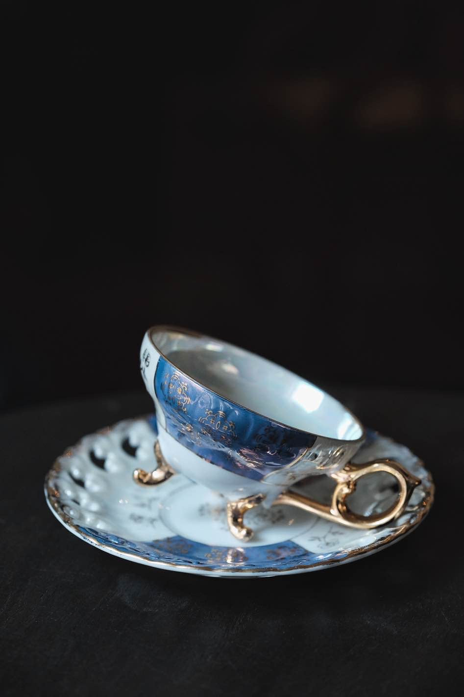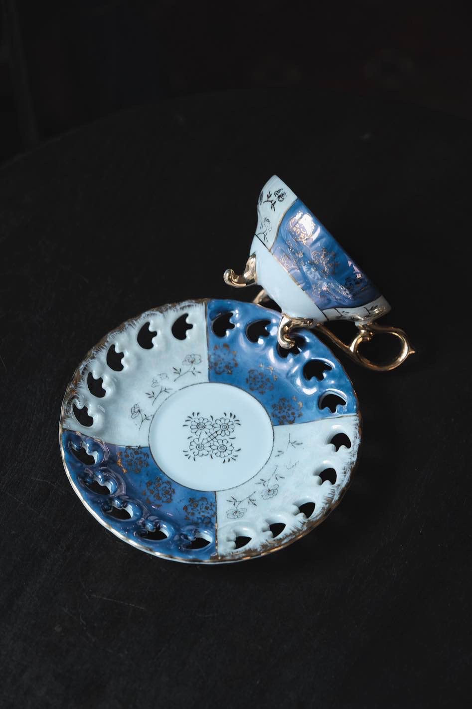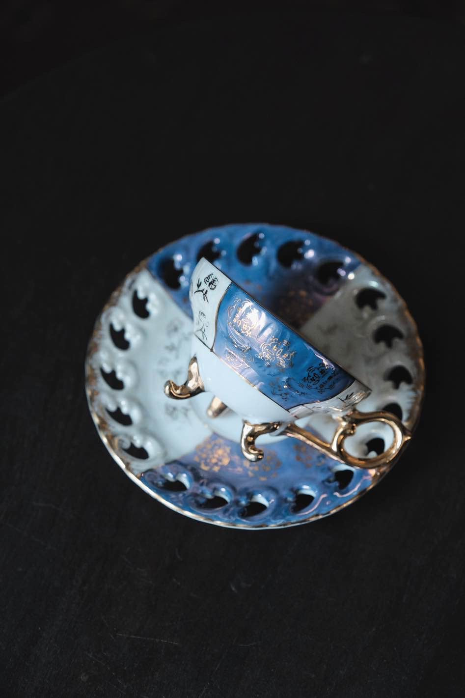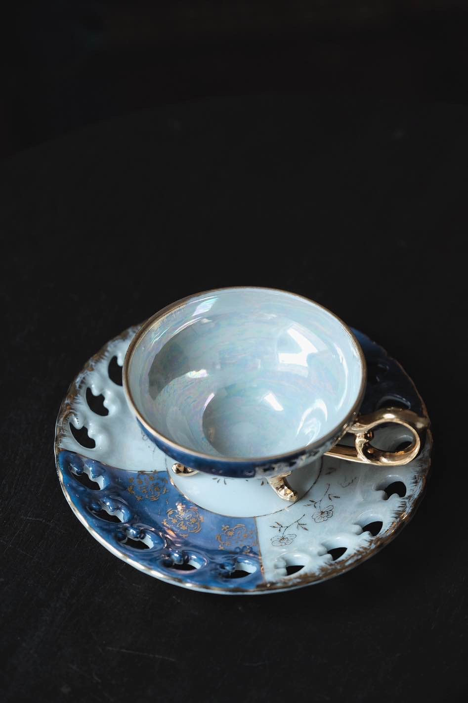 日本製·藍間鏤空三足貝殼釉浮雕描金花茶紅茶杯(140ml)