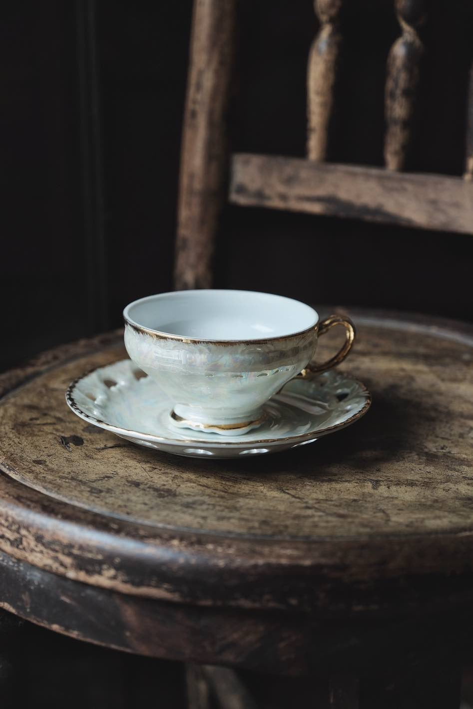 日本製·鏤空貝殼釉浮雕描金杯連碟(160ml)
