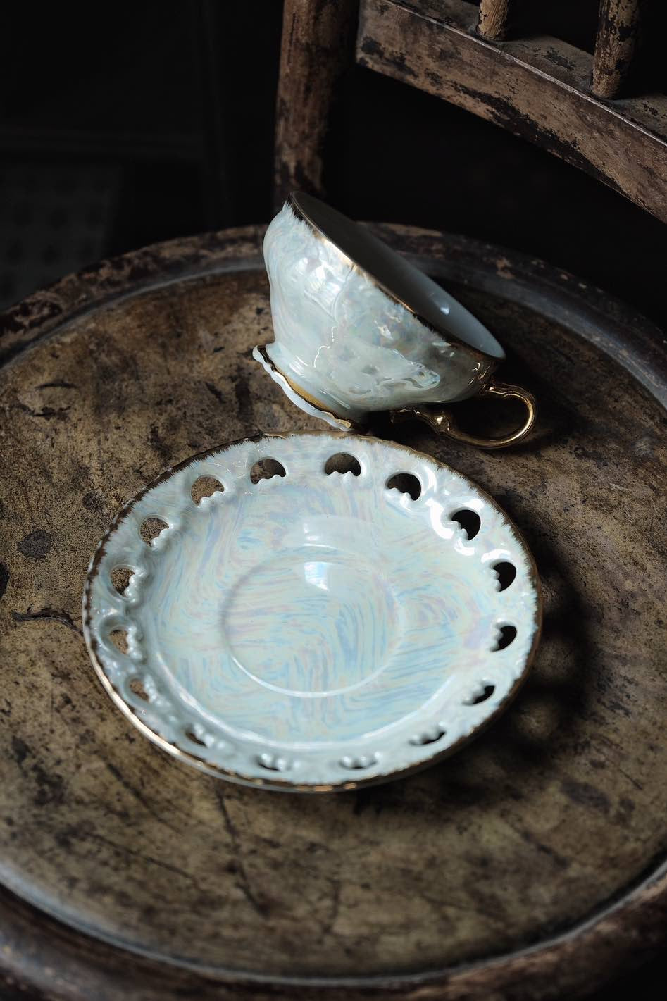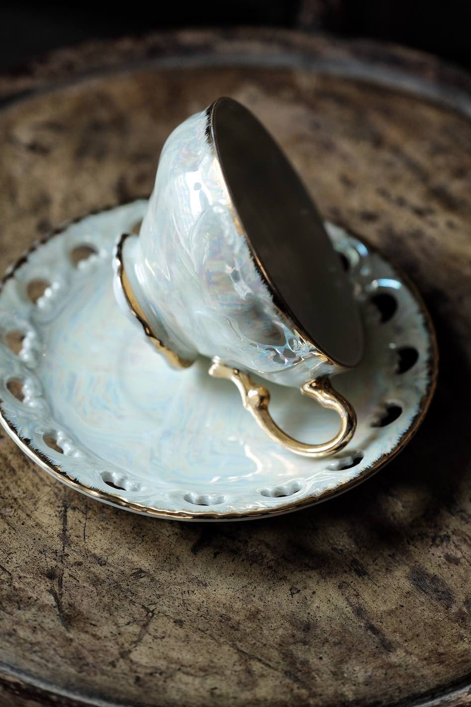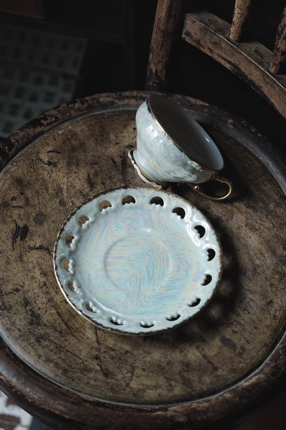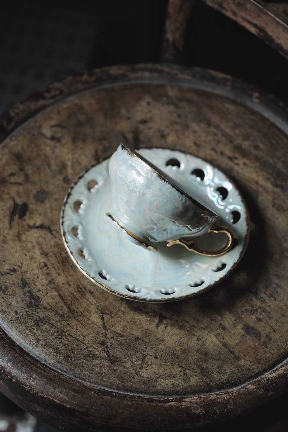 日本製·鏤空貝殼釉浮雕描金杯連碟