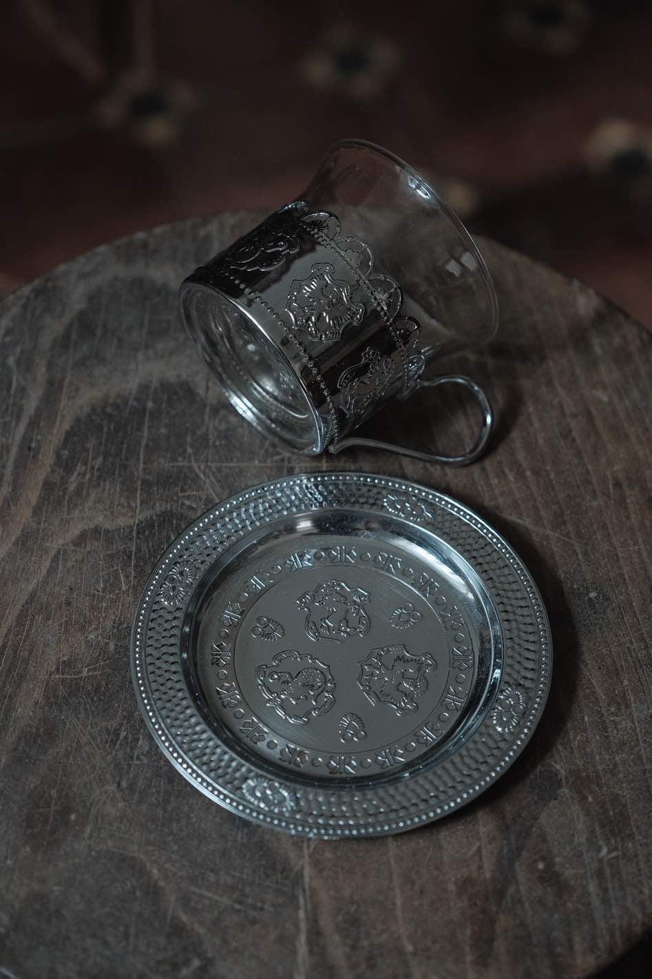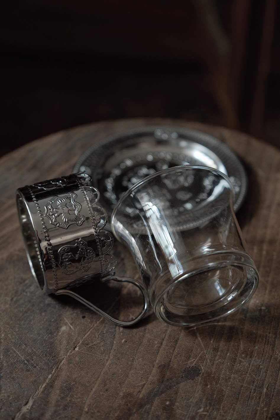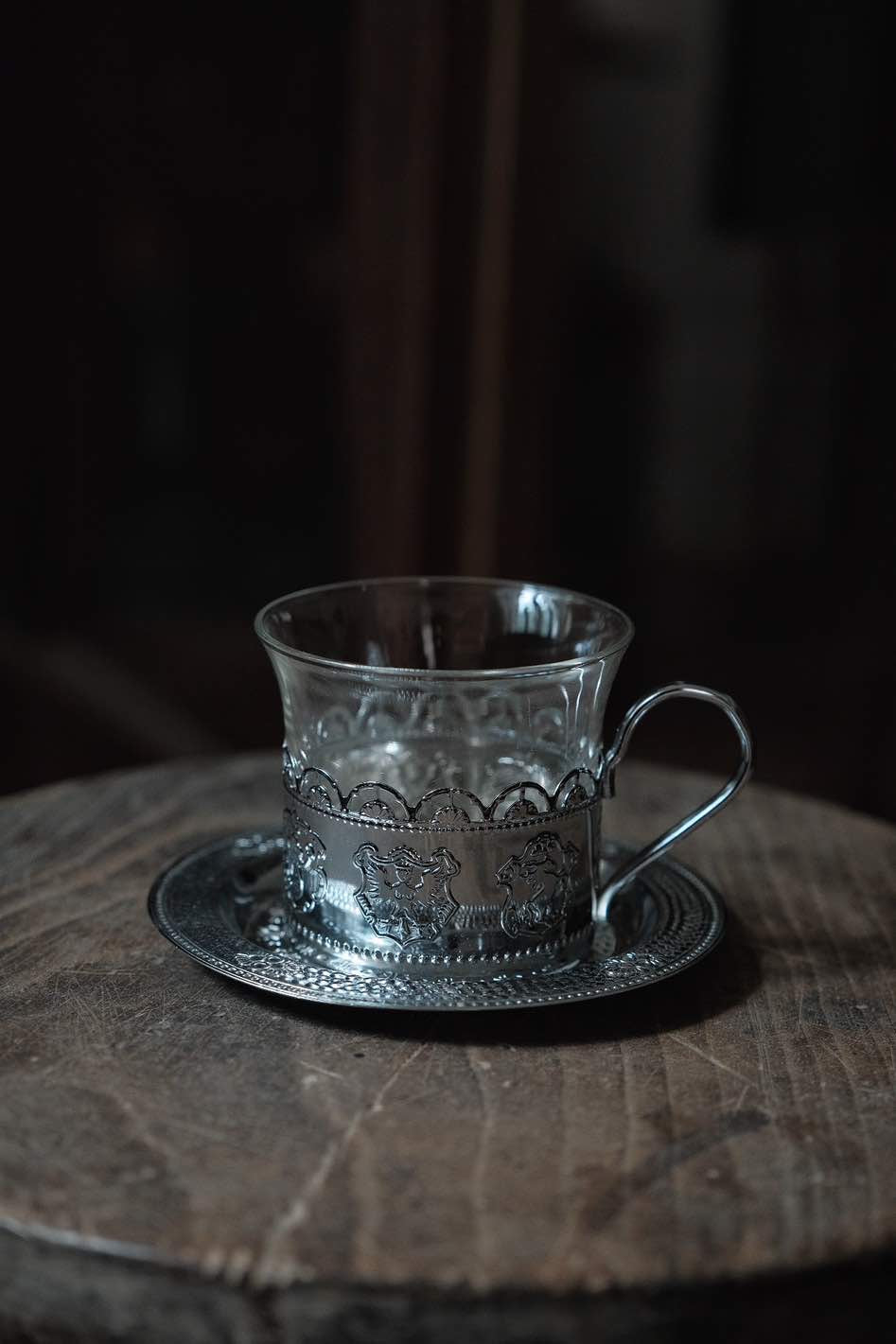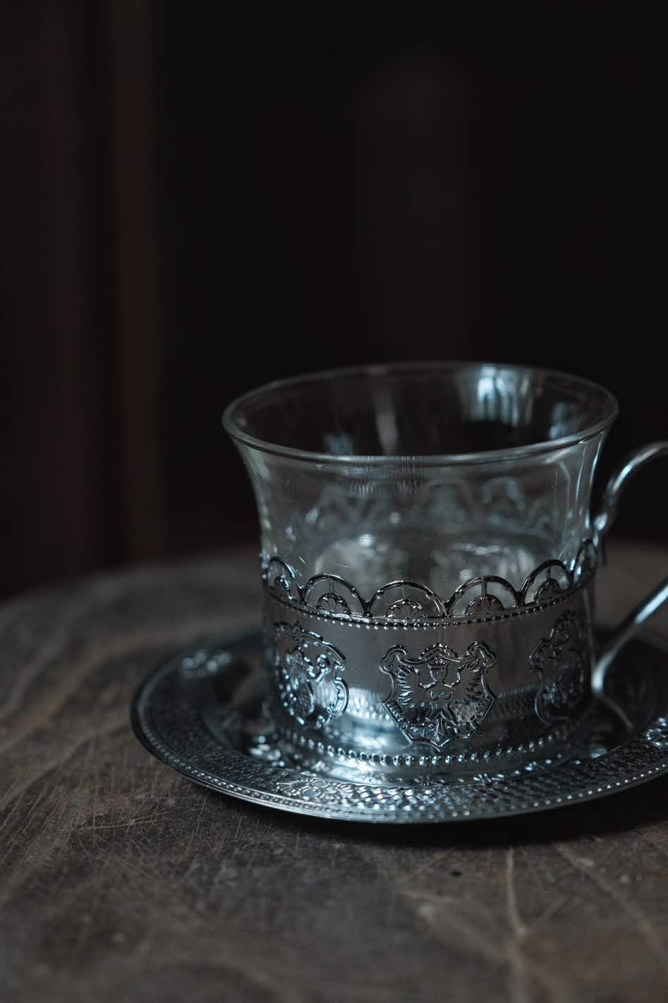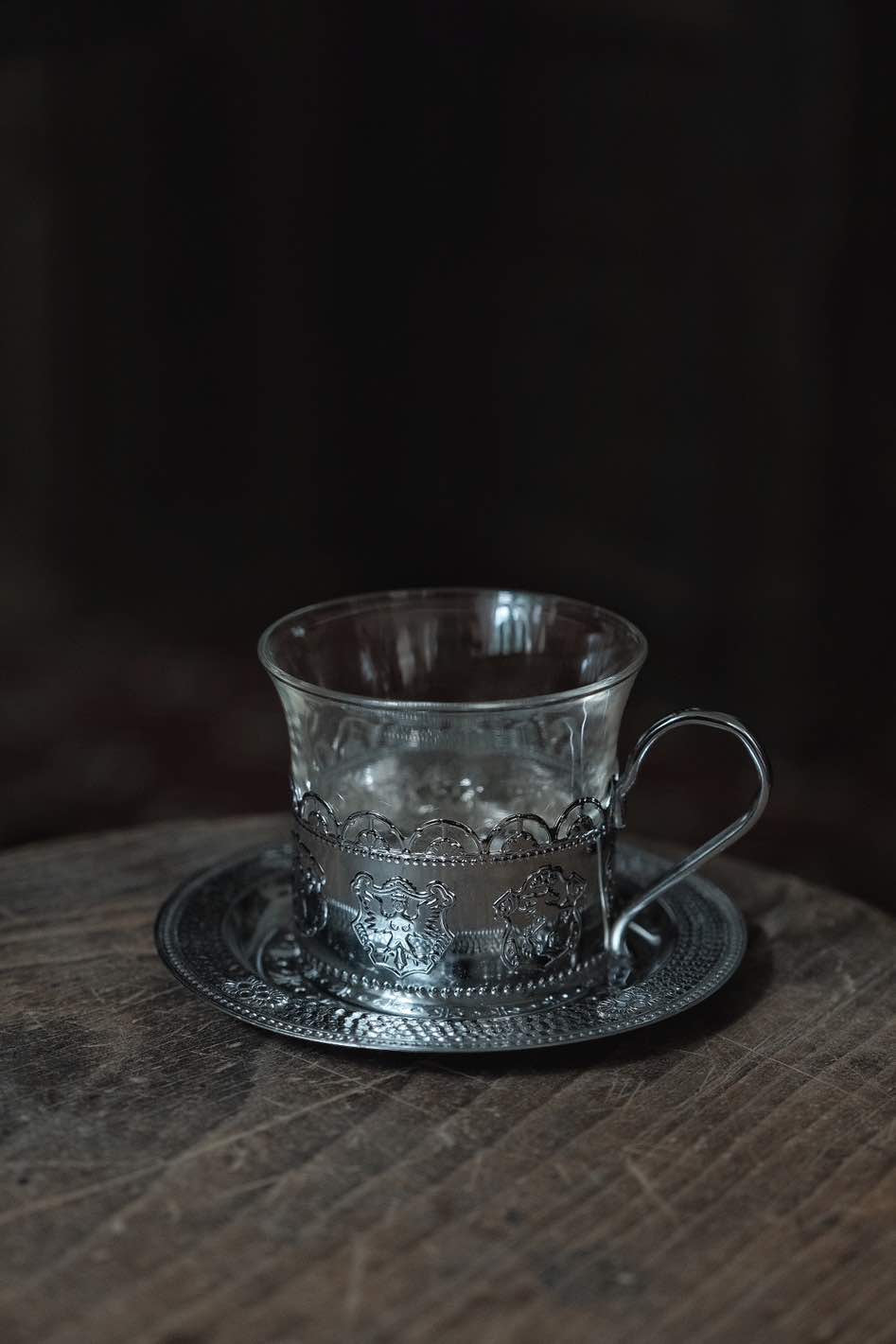 鏤空金屬花紋配透底玻璃,玻璃杯實在有重量,壓紋立體,底碟有刻紋整體高雅,玻璃杯可獨立拆出清潔