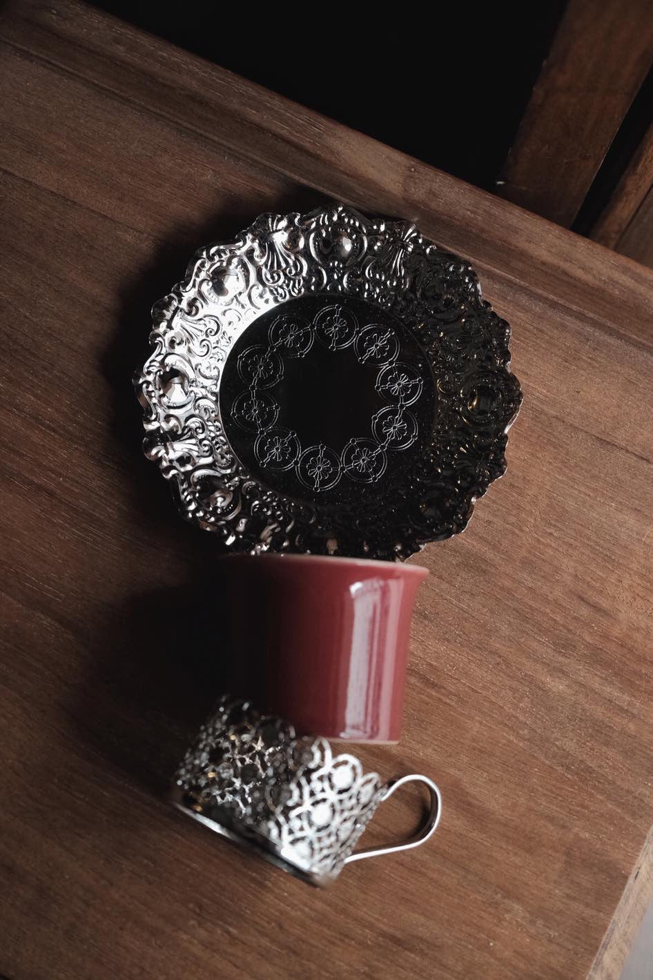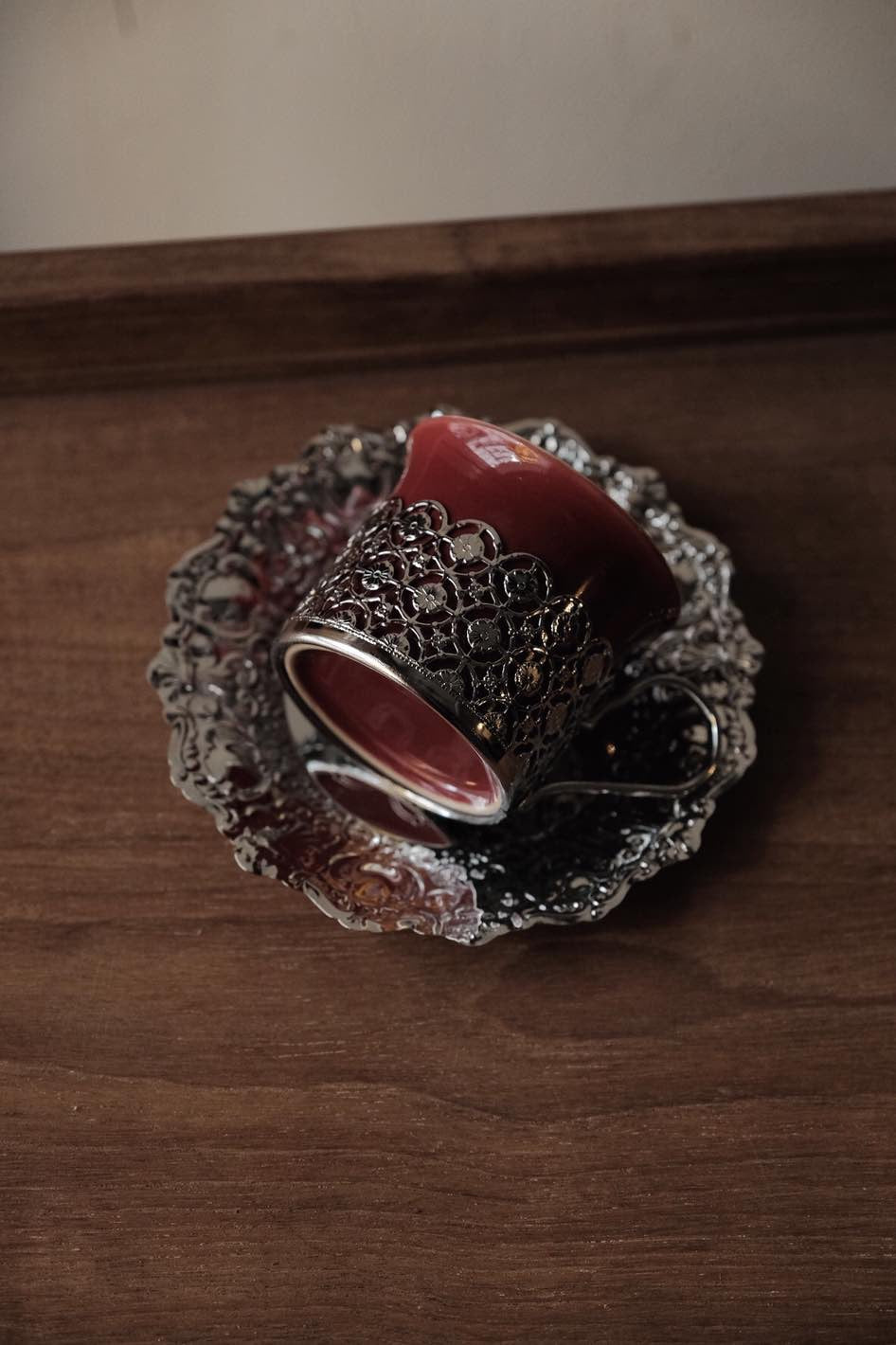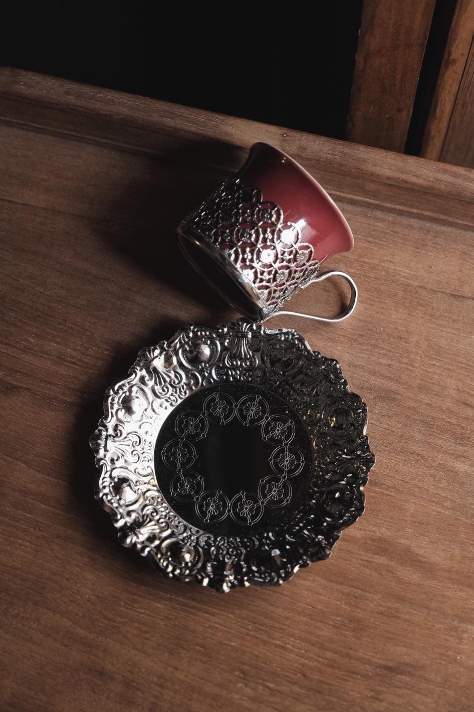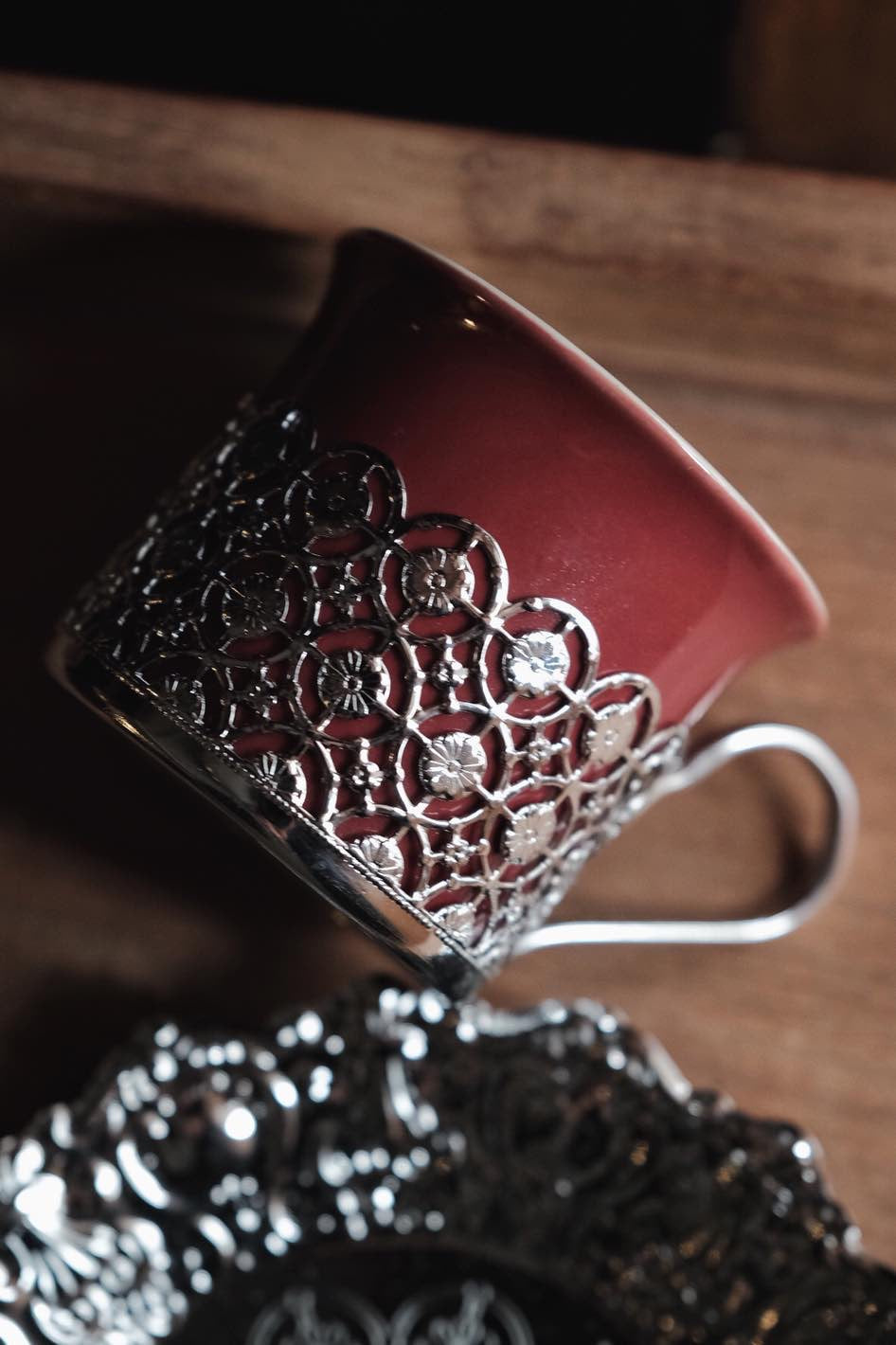鏤空金屬花紋配優雅酒紅色,底碟有刻紋整體高雅,陶瓷杯可獨立拆出清潔,鍍銀表面有氧化痕跡。